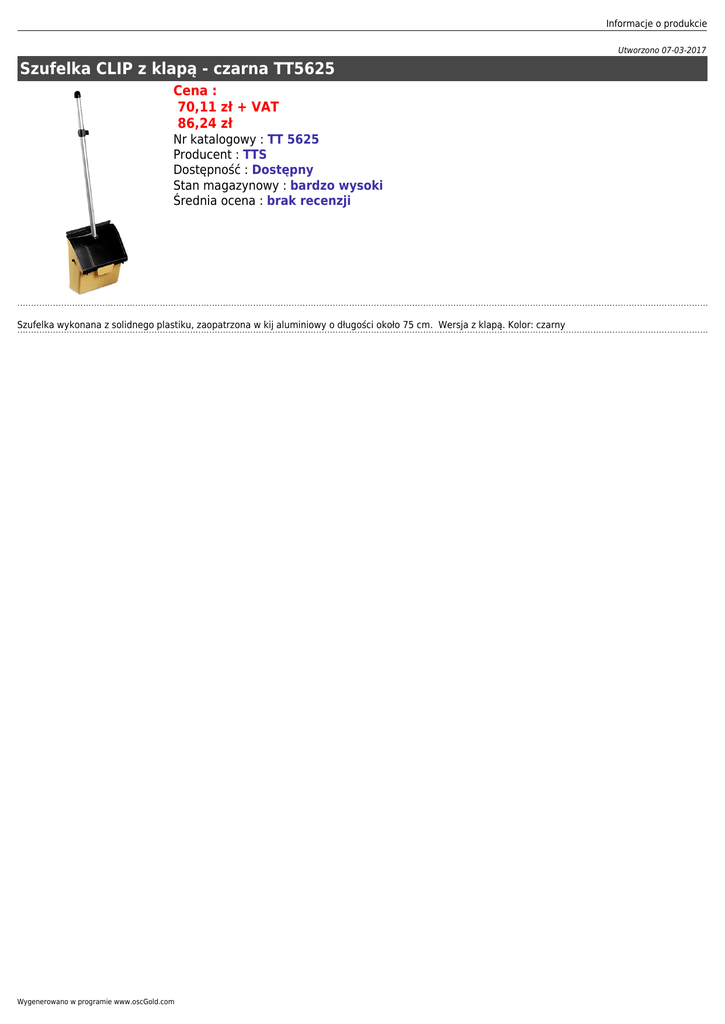 Informacje o produkcie Utworzono 07-03-2017 Szufelka CLIP z klapą - czarna TT5625 Cena : 70,11 zł + VAT 86,24 zł Nr katalogowy : TT 5625 Producent : TTS Dostępność : Dostępny Stan magazynowy : bardzo wysoki Średnia ocena : brak recenzji Szufelka wykonana z solidnego plastiku, zaopatrzona w kij aluminiowy o długości około 75 cm. Wersja z klapą. Kolor: czarny Wygenerowano w programie www.oscGold.com