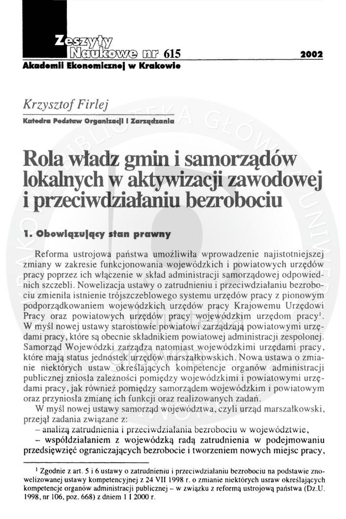 Krzysztof Firlej Kal.d,. ..... ·Iax Or.anlsaclll • brzą"" .• • zawodowej IprzeclW l. Obowlqzulqcy stan prawny Reforma ustrojowa państwa umożliwiła wprowadzenie naji stotniejszej zmiany w zakresie funkcjon owania wojewódzkich i powiatowych urzędów pracy poprzez ich włączenie w sk ład administracji samorządowej odpowiednich szczebli . Nowelizacja ustawy o zatrudnieniu i przeciwdziałaniu bezrobociu zmieniła istnienie trójszczeblowego systemu urzęd ów pracy z pionowym podporządkowaniem wojewódzkich urzędów pracy Krajowemu Urzędowi Pracy oraz powiatowych urzędów pracy wojewódzkim urzędom pracy'. W myśl nowej ustawy starostowie powi atowi zarządzają powiatowymi urzę dami pracy, które są obecnie sk ładnikiem powiatowej administracji zespolonej . Samorząd Wojewódzki zarządza natomiast wojewódzkimi urzęda mi pracy, które mają status jednostek urzędów mars za łkowskich . Nowa ustawa o zmianie niektórych ustaw określających kompetencje organów admini stracji publicznej zniosła zależności pomiędzy wojewódzkimi i powiatowymi urzę dami pracy, jak również pomiędzy samorządem wojewódzkim i powiatowym oraz przyniosła zmianę ich funkcji oraz realizowanych zadań. W myśl nowej ustawy samorząd województwa, czy li urząd marsza łkow ski, przejął zadania związane z: - analizą zatrudnienia i przeciwdziałania bezrobociu w województwie, - współdziałaniem z wojewódzką radą zatrudnienia w podejm owa niu przed sięwzięć ogranic zających bezrobocie i tworzeniem nowych miejsc pracy, Zgodnie z an o5 j 6 ustawy o zatrudnieniu i przeciwdziałaniu bezrobociu na pods tawie znowelizowanej ustawy kompetencyjnej z 24 VII ł 998 r. Ozmianie niektórych llsraw okreś lających kompetencje organów adm inistracji publicznej - w zwiilzku z reformą ustrojową państwa (Dz.U. 1998 . nT 106. poz. 668) z dniem 1 12000 T. I Krzysztof Firle) - planowaniem wydatków i gospodarowaniem środkami finansowymi, - organizowaniem pośrednictwa pracy, usług poradnictwa zawodowego oraz informacji zawodowej, - ustalaniem kryteriów w sprawach zatrudnienia cudzoziemców, - organizowaniem inwestycji infrastrukturalnych w systemie robót publicznych, - organizowaniem programów lokalnych w celu tworzenia nowych miejsc pracy i likwidacji negatywnych skutków bezrobocia. Powiaty realizują następujące zadania zlecone z zakresu administracji rzą dowej: - rejestrowanie bezrobotnych i innych osób poszukujących pracy, - przedstawianie bezrobotnym propozycji zatrudnienia, szkolenia, a w razie braku takich możliwości - wypłacanie uprawnionym zasiłków i innych świad czeń pieniężnych, - przyznawanie i wypłacanie osobom uprawnionym zasiłków i świadczeń przedemerytalnych, - prowadzenie poradnictwa zawodowego, - wydawanie biletów kredytowych osobom skierowanym do pracy poza miejsce stałego zamieszkania, - wydawanie zezwoleń dotyczących zatrudnienia cudzoziemców na podstawie ustalonych kryteriów przez samorząd województwa, - wydawanie decyzji w sprawach: uznania bądź odmowy uznania osoby za bezrobotną oraz utraty statusu osoby bezrobotnej, przyznania, odmowy przyznania, wstrzymania, wznowienia wypłaty, utraty lub pozbawienia prawa do zasiłku, dodatku szkoleniowego, stypendium, zasiłku i świadczenia przedemerytalnego, obowiązku zwrotu nienależnie pobranych świadczeń (zasiłku, dodatku szkoleniowego, stypendium, zasiłku i świadczenia przedemerytalnego oraz kosztów szkolenia), - umorzenie części pożyczki z Funduszu Pracy, refundowanie pracodawcom wynagrodzeń i składek w związku z zatrudnieniem młodocianych pracowników oraz dodatków i premii przysługujących pracownikom jako opiekunom praktyk uczniowskich, - wykonywanie kontroli w zakresie przestrzegania przepisów ustawy (kontrola legalności zatrudnienia). Samorząd powiatowy musi zapewnić pomoc swoim klientom oraz możli wość zbadania potencjalnych szans ich zatrudnienia poprzez: - udzielanie pomocy bezrobotnym i innym osobom poszukującym pracy w jej znalezieniu, - podejmowanie i realizowanie działań zmierzających do ograniczenia bezrobocia i jego negatywnych skutków, - aktywizację lokalnego rynku pracy i pozyskiwanie środków finansowych na realizację zadań z zakresu przeciwdziałania bezrobociu, - tworzenie dodatkowych miejsc pracy i udzielanie pomocy bezrobotnym w podejmowaniu działalności na własny rachunek, Rola wladz i samorządów lokalnych ... - inicjowanie i finansowanie prac interwencyjnych, robót publicznych, zatrudnianie absolwentów, prowadzenie szkoleń, - współdziałanie z wojewódzkimi radami zatrudnienia w zakresie ograniczenia bezrobocia i jego negatywnych skutków, a w szczegółności wykorzystanie środków Funduszu Pracy i PFRON, - wspieranie działalności klubów pracy, - opracowanie analiz, ocen i sprawozdań dotyczących bezrobocia. Nowe funkcje zostały powierzone również wojewodzie, który przyjmuje do realizacji następujące zadania: - kontrolę realizacji zadań z zakresu administracji rządowej, wynikających z przestrzegania przepisów ustawy wykonywanych przez jednostki samorządu terytorialnego, - sprawowanie merytorycznego nadzoru nad usługami świadczonymi przez urzędy pracy oraz odpowiednim poziomem kwalifikacji kadr w urzędach pracy na terenie województwa, - postępowanie administracyjne w sprawach związanych z wykonywaniem zadań i kompetencji w zakresie zatrudniania i przeciwdziałania bezrobociu; jeżeli ustawa nie stanowi inaczej, organem właściwym jest starosta, organem wyższego stopnia zaś jest wojewoda. Jak wynika z powyższego zestawienia, najważniejsze zmiany z punktu widzenia bezrobotnych to przekazanie do powiatowych urzędów pracy zadań realizowanych dotychczas przez wojewódzki urząd pracy w zakresie kontroli legalności zatrudnienia, obsługi wpłat na Fundusz Pracy z tytułu pracy za granicą oraz wydawanie zaświadczeń o zaliczeniu tego okresu do uprawnień pracowniczych. Zmianą jest równ