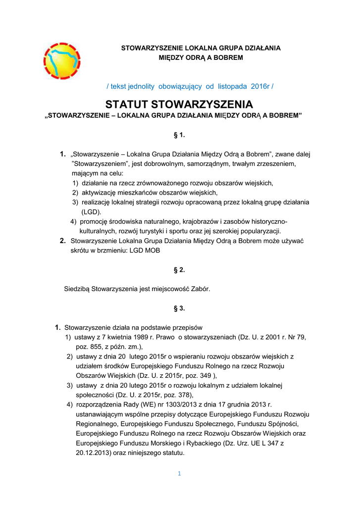 STOWARZYSZENIE LOKALNA GRUPA DZIAŁANIA MIĘDZY ODRĄ A BOBREM / tekst jednolity obowiązujący od listopada 2016r / STATUT STOWARZYSZENIA „STOWARZYSZENIE – LOKALNA GRUPA DZIAŁANIA MIĘDZY ODRĄ A BOBREM” § 1. 1. „Stowarzyszenie – Lokalna Grupa Działania Między Odrą a Bobrem”, zwane dalej ”Stowarzyszeniem”, jest dobrowolnym, samorządnym, trwałym zrzeszeniem, mającym na celu: 1) działanie na rzecz zrównoważonego rozwoju obszarów wiejskich, 2) aktywizację mieszkańców obszarów wiejskich, 3) realizację lokalnej strategii rozwoju opracowaną przez lokalną grupę działania (LGD). 4) promocję środowiska naturalnego, krajobrazów i zasobów historycznokulturalnych, rozwój turystyki i sportu oraz jej szerokiej popularyzacji. 2. Stowarzyszenie Lokalna Grupa Działania Między Odrą a Bobrem może używać skrótu w brzmieniu: LGD MOB § 2. Siedzibą Stowarzyszenia jest miejscowość Zabór. § 3. 1. Stowarzyszenie działa na podstawie przepisów 1) ustawy z 7 kwietnia 1989 r. Prawo o stowarzyszeniach (Dz. U. z 2001 r. Nr 79, poz. 855, z późn. zm.), 2) ustawy z dnia 20 lutego 2015r o wspieraniu rozwoju obszarów wiejskich z udziałem środków Europejskiego Funduszu Rolnego na rzecz Rozwoju Obszarów Wiejskich (Dz. U. z 2015r, poz. 349 ), 3) ustawy z dnia 20 lutego 2015r o rozwoju lokalnym z udziałem lokalnej społeczności (Dz. U. z 2015r, poz. 378), 4) rozporządzenia Rady (WE) nr 1303/2013 z dnia 17 grudnia 2013 r. ustanawiającym wspólne przepisy dotyczące Europejskiego Funduszu Rozwoju Regionalnego, Europejskiego Funduszu Społecznego, Funduszu Spójności, Europejskiego Funduszu Rolnego na rzecz Rozwoju Obszarów Wiejskich oraz Europejskiego Funduszu Morskiego i Rybackiego (Dz. Urz. UE L 347 z 20.12.2013) oraz niniejszego statutu. 1 2. Nadzór nad Stowarzyszeniem pełni Marszałek Województwa Lubuskiego. § 4. Stowarzyszenie może być członkiem krajowych i międzynarodowych organizacji o podobnym celu działania. § 5. Stowarzyszenie swoim działaniem obejmuje obszar Rzeczpospolitej Polskiej, a w szczególności obszar objęty LSR oraz może realizować swoje cele statutowe na terenie innych państw z poszanowaniem tamtejszego prawa. § 6. Czas trwania Stowarzyszenia jest nieograniczony. § 7. 1. Stowarzyszenie realizuje swoje cele poprzez: 1) budowanie kapitału społecznego na wsi, 2) polepszanie zarządzania lokalnymi zasobami i ich waloryzację, 3) tworzenie i wdrażanie lokalnej strategii rozwoju, 4) inne przedsięwzięcia służące rozwojowi obszarów wiejskich. 2. Stowarzyszenie realizując cele statutowe opiera się na pracy społecznej członków i zatrudnionych pracowników. § 8. 1. Zarząd Stowarzyszenia do realizacji celów statutowych powołuje biuro. 2. Strukturę biura określa regulamin organizacyjny zatwierdzony przez Zarząd Stowarzyszenia. 3. Biuro Stowarzyszenia kieruje pracami organizacyjnymi i przygotowawczymi. § 9. 1. Stowarzyszenie posiada członków: 1) Zwyczajnych, 2) Wspierających. 2, Członkiem zwyczajnym Stowarzyszenia mogą być osoby fizyczne, osoby prawne w tym jednostki samorządu terytorialnego, które złożą deklarację członkowską i zostaną uchwałą Zarządu przyjęte w poczet członków. 2 3. Członkiem wspierającym może zostać osoba fizyczna lub prawna deklarująca pomoc finansową lub merytoryczną w realizacji celów Stowarzyszenia. Członkiem wspierającym staje się po złożeniu pisemnej deklaracji i przyjęciu na podstawie uchwały Zarządu. 4. Członkowie wspierający nie posiadają biernego oraz czynnego prawa wyborczego, mogą brać udział w Walnym Zebraniu Członków jedynie z głosem doradczym. § 10. Nabycie i utrata członkostwa następuje w drodze uchwały Zarządu Stowarzyszenia przyjętej zwykłą większością głosów. § 11. 1. Członkowie Stowarzyszenia zobowiązani są: 1) propagować cele Stowarzyszenia i aktywnie uczestniczyć w ich realizacji, 2) przestrzegać postanowień Statutu, 3) opłacać składki członkowskie, 4) brać udział w Walnym Zebraniu Członków. 2. Członkowie mają prawo: 1) wybierać i być wybieranym do władz Stowarzyszenia, 2) składać Zarządowi Stowarzyszenia wnioski dotyczące działalności Stowarzyszenia, 3) brać udział w organizowanych przez Stowarzyszenie przedsięwzięciach o charakterze informacyjnym, szkoleniowym lub kulturalnym. § 12. Skreślenie z listy członków Stowarzyszenia następuje z powodu: 1) pisemnej rezygnacji złożonej Zarządowi, 2) wykluczenia przez Zarząd, 3) działalności niezgodnej ze Statutem lub uchwałą władz Stowarzyszenia, 4) pozbawienia praw publicznych w wyniku prawomocnego orzeczenia sądu, 5) co najmniej rocznego opóźnienia w opłacaniu składek członkowskich, 6) śmierci osoby fizycznej lub likwidacji osoby prawnej. 3 § 13. Od uchwał Zarządu Stowarzyszenia w przedmiocie wykluczenia członków Stowarzyszenia przysługuje odwołanie do Walnego Zebrania Członków w terminie 14 dni od dnia doręczenia uchwały Zarządu o wykluczeniu. Uchwała Walnego Zebrania jest ostateczna i jest podejmowana na najbliższym Walnym Zebraniu, chyba że dotrzymanie tego warunku jest niemożliwe. § 14. 1. Władzami Stowarzyszenia są: 1) Walne Zebranie Członków, 2) Zarząd, 3) Rada, 4) Komisja Rewizyjna. 2. Nie można być jednocześnie członkiem Zarządu, Komisji Rewizyjnej i Rady. 3. Kadencja Zarządu, Rady i Komisji Rewizyjnej trwa 4 lata. § 15. 1. Rozstrzygnięcia władz Stowarzyszenia zapadają w formie uchwał zwykłą większością głosów z zastrzeżeniem § 16 ust. 8 przy obecności co najmniej połowy członków uprawnionych do głosowania. 2. W przypadku braku rozstrzygnięcia Zarządu, Komisji Rewizyjnej oraz Rady decyduje głos Przewodniczącego. 3. Każdemu członkowi Stowarzyszenia uprawnionemu do głosowania przysługuje jeden głos. § 16. 1. Najwyższą władzą Stowarzyszenia jest Walne Zebranie Członków. Walne Zebranie Członków może być zwyczajne lub nadzwyczajne. 2. Walne Zebranie C