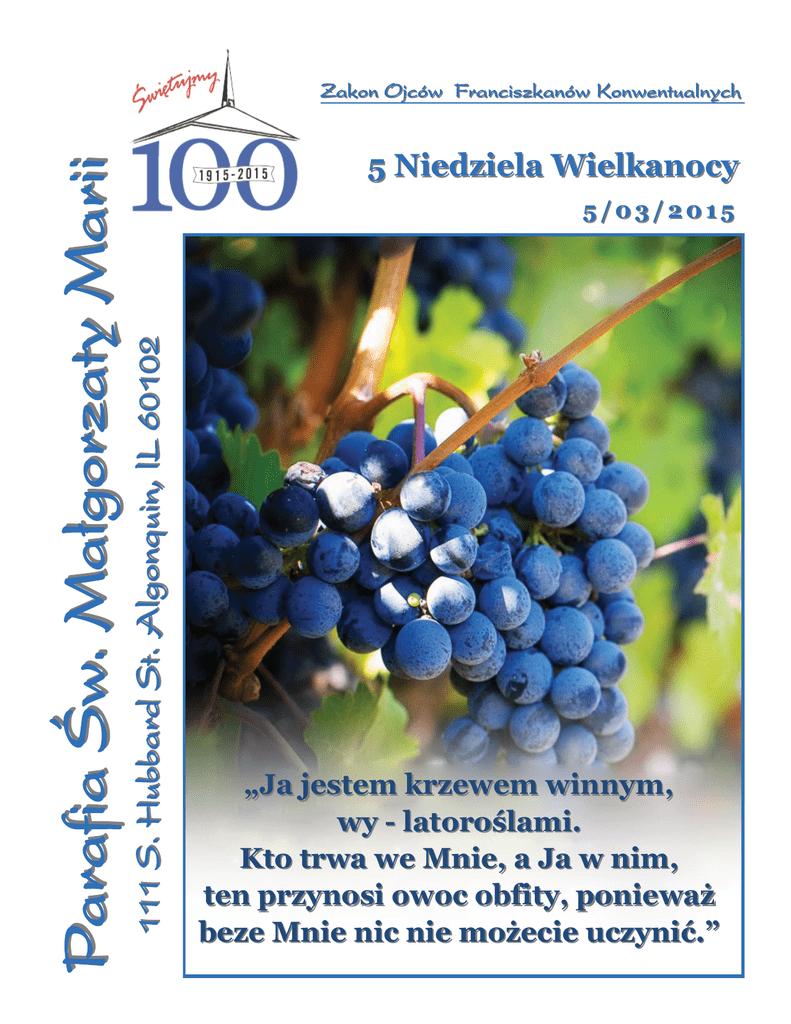 5 Niedziela Wielkanocy 5/03/2015 111 S. Hubbard St. Algonquin, lL 60102 Parafia Św. Małgorzaty Marii Zakon Ojców Franciszkanów Konwentualnych „Ja jestem krzewem winnym, wy - latoroślami. Kto trwa we Mnie, a Ja w nim, ten przynosi owoc obfity, ponieważ beze Mnie nic nie możecie uczynić.” OD PROBOSZCZA „Ja jestem krzewem winnym, wy - latoroślami. Kto trwa we Mnie, a Ja w nim, ten przynosi owoc obfity, ponieważ beze Mnie nic nie możecie uczynić.” Drodzy Przyjaciele! Pewien człowiek znalazł jajko orła. Zabrał je i włożył do gniazda kurzego w zagrodzie. Orzełek wylągł się ze stadem kurcząt i wyrósł wraz z nimi. Orzeł przez całe życie zachowywał się jak kury z podwórka, myśląc, że jest podwórkowym kogutem. Drapał w ziemi szukając glist i robaków. Piał i gdakał. Potrafił nawet trzepotać skrzydłami, fruwać kilka metrów w powietrzu. No bo przecież, czyż nie tak właśnie fruwają koguty? Minęły lata i orzeł zestarzał się. Pewnego dnia zauważył wysoko nad sobą, na czystym niebie wspaniałego ptaka. Szybował elegancko i majestatycznie wśród prądów powietrza, lekko poruszając potężnymi, złocistymi skrzydłami. Stary orzeł patrzył w górę oszołomiony. - Co to jest? - zapytał kurę stojącą obok. - To jest orzeł, król ptaków - odrzekła kura. - Ale nie myśl o tym, ty i ja jesteśmy inni niż on. Tak więc orzeł więcej o tym nie myślał. I umarł, wierząc, że jest kogutem w zagrodzie. Słowa Ewangelii wg św. Jana 15, 1-8 Jezus powiedział do swoich uczniów: „Ja jestem prawdziwym krzewem winnym, a Ojciec mój jest tym, który uprawia. Każdą latorośl, która we Mnie nie przynosi owocu, odcina, a każdą, która przynosi owoc, oczyszcza, aby przynosiła owoc obfitszy. Wy już jesteście czyści dzięki słowu, które wypowiedziałem do was. Trwajcie we Mnie, a Ja w was trwać będę. Podobnie jak latorośl nie może przynosić owocu sama z siebie, o ile nie trwa w winnym krzewie, tak samo i wy, jeżeli we Mnie trwać nie będziecie. Ja jestem krzewem winnym, wy - latoroślami. Kto trwa we Mnie, a Ja w nim, ten przynosi owoc obfity, ponieważ beze Mnie nic nie możecie uczynić. Ten, kto we Mnie nie trwa, zostanie wyrzucony jak winna latorośl i uschnie. I zbiera się ją, i wrzuca do ognia, i płonie. Jeżeli we Mnie trwać będziecie, a słowa moje w was, poprosicie, o cokolwiek chcecie, a to wam się spełni. Ojciec mój przez to dozna chwały, że owoc obfity przyniesiecie i staniecie się moimi uczniami”. Bardzo ważne jest dla nas wszystkich, abyśmy wiedzieli kim naprawdę jesteśmy. Mówiąc o wierze, powinniśmy wiedzieć, że jesteśmy zakorzenieni w Chrystusie przez Chrzest św. Z Jego łaską i pomocą, zdolni jesteśmy do czynienia najpiękniejszych rzeczy na świecie, którymi są: miłość, służba i przebaczenie. Orzeł z dzisiejszej przypowieści nie znał swojego prawdziwego pochodzenia. Wyrósł w zagrodzie razem z kurami, dlatego myślał, że jest tylko podwórkowym kogutem. Kiedy zobaczył orła szybującego wysoko po niebie, podziwiał go, i wciąż wierzył, że on sam jest tylko kogutem podwórkowym, i nie może być jak ten wspaniały orzeł. Może gdyby chciał posłuchać własnego serca, a nie słów kur, odkryłby, że jest orłem. Łatwo sami siebie możemy odnaleźć w tej historyjce. Wielokrotnie słyszymy od innych, że powinniśmy wieść życie spokojne, wygodne według zasad obecnego świata i będziemy w porządku, bo kto tak naprawdę wie co jest po drugiej stronie? Ale Jezus mówi: „Ja jestem krzewem winnym, wy - latoroślami”. Powinniśmy być złączeni z Nim i to właśnie jest nasza prawdziwa tożsamość. Przez Jezusa, również jesteśmy połączeni z naszymi braćmi i siostrami w Chrystusie i dlatego powinniśmy nawzajem sobie pomóc zrozumieć nasze prawdziwe powołanie. Boża łaska może uczynić z nas wspaniałe orły, szybujące wysoko przez życie i przypominające innym, że też są orłami. Naszym celem jest żyć z Bogiem na zawsze. W zeszły weekend prezentowaliśmy Apel Diecezjalny 2015 "Wiele Ścieżek, Jedna Droga". Jeszcze raz chciałbym zaprosić Was do uczestnictwa w tym apelu diecezjalnym. Koperty z formą donacyjną powinniście już otrzymać z Diecezji Rockford, więc proszę rozważcie z modlitwą donacje na ten Apel. Ci z Was, którzy nie są zarejestrowani w parafii, a chcieliby nas wesprzeć proszę o wzięcie kopert, które są w ławkach lub w przedsionku kościoła. Proszę napisać Imię i Nazwisko, podać swój adres, oraz wpisać parafię St. Margaret Mary, Algonquin. Pokój i Dobro, Fr. Piotr Sarnicki, OFM, Conv. CZYTANIE Z DZIEJÓW APOSTOLSKICH DZ 9,26-31 CZYTANIE Z PIERWSZEGO LISTU ŚW. JANA APOSTOŁA 1 J 3,18-24 Kiedy Szaweł przybył do Jerozolimy, próbował przyłączyć się do uczniów, lecz wszyscy bali się go, nie wierząc, że jest uczniem. Dzieci, nie miłujmy słowem i językiem, ale czynem i prawdą. Po tym poznamy, że jesteśmy z prawdy, i uspokoimy przed Nim nasze serce. Bo jeśli nasze serce oskarża nas, to przecież Bóg jest większy od naszego serca i zna wszystko. Dopiero Barnaba przygarnął go i zaprowadził do apostołów, i opowiedział im, jak w drodze Szaweł ujrzał Pana, który przemówił do niego, i z jaką siłą przekonania przemawiał w Damaszku w imię Jezusa. Dzięki temu przebywał z nimi w Jerozolimie. Przemawiał też i rozprawiał z hellenistami, którzy usiłowali go zgładzić. Bracia jednak dowiedzieli się o tym, odprowadzili go do Cezarei i wysłali do Tarsu. A Kościół cieszył się pokojem w całej Judei, Galilei i Samarii. Rozwijał się i żył bogobojnie, i napełniał się pociechą Ducha Świętego. BÓG ZAPŁĄĆ Bardzo serdecznie dziękuje osobom z Rady Parafialnej i ich pomocnikom za przygotowanie naszego spotkania przy żurku wielkanocnym w ostatnią niedzielę. Było to bardzo miłe doświadczenie spotkać się razem przy wspólnym stole i w ten sposób umacniać nas