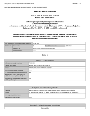 Strona 1 z 5 Identyfikator wydruku: RP/629935/3/20160906144739 CENTRALNA INFORMACJA KRAJOWEGO REJESTRU SĄDOWEGO KRAJOWY REJESTR SĄDOWY Stan na dzień 06.09.2016 godz. 14:47:39 Numer KRS: 0000629935 Informacja odpowiadająca odpisowi aktualnemu Z REJESTRU PRZEDSIĘBIORCÓW pobrana na podstawie art. 4 ust. 4aa ustawy z dnia 20 sierpnia 1997 r. o Krajowym Rejestrze Sądowym (Dz. U. z 2007 r. Nr 168, poz.1186, z późn. zm.) PODMIOT WPISANY TAKŻE DO REJESTRU STOWARZYSZEŃ, INNYCH ORGANIZACJI SPOŁECZNYCH I ZAWODOWYCH, FUNDACJI ORAZ SAMODZIELNYCH PUBLICZNYCH ZAKŁADÓW OPIEKI ZDROWOTNEJ Data rejestracji w Krajowym Rejestrze Sądowym 12.08.2016 Ostatni wpis Numer wpisu 3 Sygnatura akt KR.XI NS-REJ.KRS/23460/16/576/REGON Oznaczenie sądu ------ Data dokonania wpisu 12.08.2016 Dział 1 Rubryka 1 - Dane podmiotu 1.Oznaczenie rodzaju organizacji FUNDACJA 2.Numer REGON/NIP REGON: 365151934, NIP: 6751556155 3.Nazwa FUNDACJA ALINGUA "POMOCNE SŁOWO" 4.Dane o wcześniejszej rejestracji ------ 5.Czy przedsiębiorca prowadzi działalność gospodarczą z innymi podmiotami na podstawie umowy spółki cywilnej? NIE 6.Czy podmiot posiada status organizacji pożytku publicznego? NIE Rubryka 2 - Siedziba i adres podmiotu 1.Siedziba kraj POLSKA, woj. MAŁOPOLSKIE, powiat KRAKÓW, gmina KRAKÓW, miejsc. KRAKÓW 2.Adres ul. RAKOWICKA, nr 8, lok. 14, miejsc. KRAKÓW, kod 31-511, poczta KRAKÓW, kraj POLSKA 3.Adres poczty elektronicznej ------ 4.Adres strony internetowej ------ Rubryka 3 - Jednostki terenowe lub oddziały Brak wpisów Strona 2 z 5 Identyfikator wydruku: RP/629935/3/20160906144739 Rubryka 4 - Informacje o statucie 1.Informacja o sporządzeniu lub zmianie statutu 1 04.07.2016 R. Rubryka 5 1.Czas, na jaki została utworzona organizacja NIEOZNACZONY Rubryka 6 - Sposób powstania podmiotu Brak wpisów Dział 2 Rubryka 1 - Organ uprawniony do reprezentacji podmiotu 1.Nazwa organu uprawnionego do reprezentowania podmiotu ZARZĄD FUNDACJI 2.Sposób reprezentacji podmiotu OŚWIADCZENIA WOLI W IMIENIU FUNDACJI, SKŁADA KAŻDY CZŁONEK ZARZĄDU DZIAŁAJĄCY SAMODZIELNIE. Podrubryka 1 Dane osób wchodzących w skład organu 1 1.Nazwisko / Nazwa lub firma GABOR 2.Imiona PIOTR 3.Numer PESEL/REGON 86032902079 4.Numer KRS **** 5.Funkcja w organie reprezentującym PREZES ZARZĄDU Rubryka 2 - Organ nadzoru Brak wpisów Rubryka 3 Brak wpisów Dział 3 Rubryka 1 - Przedmiot działalności 1.Przedmiot przeważającej działalności przedsiębiorcy 1 74, 30, Z, DZIAŁALNOŚĆ ZWIĄZANA Z TŁUMACZENIAMI 2.Przedmiot pozostałej działalności przedsiębiorcy 1 58, 11, Z, WYDAWANIE KSIĄŻEK 2 58, 12, Z, WYDAWANIE WYKAZÓW ORAZ LIST (NP. ADRESOWYCH, TELEFONICZNYCH) Strona 3 z 5 Identyfikator wydruku: RP/629935/3/20160906144739 3 58, 13, Z, WYDAWANIE GAZET 4 58, 14, Z, WYDAWANIE CZASOPISM I POZOSTAŁYCH PERIODYKÓW 5 58, 19, Z, POZOSTAŁA DZIAŁALNOŚĆ WYDAWNICZA 6 63, 12, Z, DZIAŁALNOŚĆ PORTALI INTERNETOWYCH 7 63, 99, Z, POZOSTAŁA DZIAŁALNOŚĆ USŁUGOWA W ZAKRESIE INFORMACJI, GDZIE INDZIEJ NIESKLASYFIKOWANA 8 70, 21, Z, STOSUNKI MIĘDZYLUDZKIE (PUBLIC RELATIONS) I KOMUNIKACJA 9 70, 22, Z, POZOSTAŁE DORADZTWO W ZAKRESIE PROWADZENIA DZIAŁALNOŚCI GOSPODARCZEJ I ZARZĄDZANIA Rubryka 2 - Wzmianki o złożonych dokumentach Brak wpisów Rubryka 3 - Cel działania organizacji Brak wpisów Rubryka 4 - Przedmiot działalności statutowej organizacji pożytku publicznego Brak wpisów Rubryka 5 - Informacja o dniu kończącym rok obrotowy ------ 31.12.2016 Dział 4 Rubryka 1 - Zaległości Brak wpisów Rubryka 2 - Wierzytelności Brak wpisów Rubryka 3 - Informacje o oddaleniu wniosku o ogłoszenie upadłości na podstawie art. 13 ustawy z 28 lutego 2003 r. Prawo upadłościowe albo o zabezpieczeniu majątku dłużnika w postępowaniu w przedmiocie ogłoszenia upadłości albo w postępowaniu restrukturyzacyjnym albo po prawomocnym umorzeniu postępowania restrukturyzacyjnego Brak wpisów Strona 4 z 5 Identyfikator wydruku: RP/629935/3/20160906144739 Rubryka 4 - Umorzenie prowadzonej przeciwko podmiotowi egzekucji z uwagi na fakt, że z egzekucji nie uzyska się sumy wyższej od kosztów egzekucyjnych Brak wpisów Dział 5 Rubryka 1 - Kurator Brak wpisów Dział 6 Rubryka 1 - Likwidacja Brak wpisów Rubryka 2 - Informacja o rozwiązaniu organizacji Brak wpisów Rubryka 3 - Zarząd komisaryczny lub przymusowy lub przedstawiciel do prowadzenia bieżących spraw stowarzyszenia Brak wpisów Rubryka 4 - Informacja o połączeniu lub podziale Brak wpisów Rubryka 5 - Informacja o postępowaniu upadłościowym Brak wpisów Rubryka 6 - Informacja o postępowaniu układowym Brak wpisów Rubryka 7 - Informacje o postępowaniach restrukturyzacyjnych lub o postępowaniu naprawczym Brak wpisów Strona 5 z 5 Identyfikator wydruku: RP/629935/3/20160906144739 Rubryka 8 - Informacja o zawieszeniu działalności gospodarczej Brak wpisów data sporządzenia wydruku 06.09.2016 adres strony internetowej, na której są dostępne informacje z rejestru: https://ems.ms.gov.pl