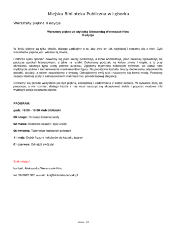 Miejska Biblioteka Publiczna w Lęborku Warsztaty piękna II edycja Warsztaty piękna ze stylistką Aleksandrą Werenczuk-Hinc II edycja W życiu piękne są tylko chwile, dlatego zadbajmy o to, aby było ich jak najwięcej i cieszmy się z nich. Cykl warsztatów piękna jest właśnie tą chwilą. Podczas cyklu spotkań dowiemy się jakie kolory postarzają, a które odmładzają, jakie najlepiej sprawdzają się podczas spotkań biznesowych, a jakie na randki. Dokonamy podziału na kolory zimne i ciepłe, a to przy określeniu naszego typu urody połowa sukcesu. Zgłębimy tajemnice kobiecych sylwetek, co ułatwi nam wydobycie atutów i zamaskowanie mankamentów figury. Na podstawie kształtu twarzy dobierzemy odpowiednie dodatki, okulary, a nawet zaszalejemy z fryzurą. Odnajdziemy swój styl i nauczymy się bawić modą. Poznamy zasady idealnej szafy z zastosowaniem minimalizmu i ponadczasowj elegancji. Dowiemy się przede wszystkim jak być piękną, szczęśliwą i zadowoloną z siebie kobietą. W sylwetce liczą się proporcje, a nie rozmiar, dlatego każda z nas musi nauczyć się akceptować siebie i poprzez modowe triki wydobyć swoje naturalne piękno. PROGRAM: godz. 16:00 - 18:00 klub biblioteki 09 lutego: 10 zasad idealnej szafy 02 marca: Kolorowe zasady i typy urody 06 kwietnia: Tajemnice kobiecych sylwetek 11 maja: Dobór fryzury i okularów do kształtu twarzy 01 czerwca: Odnajdź swój styl Brak miejsc! kontakt: Aleksandra Werenczuk-Hinc tel. 59 8622 307, e-mail: [email protected] strona 1/2 strona 2/2 Powered by TCPDF (www.tcpdf.org)