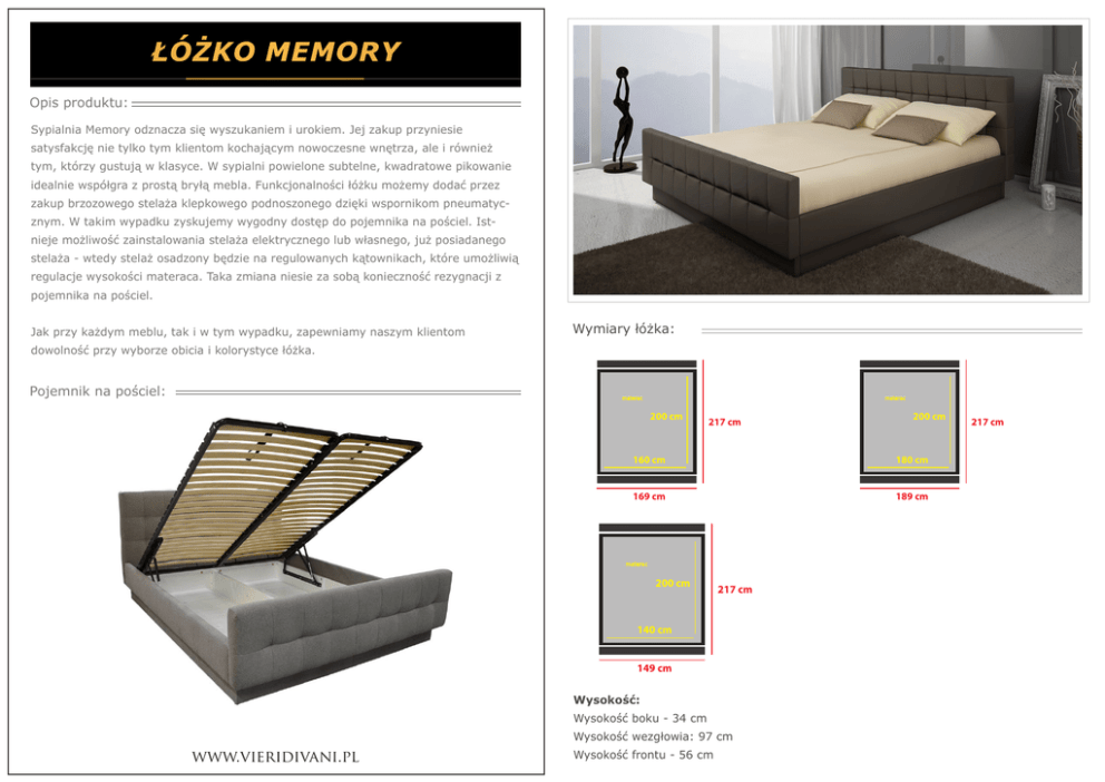 Łóżko memory Opis produktu: Sypialnia Memory odznacza się wyszukaniem i urokiem. Jej zakup przyniesie satysfakcję nie tylko tym klientom kochającym nowoczesne wnętrza, ale i również tym, którzy gustują w klasyce. W sypialni powielone subtelne, kwadratowe pikowanie idealnie współgra z prostą bryłą mebla. Funkcjonalności łóżku możemy dodać przez zakup brzozowego stelaża klepkowego podnoszonego dzięki wspornikom pneumatycznym. W takim wypadku zyskujemy wygodny dostęp do pojemnika na pościel. Istnieje możliwość zainstalowania stelaża elektrycznego lub własnego, już posiadanego stelaża - wtedy stelaż osadzony będzie na regulowanych kątownikach, które umożliwią regulacje wysokości materaca. Taka zmiana niesie za sobą konieczność rezygnacji z pojemnika na pościel. Jak przy każdym meblu, tak i w tym wypadku, zapewniamy naszym klientom Wymiary łóżka: dowolność przy wyborze obicia i kolorystyce łóżka. Pojemnik na pościel: materac materac 200 cm 217 cm 160 cm 180 cm 169 cm 189 cm materac 200 cm 217 cm 140 cm 149 cm Wysokość: Wysokość boku - 34 cm Wysokość wezgłowia: 97 cm www.vieridivani.pl 200 cm Wysokość frontu - 56 cm 217 cm
