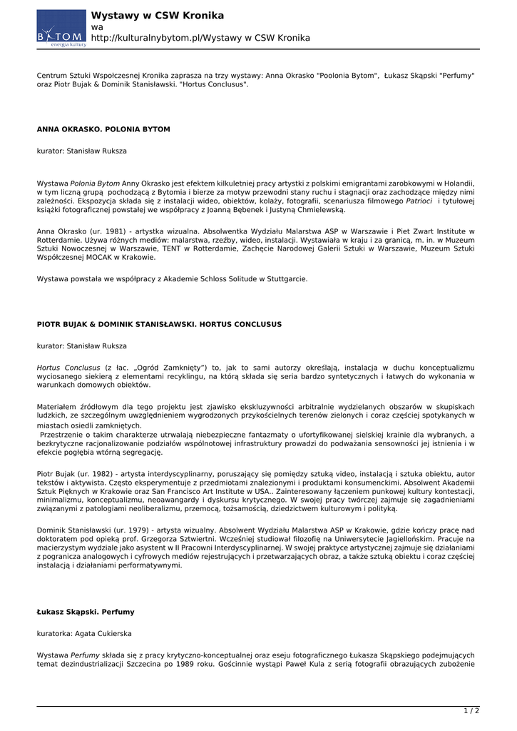 Wystawy w CSW Kronika wa http://kulturalnybytom.pl/Wystawy w CSW Kronika Centrum Sztuki Wspołczesnej Kronika zaprasza na trzy wystawy: Anna Okrasko "Poolonia Bytom", Łukasz Skąpski "Perfumy" oraz Piotr Bujak & Dominik Stanisławski. "Hortus Conclusus". ANNA OKRASKO. POLONIA BYTOM kurator: Stanisław Ruksza Wystawa Polonia Bytom Anny Okrasko jest efektem kilkuletniej pracy artystki z polskimi emigrantami zarobkowymi w Holandii, w tym liczną grupą pochodzącą z Bytomia i bierze za motyw przewodni stany ruchu i stagnacji oraz zachodzące między nimi zależności. Ekspozycja składa się z instalacji wideo, obiektów, kolaży, fotografii, scenariusza filmowego Patrioci i tytułowej książki fotograficznej powstałej we współpracy z Joanną Bębenek i Justyną Chmielewską. Anna Okrasko (ur. 1981) - artystka wizualna. Absolwentka Wydziału Malarstwa ASP w Warszawie i Piet Zwart Institute w Rotterdamie. Używa różnych mediów: malarstwa, rzeźby, wideo, instalacji. Wystawiała w kraju i za granicą, m. in. w Muzeum Sztuki Nowoczesnej w Warszawie, TENT w Rotterdamie, Zachęcie Narodowej Galerii Sztuki w Warszawie, Muzeum Sztuki Współczesnej MOCAK w Krakowie. Wystawa powstała we współpracy z Akademie Schloss Solitude w Stuttgarcie. PIOTR BUJAK & DOMINIK STANISŁAWSKI. HORTUS CONCLUSUS kurator: Stanisław Ruksza Hortus Conclusus (z łac. „Ogród Zamknięty”) to, jak to sami autorzy określają, instalacja w duchu konceptualizmu wyciosanego siekierą z elementami recyklingu, na którą składa się seria bardzo syntetycznych i łatwych do wykonania w warunkach domowych obiektów. Materiałem źródłowym dla tego projektu jest zjawisko ekskluzywności arbitralnie wydzielanych obszarów w skupiskach ludzkich, ze szczególnym uwzględnieniem wygrodzonych przykościelnych terenów zielonych i coraz częściej spotykanych w miastach osiedli zamkniętych. Przestrzenie o takim charakterze utrwalają niebezpieczne fantazmaty o ufortyfikowanej sielskiej krainie dla wybranych, a bezkrytyczne racjonalizowanie podziałów wspólnotowej infrastruktury prowadzi do podważania sensowności jej istnienia i w efekcie pogłębia wtórną segregację. Piotr Bujak (ur. 1982) - artysta interdyscyplinarny, poruszający się pomiędzy sztuką video, instalacją i sztuka obiektu, autor tekstów i aktywista. Często eksperymentuje z przedmiotami znalezionymi i produktami konsumenckimi. Absolwent Akademii Sztuk Pięknych w Krakowie oraz San Francisco Art Institute w USA.. Zainteresowany łączeniem punkowej kultury kontestacji, minimalizmu, konceptualizmu, neoawangardy i dyskursu krytycznego. W swojej pracy twórczej zajmuje się zagadnieniami związanymi z patologiami neoliberalizmu, przemocą, tożsamością, dziedzictwem kulturowym i polityką. Dominik Stanisławski (ur. 1979) - artysta wizualny. Absolwent Wydziału Malarstwa ASP w Krakowie, gdzie kończy pracę nad doktoratem pod opieką prof. Grzegorza Sztwiertni. Wcześniej studiował filozofię na Uniwersytecie Jagiellońskim. Pracuje na macierzystym wydziale jako asystent w II Pracowni Interdyscyplinarnej. W swojej praktyce artystycznej zajmuje się działaniami z pogranicza analogowych i cyfrowych mediów rejestrujących i przetwarzających obraz, a także sztuką obiektu i coraz częściej instalacją i działaniami performatywnymi. Łukasz Skąpski. Perfumy kuratorka: Agata Cukierska Wystawa Perfumy składa się z pracy krytyczno-konceptualnej oraz eseju fotograficznego Łukasza Skąpskiego podejmujących temat dezindustrializacji Szczecina po 1989 roku. Gościnnie wystąpi Paweł Kula z serią fotografii obrazujących zubożenie 1/2 Wystawy w CSW Kronika wa http://kulturalnybytom.pl/Wystawy w CSW Kronika mieszkańców miasta spowodowane bezrobociem. Artysta biorąc za przykład sytuację gospodarczą Szczecina, stawia szereg uniwersalnych pytań związanych z transformacją systemu ekonomicznego w całym kraju. Przedstawia uwarunkowania polityczne, społeczne i ekonomiczne, stanowiące szerszy kontekst dla lokalnej dezindustrializacji. Wystawa realizowana wspólnie z Akademią Sztuki w Szczecinie. ŁUKASZ SKĄPSKI (ur. 1958) - artysta wizualny. Absolwent Wydziału Malarstwa ASP w Krakowie. W latach 2002-2009 wykładowca w ASP w Krakowie. W roku 2006 otrzymał stopień doktorski w ASP w Poznaniu, w 2012 habilitował się na Uniwersytecie Artystycznym w Poznaniu. Od 2010 roku prowadzi Pracownię Intermediów na Akademii Sztuki w Szczecinie. Tworzy instalacje, obiekty, filmy wideo, fotografie. W ostatnich latach główny akcent kładzie na tematy społeczno-polityczne. PAWEŁ KULA – fotograf. Absolwent Wydziału Komunikacji Multimedialnej UA w Poznaniu. Od 2013 wykładowca na Akademii Sztuki w Szczecinie. Konstruuje zabawki optyczne i urządzenia do fotografowania oraz używa metod spoza głównego nurtu fotografii. Znany jako współtwórca solarigrafii, metody fotografowania drogi słońca w półrocznych interwałach. Wystawy potrwają od 19.11.2016 do 7.01.2017 Wernisaż: 19 listopada (sobota) o godz. 19.00 CSW Kronika, Rynek 26 Wstęp wolny 2/2 Powered by TCPDF (www.tcpdf.org)