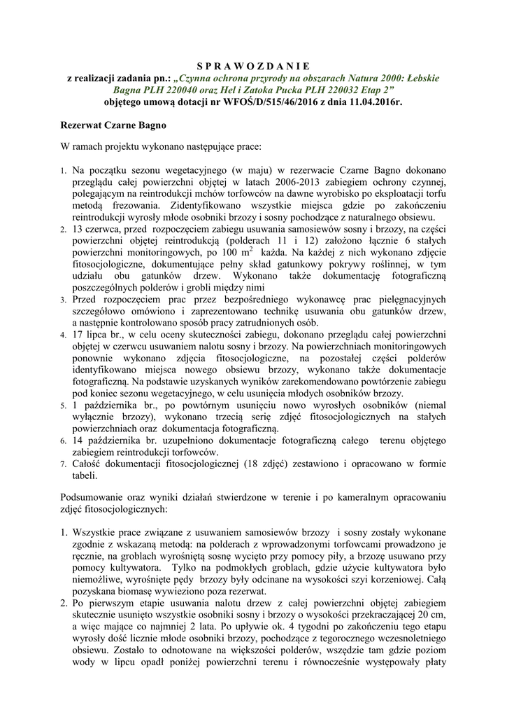 SPRAWOZDANIE z realizacji zadania pn.: „Czynna ochrona przyrody na obszarach Natura 2000: Łebskie Bagna PLH 220040 oraz Hel i Zatoka Pucka PLH 220032 Etap 2” objętego umową dotacji nr WFOŚ/D/515/46/2016 z dnia 11.04.2016r. Rezerwat Czarne Bagno W ramach projektu wykonano następujące prace: 1. 2. 3. 4. 5. 6. 7. Na początku sezonu wegetacyjnego (w maju) w rezerwacie Czarne Bagno dokonano przeglądu całej powierzchni objętej w latach 2006-2013 zabiegiem ochrony czynnej, polegającym na reintrodukcji mchów torfowców na dawne wyrobisko po eksploatacji torfu metodą frezowania. Zidentyfikowano wszystkie miejsca gdzie po zakończeniu reintrodukcji wyrosły młode osobniki brzozy i sosny pochodzące z naturalnego obsiewu. 13 czerwca, przed rozpoczęciem zabiegu usuwania samosiewów sosny i brzozy, na części powierzchni objętej reintrodukcją (polderach 11 i 12) założono łącznie 6 stałych powierzchni monitoringowych, po 100 m2 każda. Na każdej z nich wykonano zdjęcie fitosocjologiczne, dokumentujące pełny skład gatunkowy pokrywy roślinnej, w tym udziału obu gatunków drzew. Wykonano także dokumentację fotograficzną poszczególnych polderów i grobli między nimi Przed rozpoczęciem prac przez bezpośredniego wykonawcę prac pielęgnacyjnych szczegółowo omówiono i zaprezentowano technikę usuwania obu gatunków drzew, a następnie kontrolowano sposób pracy zatrudnionych osób. 17 lipca br., w celu oceny skuteczności zabiegu, dokonano przeglądu całej powierzchni objętej w czerwcu usuwaniem nalotu sosny i brzozy. Na powierzchniach monitoringowych ponownie wykonano zdjęcia fitosocjologiczne, na pozostałej części polderów identyfikowano miejsca nowego obsiewu brzozy, wykonano także dokumentacje fotograficzną. Na podstawie uzyskanych wyników zarekomendowano powtórzenie zabiegu pod koniec sezonu wegetacyjnego, w celu usunięcia młodych osobników brzozy. 1 października br., po powtórnym usunięciu nowo wyrosłych osobników (niemal wyłącznie brzozy), wykonano trzecią serię zdjęć fitosocjologicznych na stałych powierzchniach oraz dokumentacja fotograficzną. 14 października br. uzupełniono dokumentacje fotograficzną całego terenu objętego zabiegiem reintrodukcji torfowców. Całość dokumentacji fitosocjologicznej (18 zdjęć) zestawiono i opracowano w formie tabeli. Podsumowanie oraz wyniki działań stwierdzone w terenie i po kameralnym opracowaniu zdjęć fitosocjologicznych: 1. Wszystkie prace związane z usuwaniem samosiewów brzozy i sosny zostały wykonane zgodnie z wskazaną metodą: na polderach z wprowadzonymi torfowcami prowadzono je ręcznie, na groblach wyrośniętą sosnę wycięto przy pomocy piły, a brzozę usuwano przy pomocy kultywatora. Tylko na podmokłych groblach, gdzie użycie kultywatora było niemożliwe, wyrośnięte pędy brzozy były odcinane na wysokości szyi korzeniowej. Całą pozyskana biomasę wywieziono poza rezerwat. 2. Po pierwszym etapie usuwania nalotu drzew z całej powierzchni objętej zabiegiem skutecznie usunięto wszystkie osobniki sosny i brzozy o wysokości przekraczającej 20 cm, a więc mające co najmniej 2 lata. Po upływie ok. 4 tygodni po zakończeniu tego etapu wyrosły dość licznie młode osobniki brzozy, pochodzące z tegorocznego wczesnoletniego obsiewu. Zostało to odnotowane na większości polderów, wszędzie tam gdzie poziom wody w lipcu opadł poniżej powierzchni terenu i równocześnie występowały płaty 3. 4. 5. 6. 7. roślinności budowanej przez reintrodukowane gatunki mchów torfowców, spontanicznie osiadłe gatunki typowe dla torfowiska wysokich (m.in. żurawinę , wełniankę pochwowatą, wrzosiec bagienny, borówkę bagienną), a także inne gatunki, przede wszystkim wrzos zwyczajny i mchy właściwe. Nowe osobniki brzozy nie zasiedlają tych polderów lub ich części, które wiosną, a czasem również w ciągu lata są zalane lub trwale podtopione. Całkowity brak wkraczania brzozy stwierdzono również w miejscach, które późną wiosną są płytko podtopione, a po opadnięciu poziomu wody pod powierzchnię terenu - intensywnie penetrowane przez żurawie. Na tego rodzaju powierzchniach najczęściej nie występują w ogóle rośliny zielne, a co najwyżej w okresie letnim rozwijają się glony, drobne mchy z rodzaju Dicranella i młode osobniki wełnianki pochwowatej. Nie stwierdzono pojawienia się młodych osobników drzew na wyniesionych, suchych groblach, natomiast sporadycznie napotkano na odrośla brzozy na groblach niskich i stale wilgotnych, z których brzoza była usuwana przez odcięcie systemu korzeniowego. Letni obsiew brzozy na takich groblach był znikomy. Prowadzony na stałych powierzchniach monitoring fitosocjologiczny jednoznacznie wskazuje na postęp w rozwoju roślinności torfowiskowej na polderach 11 i 12. W odniesieniu do warstwy mszystej na wszystkich sześciu powierzchniach stwierdzono wzrost ogólnej wartości pokrycia gleby przez mchy torfowce i mchy właściwe (w granicach 10-20%), natomiast w przypadku warstwy roślin zielnych wzrost ten nastąpił na połowie monitorowanych poletek. Równocześnie jednak na tych samych polderach intensywność obsiewu i rozwój młodych osobników brzozy jest najwyższa, gdyż wyniesienie powierzchni terenu obu polderów jest nieco wyższe od pozostałych i tylko w niewielkiej części są one płytko zalewane w okresie od jesieni do wiosny. Analiza wykonanej dokumentacji fotograficznej wszystkich polderów objętych reintrodukcją torfowców jednoznacznie wskazuje, że stopień zaawansowania i kierunek sukcesji roślinnej jest bardzo zróżnicowany. Na obecnym etapie rozwoju są to np. agregacje Sphagnum cuspidatum w miejscach najmocniej i najdłużej zalanych, w miejscach mniej podtopionych fitocenozy z dominacją wełnianki pochwowatej Eriophorum vaginatum, situ rozpierzchłego Juncus effusus, wełnianki wąskolistnej Eriophorum angustifolium, w miejscach w przewadze stale wynurzonych inicja