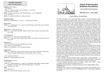 Porządek Nabożeństw od 27.11. do 04.12.2016 r. Niedziela 27.11. I Adwent 7:00 Różaniec 7:30 Za ++ Ericha Smieskol - zam. od sąsiadów. (j. niemiecki) 9:30 Godzinki ku czci NMP 10:00 O szczęście wieczne dla Lydii i Konrada Bekierz - zam. od Margaretek 17:15 Nabożeństwo 18:00 Za + matkę Lydię Bekierz w miesiąc po śmierci Poniedziałek 28.11. 17:00 Za + Elfrydę Dylong w r. śmierci ++ z rodzin Jancik i Pawlik Wtorek 29.11. 17:00 Za ++ matkę Martę w 18 r. śmierci, ojca Wincentego, siostrę Edytę, ciocię Gertrudę i dusze opuszczone Środa 30.11. św. Andrzeja Ap. święto 17:00 Za ++ synów Józefa i Rudolfa, rodziców Pawła i Marię, Jerzego i Franciszkę, siostry, braci i pokr. I Czwartek 01.12. 16:00 Godzina Św. i Koronka do Bożego Miłosierdzia 17:00 Za ++ siostrzeńca Pawła, ojca Konrada, babcię Annę, rodziców chrzestnych i dusze opuszczone I Piątek 02.12. 7:00 W int. chorych, starszych, samotnych (j. niemiecki) 16:30 Różaniec za młode pokolenie 17:00 Za + Lydię Bekierz - zam. od rodziny Drzyzga I Sobota 03.12. 8:00 Za ++ męża Piotra Lempa, rodziców Józef i Anna Lempa, Franciszek i Marta Rink, rodziców Machula, brata Henryka, siostrę Elżbietę i dusze w czyśćcu ——–—–——–——————–—————–—–——–—————— 17:30 Nabożeństwo Maryjne 18:00 W int. pielgrzymujących do Włoch Niedziela 04.12. II Adwent 7:00 Różaniec 7:30 Za ++ matkę Gertrudę w 6 r. śmierci, ojca Wilhelma, matkę Marię, szwagra Alfreda, dziadków z obu stron, Annę, Józefa, Bernarda i pokr. (j. niemiecki) 9:30 Godzinki ku czci NMP 10:00 ………………… 17:15 Nabożeństwo 18:00 Za ++ męża Alfreda, rodziców, teściów i pokr. Nasza Kolonowska Rodzina Parafialna www.parafia-kolonowskie.pl 48(1196) 27.11. – 04.12.2016 Kraków/Panama. Panama/Kraków W wielu z Nas grają w sercu wydarzenia ŚDM z Krakowa. Przed oczami mamy obrazy tego wydarzenia. W uszach słowa i rytmy. Niech to trwa. Wracajmy do tych dni. Niech one Nas niosą, mobilizują. Jeśli szukamy pozytywnych, Bożych mocy i energii, to trzeba wracać do Krakowa. Trzeba „idąc w butach papieża Franciszka”, przystanąć. Pomyśleć, pomodlić się i pójść dalej. A idąc możemy zawędrować w 2019 roku do Panamy. Z Naszej Grupy z Krakowa jest parę osób, które podjęło temat Panamy. Doszło parę osób nowych. Jest nas ok. 20 młodych plus 1. Spotykamy się, mamy pomysły. Działamy. Jeśli zapraszamy do Panamy, to nie koniecznie, aby tam od razu pojechać, być tam. Panama to idea. To moc działania. Zaproszenie do Panamy jest skierowane do każdego młodego człowieka, a właściwie do wszystkich. Panama nich łączy, mobilizuje. Nie znaczy to, że każdy kto włączy się w działania, modlitwy musi jechać. Może i z naszej grupy pojechać jedna, dwie osoby. Chodzi o czas przygotowania. Jeśli ktoś myśli, że Panama go nie interesuje, bo nie pojedzie, to nie ma racji. A może tak, usprawiedliwia swoje siedzenie wygodne na kanapie, aby tylko nic nie zmieniać. Zapraszamy przede wszystkim do modlitwy, spotkań, czuwań. Ale też podejmujemy akcje, aby zainteresować Panamą „cały świat naszych parafii, naszej gminy”. Nasza grupa przyjęła na razie hasło „Kajakiem do Panamy”. Dlatego, iż na razie stać nas tylko na wypożyczenia kajaka, aby przez Ocean tam popłynąć. Ale liczymy, że dzięki Naszemu entuzjazmowi, a Waszej pomocy uda nazbierać się na szybszą i lepszą tam podróż. Prosimy i proponujemy: * Od I Niedzieli Adwentu aż do II Święta Wielkanocy, aby w rodzinach lub indywidualnie, w domach, w jakimś miejscu postawić słoiczek lub słoik, do którego przez ten czas można wrzucać pieniążki. Jeśli z czegoś dla siebie zrezygnujemy, to można wrzucić tam wartość rzeczy, przyjemności z której, ktoś zrezygnował (np. ktoś zrezygnuje z kupna czekolady, a ktoś może zrezygnować z kupna samochodu :), no i wartość czekolady, czy też samochodu zostaje wrzucona do słoiczka - Panama). W II Dzień Wielkanocy będzie przeprowadzona przed młodzież akcja „Zamiast lecącej dyngusowej wody lecą panamskie słoiki”. W wejściu do kościoła również jest skarbonka, z której ofiary przeznaczamy na akcję - Panama 2019. * W IV Niedzielę Adwentu młodzież będzie rozprowadzała „Panamo-BOMBY”, na choinkę. Oby na każdej choince zawisła przynajmniej jedna taka bombka z nadrukiem Panama. Niech ta bombka będzie zawieszona przy śpiewie kolędy, całej rodziny. * Na święta Bożego Narodzenia, ukarze się książka „Camino. Nowe Drogi”, z której ewentualne zyski przeznaczone zostaną na ten sam cel. Dziękujemy za wyrozumiałość, życzliwość, pozytywne energie, każdą modlitwę i ofiarę. ZAPRASZAMY ! Każdego kto chce włączyć się do Naszej Grupy i robić „Raban” przez spotkania, pomysły, modlitwę, prace, prośby to należy na Facebooku polubić stronę (fanpage) „Kajakiem do Panamy”. 48/2016 Adwent Roraty od poniedziałku do piątku o 17:00. Zapraszamy wszystkich: dorosłych, młodzież, dzieci. Rozpoczyna się nowy Rok Liturgiczny: - niedziele, święta i uroczystości - cykl A. - dni powszednie - rok I - Zmartwychwstanie Pańskie będzie 16 kwietnia. Intencja modlitewna na miesiąc grudzień O jak najlepsze i owocne przygotowanie się i przeżycie świąt Bożego Narodzenia dla każdego z naszych parafian. W grudniu i styczniu następujące Róże Różańcowe przewodniczą modlitwie różańcowej: 04.12. Róża 1 p. Teresa Obst 11.12. Róża 2 p. Anna Bock 18.04. Róża 3 p. Katarzyna Budnik 25.12. Róża 4 p. Irena Czupała 26.12. Róża 5 p. Elfryda Fleger 01.01. Róża 6 p. Maria Baron 06.01. Róża 7 p. Hildegarda Klabisch 08.01. Róża 8 p. Gizela Zajonc Terminy nauk przedmałżeńskich: 6, 7, 12, 13 grudnia. Nauki rozpoczynają się przy parafii NSPJ w Zawadzkiem o godz. 15:00. Adwentowe sentencje cz. 1: - Ernest Hemingway: Porażka może zmienić się w dłuższym czasie w 