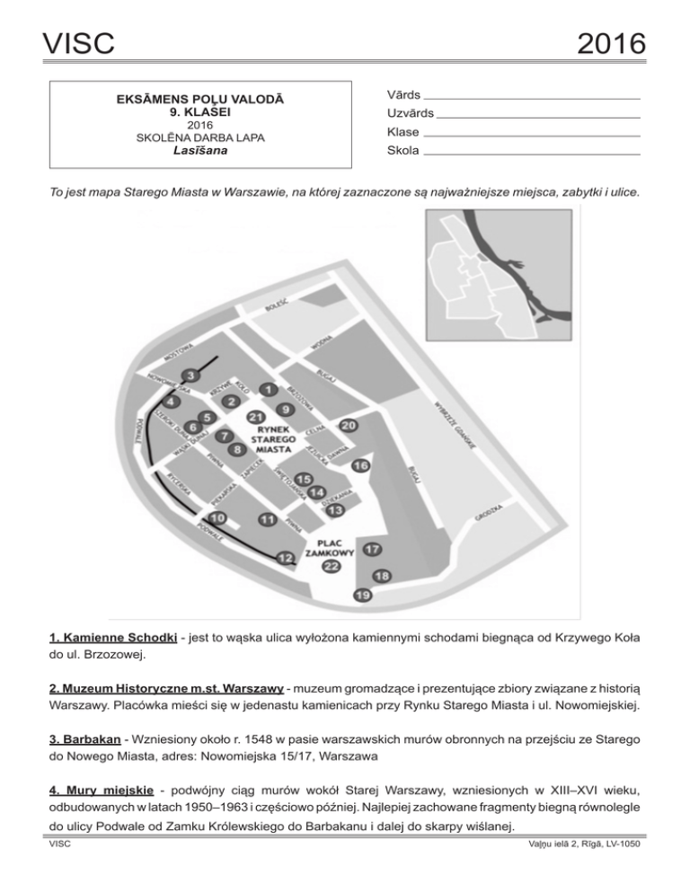 VISC 2016 EKSĀMENS POĻU VALODĀ 9. KLASEI 2016 SKOLĒNA DARBA LAPA Lasīšana Vārds Uzvārds Klase Skola To jest mapa Starego Miasta w Warszawie, na której zaznaczone są najważniejsze miejsca, zabytki i ulice. 1. Kamienne Schodki - jest to wąska ulica wyłożona kamiennymi schodami biegnąca od Krzywego Koła do ul. Brzozowej. 2. Muzeum Historyczne m.st. Warszawy - muzeum gromadzące i prezentujące zbiory związane z historią Warszawy. Placówka mieści się w jedenastu kamienicach przy Rynku Starego Miasta i ul. Nowomiejskiej. 3. Barbakan - Wzniesiony około r. 1548 w pasie warszawskich murów obronnych na przejściu ze Starego do Nowego Miasta, adres: Nowomiejska 15/17, Warszawa 4. Mury miejskie - podwójny ciąg murów wokół Starej Warszawy, wzniesionych w XIII–XVI wieku, odbudowanych w latach 1950–1963 i częściowo później. Najlepiej zachowane fragmenty biegną równolegle do ulicy Podwale od Zamku Królewskiego do Barbakanu i dalej do skarpy wiślanej. VISC Vaļņu ielā 2, Rīgā, LV-1050 Eksāmens poļu valodā 9. klasei Skolēna darba lapa Lasīšana 2016 2 5. Kamienica Salwator - Kamienica Franciszka Salwatora została zbudowana około 1770 r. W 1825 r. budynek nabył warszawski mydlarz Jan Fryderyk Schlüssler, od którego z kolei kupili go Tomasz i Magdalena Würsterowie. Małżeństwo Würsterów było inicjatorem remontu kamienicy oraz budowy tylnego budynku od strony ulicy Koźlej. Prace te zostały wykonane w 1834 r. pod kierunkiem architekta Alfonsa Kropiwnickiego. 6. Muzeum Cechu Rzemiosł Skórzanych im. J. Kilińskiego muzeum na warszawskim Starym Mieście mieszczące się w Kamienicy Szewców przy ulicy Wąski Dunaj 10 (wejście od Szerokiego Dunaju). Zostało utworzone w 1973 z inicjatywy Cechu Rzemiosł Skórzanych w celu przedstawienia organizacji i warunków pracy warsztatów rękodzielniczych związanych z obróbką skóry. 7. Kamienica Pod św. Anną - kamienica mieszcząca się na rogu Rynku Starego Miasta i ul. Wąski Dunaj, znana także pod nazwami: Plumhoffowska, Rzepczyńska, Kazubowska, Pod Św. Markiem, a co najmniej od pierwszej połowy XIX wieku nazywana niesłusznie kamienicą Książąt Mazowieckich. 8. Kamienica Fukierów - kamienica na warszawskim Starym Mieście pomiędzy Rynkiem Starego Miasta a ul. Piwną, pod adresami Rynek 27 i Piwna 44. 9. Muzeum Literatury im. Adama Mickiewicza w Warszawie – muzeum historii literatury powstało w 1950, działalność rozpoczęło w 1952. Muzeum mieści się w sześciu kamienicach na Starym Mieście. Obecna ekspozycja stała poświęcona jest postaci Adama Mickiewicza i jego twórczości. Na wystawie można zobaczyć rękopisy najważniejszych dzieł poety, listy, utwory drobne. Oprócz rękopisów Mickiewicza w muzeum znajdują się również rękopisy innych polskich artystów: Słowackiego, Norwida, Sienkiewicza, Konopnickiej, Żeromskiego, Nałkowskiej, Gałczyńskiego, Gombrowicza. Adres: Rynek Starego Miasta 20. 10. Muzeum Rzemiosł Artystycznych i Precyzyjnych - muzeum w Warszawie, znajduje się przy ul. Piekarskiej na warszawskim Starym Mieście. Gromadzi zabytki dawnego i współczesnego rzemiosła artystycznego i precyzyjnego. 11. Kościół św. Marcina - kościół przy ulicy Piwnej na Starym Mieście w dzielnicy Śródmieście. Został ufundowany wraz z klasztorem Augustianów w 1353 roku. 12. Most Gotycki - znajduje się w południowo-zachodniej części placu Zamkowego, u wylotu ulicy Senatorskiej. Został on odkryty w 1977 roku podczas prac archeologicznych, które były prowadzone przy okazji odbudowy Zamku Królewskiego. Do użytku oddany został w 1983 roku. Przed mostem znajdowała się Brama Krakowska, która została rozebrana w 1818 roku. Zarys bramy jest uwidoczniony na bruku czerwoną cegłą. 13. Kamienica Pod Pelikanem - kamienica znajdująca się przy placu Zamkowym 1/13 na Starym Mieście w Warszawie. Jej nazwa pochodzi od wyrzeźbionego pelikana, który znajduje się na rogu budynku. 14. Katedra św. Jana Chrzciciela - znajdująca się na Starym Mieście w Warszawie przy ul. Świętojańskiej 8. Jedna z najstarszych świątyń Warszawy. Stanowi jedno z najważniejszych miejsc kultury i tradycji narodowej Polski. VISC Vaļņu ielā 2, Rīgā, LV-1050 Eksāmens poļu valodā 9. klasei Skolēna darba lapa Lasīšana 2016 3 15. Sanktuarium Matki Bożej Łaskawej - kościół znajdujący się na Starym Mieście w Warszawie przy ul. Świętojańskiej 10. Kościół został zbudowany w latach 1609-1626 według projektu nieznanego architekta, który swym kunsztem udowodnił swój niezwykły profesjonalizm i fachowość. Prawdopodobnie autorem tego mistrzowskiego projektu był Jan Frankiewicz. 16. Kanonia - trójboczny placyk położony na tyłach katedry św. Jana w Warszawie, u zbiegu ulic Dziekanii, Jezuickiej i uliczki wiodącej z dziedzińca kuchennego Zamku Królewskiego. 17. Zamek Królewski - we wschodniej części placu Zamkowego zobaczyć można zrekonstruowany po zniszczeniach wojennych Zamek Królewski - rezydencję książąt mazowieckich oraz królów Polski; to historyczne miejsce. To właśnie tutaj uchwalono Konstytucję 3 Maja. 18. Pałac pod Blachą – późno barokowy pałac, zbudowany w latach 1720-1730 przez Jakuba Fontanę u podnóża Zamku Królewskiego w Warszawie. Przynajmniej raz był w pałacu Napoleon Bonaparte, a przez kilka miesięcy książę Józef Poniatowski gościł w nim swojego przyjaciela marszałka Francji Joachima Murata.W latach 1926–1939 w pałacu mieściły się biura Kancelarii Prezydenta oraz mieszkania. W czasie II wojny światowej pałac został przez Niemców spalony. Odbudowany tuż po wojnie w latach 1948–1949. 19. Tunel Trasy W-Z - tunel pod placem Zamkowym – tunel drogowo-tramwajowy trasy W-Z w Warszawie, przebiegający pod placem Zamkowym. Został zbudowany w latach 1948-1949. Dzięki niemu ruch kołowy między wschodnimi i zachodnimi dzielnicami Warszawy ominął Stare Miasto i plac Zamkowy. W celu jego reali