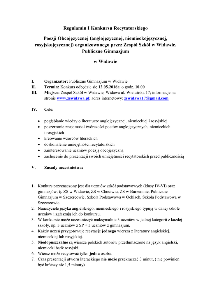 Regulamin I Konkursu Recytatorskiego Poezji Obcojęzycznej (anglojęzycznej, niemieckojęzycznej, rosyjskojęzycznej) organizowanego przez Zespół Szkół w Widawie, Publiczne Gimnazjum w Widawie I. II. III. Organizator: Publiczne Gimnazjum w Widawie Termin: Konkurs odbędzie się 12.05.2016r. o godz. 10.00 Miejsce: Zespół Szkół w Widawie, Widawa ul. Wieluńska 17; informacje na stronie www.zswidawa.pl; adres internetowy: [email protected] IV. Cele: V. pogłębianie wiedzy o literaturze anglojęzycznej, niemieckiej i rosyjskiej poszerzanie znajomości twórczości poetów anglojęzycznych, niemieckich i rosyjskich kreowanie wzorców literackich doskonalenie umiejętności recytatorskich zainteresowanie uczniów poezją obcojęzyczną zachęcenie do prezentacji swoich umiejętności recytatorskich przed publicznością Zasady uczestnictwa: 1. Konkurs przeznaczony jest dla uczniów szkół podstawowych (klasy IV-VI) oraz gimnazjów, tj. ZS w Widawie, ZS w Chociwiu, ZS w Burzeninie, Publiczne Gimnazjum w Szczercowie, Szkoła Podstawowa w Ochlach, Szkoła Podstawowa w Szczercowie. 2. Nauczyciele języka angielskiego, niemieckiego i rosyjskiego typują w danej szkole uczniów i zgłaszają ich do konkursu. 3. W konkursie może uczestniczyć maksymalnie 3 uczniów w jednej kategorii z każdej szkoły, np. 3 uczniów z SP + 3 uczniów z gimnazjum. 4. Każdy uczeń przygotowuje recytację jednego wiersza z literatury angielskiej, niemieckiej lub rosyjskiej. 5. Niedopuszczalne są wiersze polskich autorów przetłumaczone na język angielski, niemiecki bądź rosyjski. 6. Wiersz może recytować tylko jedna osoba. 7. Czas prezentacji utworu literackiego nie może przekraczać 3 minut, ( nie powinien być krótszy niż 1,5 minuty). 8. Podczas prezentacji dozwolone jest wykorzystanie środków artystycznych (mimika, gesty, ruch, charakteryzacja ucznia, rekwizyty, tło muzyczne oraz inne). 9. Kartę zgłoszenia uczestników oraz wiersze do prezentacji należy przesyłać najpóźniej do 05.05.2016r. do godziny 15.00 na numer faxu ZS w Widawie (43 672 10 16), mailem na adres szkoły lub mailem na adres organizatora konkursu: [email protected]. Po upływie tego terminu zgłoszenia nie będą przyjmowane. 10. Zgłoszenie powinno zawierać imię i nazwisko ucznia, tytuł utworu literackiego, imię i nazwisko autora utworu, imię i nazwisko nauczyciela przygotowującego uczniów do konkursu, adres kontaktowy e-mail i numer telefonu. Regulamin konkursu oraz karta zgłoszenia uczniów znajdują się na stronie ZS w Widawie. VI. Kryteria oceny: 1. Uczniowie będą oceniani w dwóch różnych kategoriach wiekowych: szkoła podstawowa (klasy IV-VI) oraz gimnazjum. 2. Każdy przedstawiciel jury może przyznać maksymalnie 30 punktów każdemu uczestnikowi. Przy ocenie brane są pod uwagę trzy kryteria: poprawność wymowy, interpretacja oraz wrażenie artystyczne. 3. Kwestie sporne rozstrzyga przewodniczący jury. W skład jury mogą wchodzić nauczyciele przygotowujący uczniów do konkursu. (Prosimy zgłosić wcześniej chęć członkowstwa w jury). VII. Nagrody: 1. Organizator przewiduje dla laureatów nagrody książkowe lub pamiątkowe oraz dyplomy dla wszystkich uczestników konkursu i podziękowania dla nauczycieli przygotowujących uczniów do recytacji wierszy. VIII. Przebieg konkursu: 1. Pierwszy etap eliminacji powinien odbyć się indywidualnie we wszystkich szkołach bez określania terminu. 2. Drugi etap odbędzie się w budynku Zespołu Szkół w Widawie w dniu 12 maja 2016r. o godz. 10.00. IX. Program konkursu: 1. Przybycie uczestników do ZS w Widawie, godz. 10.00-10.20 – rejestracja uczestników. 2. Udział w konkursie – prezentacja utworów literackich. 3. Przerwa. 4. Ogłoszenie wyników. 5. Rozdanie nagród. 6. Przewidywane zakończenie konkursu około godz. 12.30 (w zależności od ilości złożonych zgłoszeń). X. Postanowienia końcowe: 1. Sprawy nieujęte w regulaminie rozstrzyga jury i organizator. 2. Uczestnik zezwala na wykorzystywanie i przetwarzanie w bazie danych informacji osobowych zawartych w Karcie Zgłoszenia w celu organizacji konkursu. 3. Wszelkich informacji dotyczących konkursu udzielamy mailowo lub telefonicznie z organizatorem konkursu: Sylwia Rychlik, tel. 503 145 969; [email protected]. 4. Osoby odpowiedzialne za przebieg konkursu: p. Sylwia Rychlik – nauczyciel języka angielskiego w Zespole Szkół w Widawie p. Blandyna Ciszewska – nauczyciel języka angielskiego w Publicznym Gimnazjum w Widawie p. Jolanta Wróblewska – nauczyciel języka rosyjskiego w Publicznym Gimnazjum w Widawie p. Anna Kopytnik – nauczyciel języka niemieckiego w Publicznym Gimnazjum w Widawie.