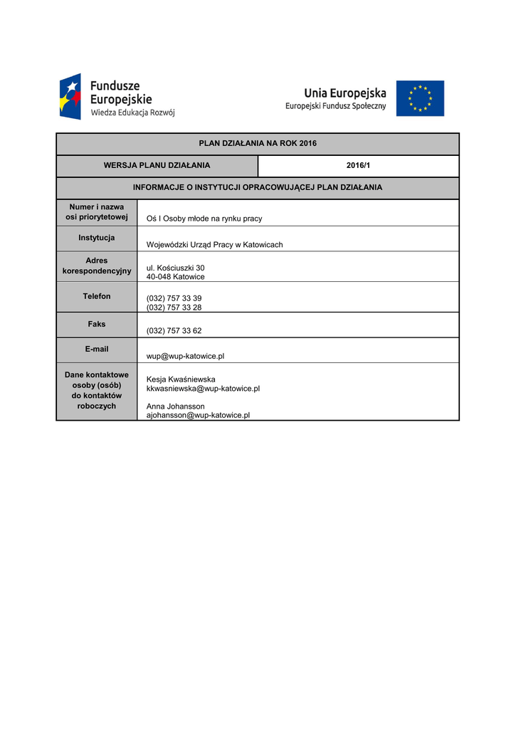 PLAN DZIAŁANIA NA ROK 2016 WERSJA PLANU DZIAŁANIA 2016