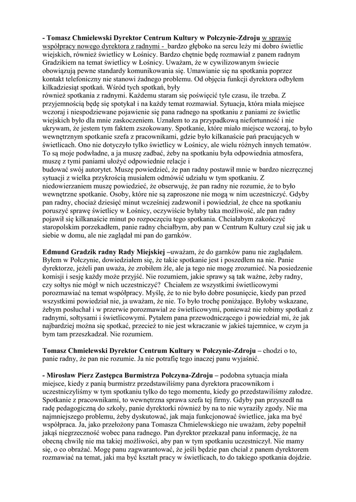 - Tomasz Chmielewski Dyrektor Centrum Kultury w Połczynie-Zdroju w sprawie współpracy nowego dyrektora z radnymi - bardzo głęboko na sercu leży mi dobro świetlic wiejskich, również świetlicy w Łośnicy. Bardzo chętnie będę rozmawiał z panem radnym Gradzikiem na temat świetlicy w Łośnicy. Uważam, że w cywilizowanym świecie obowiązują pewne standardy komunikowania się. Umawianie się na spotkania poprzez kontakt telefoniczny nie stanowi żadnego problemu. Od objęcia funkcji dyrektora odbyłem kilkadziesiąt spotkań. Wśród tych spotkań, były również spotkania z radnymi. Każdemu staram się poświęcić tyle czasu, ile trzeba. Z przyjemnością będę się spotykał i na każdy temat rozmawiał. Sytuacja, która miała miejsce wczoraj i niespodziewane pojawienie się pana radnego na spotkaniu z paniami ze świetlic wiejskich było dla mnie zaskoczeniem. Uznałem to za przypadkową niefortunność i nie ukrywam, że jestem tym faktem zszokowany. Spotkanie, które miało miejsce wczoraj, to było wewnętrznym spotkanie szefa z pracownikami, gdzie było kilkanaście pań pracujących w świetlicach. Ono nie dotyczyło tylko świetlicy w Łośnicy, ale wielu różnych innych tematów. To są moje podwładne, a ja muszę zadbać, żeby na spotkaniu była odpowiednia atmosfera, muszę z tymi paniami ułożyć odpowiednie relacje i budować swój autorytet. Muszę powiedzieć, że pan radny postawił mnie w bardzo niezręcznej sytuacji z wielka przykrością musiałem odmówić udziału w tym spotkaniu. Z niedowierzaniem muszę powiedzieć, że obserwuję, że pan radny nie rozumie, że to było wewnętrzne spotkanie. Osoby, które nie są zaproszone nie mogą w nim uczestniczyć. Gdyby pan radny, chociaż dziesięć minut wcześniej zadzwonił i powiedział, że chce na spotkaniu poruszyć sprawę świetlicy w Łośnicy, oczywiście byłaby taka możliwość, ale pan radny pojawił się kilkanaście minut po rozpoczęciu tego spotkania. Chciałabym zakończyć staropolskim porzekadłem, panie radny chciałbym, aby pan w Centrum Kultury czuł się jak u siebie w domu, ale nie zaglądał mi pan do garnków. Edmund Gradzik radny Rady Miejskiej –uważam, że do garnków panu nie zaglądałem. Byłem w Połczynie, dowiedziałem się, że takie spotkanie jest i poszedłem na nie. Panie dyrektorze, jeżeli pan uważa, że zrobiłem źle, ale ja tego nie mogę zrozumieć. Na posiedzenie komisji i sesję każdy może przyjść. Nie rozumiem, jakie sprawy są tak ważne, żeby radny, czy sołtys nie mógł w nich uczestniczyć? Chciałem ze wszystkimi świetlicowymi porozmawiać na temat współpracy. Myślę, że to nie było dobre posunięcie, kiedy pan przed wszystkimi powiedział nie, ja uważam, że nie. To było trochę poniżające. Byłoby wskazane, żebym posłuchał i w przerwie porozmawiał ze świetlicowymi, ponieważ nie robimy spotkań z radnymi, sołtysami i świetlicowymi. Pytałem pana przewodniczącego i powiedział mi, że jak najbardziej można się spotkać, przecież to nie jest wkraczanie w jakieś tajemnice, w czym ja bym tam przeszkadzał. Nie rozumiem. Tomasz Chmielewski Dyrektor Centrum Kultury w Połczynie-Zdroju – chodzi o to, panie radny, że pan nie rozumie. Ja nie potrafię tego inaczej panu wyjaśnić. - Mirosław Pierz Zastępca Burmistrza Połczyna-Zdroju – podobna sytuacja miała miejsce, kiedy z panią burmistrz przedstawiliśmy pana dyrektora pracownikom i uczestniczyliśmy w tym spotkaniu tylko do tego momentu, kiedy go przedstawiliśmy załodze. Spotkanie z pracownikami, to wewnętrzna sprawa szefa tej firmy. Gdyby pan przyszedł na radę pedagogiczną do szkoły, panie dyrektorki również by na to nie wyraziły zgody. Nie ma najmniejszego problemu, żeby dyskutować, jak maja funkcjonować świetlice, jaka ma być współpraca. Ja, jako przełożony pana Tomasza Chmielewskiego nie uważam, żeby popełnił jakąś niegrzeczność wobec pana radnego. Pan dyrektor przekazał panu informację, że na obecną chwilę nie ma takiej możliwości, aby pan w tym spotkaniu uczestniczył. Nie mamy się, o co obrażać. Mogę panu zagwarantować, że jeśli będzie pan chciał z panem dyrektorem rozmawiać na temat, jaki ma być kształt pracy w świetlicach, to do takiego spotkania dojdzie.