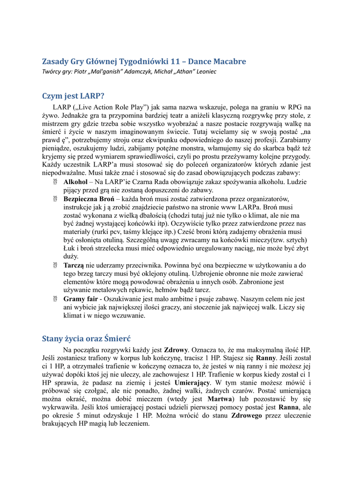 Zasady Gry Głównej Tygodniówki 11 – Dance Macabre Twórcy gry: Piotr „Mal'ganish” Adamczyk, Michał „Athan” Leoniec Czym jest LARP? LARP („Live Action Role Play”) jak sama nazwa wskazuje, polega na graniu w RPG na żywo. Jednakże gra ta przypomina bardziej teatr a aniżeli klasyczną rozgrywkę przy stole, z mistrzem gry gdzie trzeba sobie wszystko wyobrażać a nasze postacie rozgrywają walkę na śmierć i życie w naszym imaginowanym świecie. Tutaj wcielamy się w swoją postać „na prawd ę”, potrzebujemy stroju oraz ekwipunku odpowiedniego do naszej profesji. Zarabiamy pieniądze, oszukujemy ludzi, zabijamy potężne monstra, włamujemy się do skarbca bądź też kryjemy się przed wymiarem sprawiedliwości, czyli po prostu przeżywamy kolejne przygody. Każdy uczestnik LARP’a musi stosować się do poleceń organizatorów których zdanie jest niepodważalne. Musi także znać i stosować się do zasad obowiązujących podczas zabawy: Alkohol – Na LARP’ie Czarna Rada obowiązuje zakaz spożywania alkoholu. Ludzie pijący przed grą nie zostaną dopuszczeni do zabawy. Bezpieczna Broń – każda broń musi zostać zatwierdzona przez organizatorów, instrukcje jak j ą zrobić znajdziecie państwo na stronie www LARPa. Broń musi zostać wykonana z wielką dbałością (chodzi tutaj już nie tylko o klimat, ale nie ma być żadnej wystającej końcówki itp). Oczywiście tylko przez zatwierdzone przez nas materiały (rurki pcv, taśmy klejące itp.) Cześć broni którą zadajemy obrażenia musi być osłonięta otuliną. Szczególną uwagę zwracamy na końcówki mieczy(tzw. sztych) Łuk i broń strzelecka musi mieć odpowiednio uregulowany naciąg, nie może być zbyt duży. Tarczą nie uderzamy przeciwnika. Powinna być ona bezpieczne w użytkowaniu a do tego brzeg tarczy musi być oklejony otuliną. Uzbrojenie obronne nie może zawierać elementów które mogą powodować obrażenia u innych osób. Zabronione jest używanie metalowych rękawic, hełmów bądź tarcz. Gramy fair - Oszukiwanie jest mało ambitne i psuje zabawę. Naszym celem nie jest ani wybicie jak największej ilości graczy, ani stoczenie jak najwięcej walk. Liczy się klimat i w niego wczuwanie. Stany życia oraz Śmierć Na początku rozgrywki każdy jest Zdrowy. Oznacza to, że ma maksymalną ilość HP. Jeśli zostaniesz trafiony w korpus lub kończynę, tracisz 1 HP. Stajesz się Ranny. Jeśli został ci 1 HP, a otrzymałeś trafienie w kończynę oznacza to, że jesteś w nią ranny i nie możesz jej używać dopóki ktoś jej nie uleczy, ale zachowujesz 1 HP. Trafienie w korpus kiedy został ci 1 HP sprawia, że padasz na ziemię i jesteś Umierający. W tym stanie możesz mówić i próbować się czołgać, ale nic ponadto, żadnej walki, żadnych czarów. Postać umierającą można okraść, można dobić mieczem (wtedy jest Martwa) lub pozostawić by się wykrwawiła. Jeśli ktoś umierającej postaci udzieli pierwszej pomocy postać jest Ranna, ale po okresie 5 minut odzyskuje 1 HP. Można wrócić do stanu Zdrowego przez uleczenie brakujących HP magią lub leczeniem. Jeżeli postać zostanie zabita to leży na ziemi. Czas wykrwawiania Czas śmierci mają wynosić około 5 minut. Po upływie 5 minut gracz musi jak najszybciej dostać się na cmentarz i leżeć tam, dopóki nie zainteresuje się nim organizator. Trucizny Dzielą się one na dwie kategorie: zwykłe i zabójcze. Zwykłe sprawiają, że postać nie może w żaden sposób leczyć straconych HP, a zabójcze... tracimy 1 HP co 5 minut aż do śmierci. Truciznę można uleczyć antidotum. Jeśli podczas picia mikstury lub napoju poczujemy słony smak, znaczy, ze padliśmy ofiarami zabójczej trucizny. Niektóre postacie potrafią nałożyć truciznę na broń. Choroba Choroby mają wszelakie działania i efekty, ale sprowadzają się do jednego: osoba chora nie może pracować, zarabiać, pozyskiwać pomagierów ani nosić karawany. Zwyczajnie źle się czuje. Klątwa Osoba przeklęta zostaje zmuszona do działania wbrew sobie. Musi wypełniać polecenie klątwy. Pijaństwo Jeśli kapkę przesadziliśmy z alkoholem, stajemy się PIJANI. Postać nie może iść przed siebie prosto, co drugi jej cios nie trafia. Po odpowiednim czasie (około 15 minutach przestajemy być pijani, ale mamy KACA.
