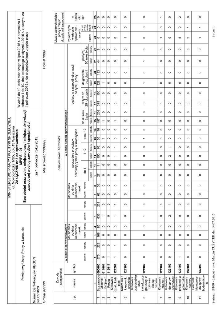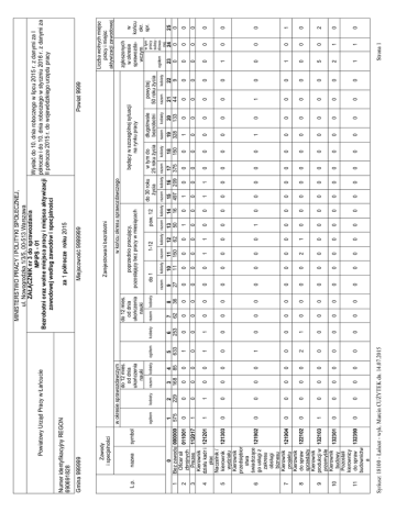 0 Bez zawodu Oficer sił zbrojnych Prezes Kierownik działu kadr i płac Naczelnik / kierownik wydziału Kierownik przedsiębior stwa świadczące go usługi z zakresu obsługi biznesu Kierownik projektu Kierownik do spraw sprzedaży Kierownik produkcji w przemyśle Kierownik budowy Pozostali kierownicy do spraw budownictw a nazwa 132390 132301 132103 122102 121904 121902 121303 121201 112017 011001 000000 0 0 1 0 0 0 0 1 1 0 1 575 ogółem 0 0 0 0 0 0 0 1 0 0 2 229 kobiety 0 0 0 0 0 0 0 0 0 0 3 168 0 0 0 0 0 0 0 0 0 0 4 85 razem kobiety 0 0 0 2 0 1 0 1 0 1 5 633 ogółem Syriusz: 18100 - Łańcut - wyk. Marcin CUŻYTEK dn. 14.07.2015 11 10 9 8 7 6 5 4 3 2 1 L.p. w okresie sprawozdawczym do 12 mies. od dnia symbol ukończenia nauki Zawody i specjalności Gmina 999999 Numer identyfikacyjny REGON 690691828 Powiatowy Urząd Pracy w Łańcucie 0 0 0 1 0 0 0 1 0 0 6 253 kobiety 0 0 0 0 0 0 0 0 0 0 7 62 razem 0 0 0 0 0 0 0 0 0 0 8 36 kobiety do 12 mies. od dnia ukończenia nauki 0 0 0 0 0 0 0 0 0 0 9 27 razem 1-12 pow. 12 do 30 roku życia 0 0 0 0 0 0 0 0 0 0 10 11 0 0 0 2 0 0 0 1 0 0 11 150 0 0 0 1 0 0 0 1 0 0 12 62 0 0 0 0 0 1 0 0 0 1 13 50 0 0 0 0 0 0 0 0 0 0 14 16 0 0 0 0 0 0 0 1 0 1 15 497 0 0 0 0 0 0 0 1 0 0 16 209 0 0 0 0 0 0 0 0 0 0 17 375 0 0 0 0 0 0 0 0 0 0 18 150 kobiety w tym do 25 roku życia 0 0 0 0 0 1 0 0 0 1 19 328 razem 0 0 0 0 0 0 0 0 0 0 20 133 kobiety długotrwale bezrobotni 0 0 0 0 0 1 0 0 0 0 21 44 razem 0 0 0 0 0 0 0 0 0 0 22 9 kobiety powyżej 50 roku życia Powiat 9999 będący w szczególnej sytuacji na rynku pracy kobiety razem kobiety razem kobiety razem kobiety razem do 1 poprzednio pracujący, pozostający bez pracy w miesiącach w końcu okresu sprawozdawczego Zarejestrowani bezrobotni Miejscowość 9999999 za 1 półrocze roku 2015 1 1 0 0 0 0 0 0 0 0 24 0 Strona 1 1 2 5 0 1 0 1 0 0 0 23 0 ogółem w tym pracy subsydiowanej zgłoszonych w okresie sprawozdawczym 0 0 2 0 1 0 0 0 0 0 25 0 w końcu okr. spr. Liczba wolnych miejsc pracy i miejsc aktywizacji zawodowej MINISTERSTWO PRACY I POLITYKI SPOŁECZNEJ, ul. Nowogrodzka 1/3/5, 00-513 Warszawa ZAŁĄCZNIK nr 3 do sprawozdania Wysłać do 10. dnia roboczego w lipcu 2015 r. z danymi za I MPiPS - 01 półrocze i do 10. dnia roboczego w styczniu 2016 r. z danymi za Bezrobotni oraz wolne miejsca pracy i miejsca aktywizacji II półrocze 2015 r. do wojewódzkiego urzędu pracy zawodowej według zawodów i specjalności Zawiadowca stacji Kierownik lokalu gastronomic znego Kierownik sklepu / supermarket u Fizyk Chemik Chemik technologia chemiczna Geograf Matematyk Biolog Biotechnolo g Doradca rolniczy Inżynier leśnictwa Inżynier ogrodnictwa Inżynier rolnictwa Inżynier zootechniki Specjalista ochrony środowiska Inżynier organizacji i planowania produkcji Specjalista kontroli jakości Towarozna wca Pozostali inżynierowie do spraw przemysłu i produkcji Inżynier budownictw abudownictw o ogólne Inżynier budownictw abudownictw o przemysłow e 214203 214202 214190 214110 214109 214102 213303 213207 213205 213204 213203 213201 213106 211402 212002 213105 211302 211103 211301 142004 141202 132407 0 10 0 2 3 1 4 1 13 2 1 0 6 2 4 2 5 3 2 1 1 0 0 6 0 1 3 1 3 0 9 1 1 0 5 0 4 2 4 1 2 1 1 0 0 4 0 1 2 1 0 0 2 0 0 0 3 0 2 0 1 0 1 0 0 0 0 3 0 0 2 1 0 0 2 0 0 0 2 0 2 0 1 0 1 0 0 0 0 11 0 4 1 2 2 2 10 1 2 0 4 0 2 2 2 2 3 1 0 1 Syriusz: 18100 - Łańcut - wyk. Marcin CUŻYTEK dn. 14.07.2015 33 32 31 30 29 28 27 26 25 24 23 22 21 18 19 20 17 15 16 14 13 12 0 4 0 2 1 2 1 0 7 0 2 0 4 0 1 2 1 1 3 1 0 0 0 3 0 1 1 1 0 0 1 0 0 0 1 0 0 0 0 0 1 0 0 0 0 1 0 0 1 1 0 0 1 0 0 0 1 0 0 0 0 0 1 0 0 0 0 1 0 0 0 0 0 0 1 0 0 0 1 0 1 0 0 0 0 0 0 0 0 1 0 0 0 0 0 0 0 0 0 0 1 0 1 0 0 0 0 0 0 0 0 5 0 1 0 0 1 1 3 1 1 0 1 0 0 2 2 2 1 1 0 0 0 1 0 1 0 0 1 0 2 0 1 0 1 0 0 2 1 1 1 1 0 0 0 3 0 0 0 1 0 0 1 0 1 0 0 0 0 0 0 0 0 0 0 1 0 1 0 0 0 1 0 0 0 0 1 0 0 0 0 0 0 0 0 0 0 0 0 4 0 3 1 1 2 1 6 0 1 0 3 0 1 1 1 1 3 1 0 0 0 2 0 1 1 1 1 0 6 0 1 0 3 0 0 1 1 0 3 1 0 0 0 1 0 0 0 1 0 0 1 0 0 0 2 0 0 0 0 0 1 0 0 0 0 0 0 0 0 1 0 0 1 0 0 0 2 0 0 0 0 0 1 0 0 0 0 4 0 1 0 1 0 1 2 1 1 0 2 0 1 0 0 0 2 0 0 1 0 1 0 1 0 1 0 0 1 0 1 0 2 0 0 0 0 0 2 0 0 0 0 0 0 0 0 0 0 0 3 0 0 0 0 0 0 0 0 0 0 0 0 0 0 0 0 0 0 0 0 0 0 0 0 0 0 0 0 0 0 0 0 0 0 0 0 0 1 0 2 0 1 0 0 0 0 2 0 0 0 0 0 0 0 0 0 0 Strona 2 1 0 3 0 2 0 1 0 0 0 0 2 0 0 0 0 0 0 0 0 0 0 1 0 0 0 0 0 0 0 0 0 0 0 0 0 0 0 0 0 0 0 0 0 Inżynier budowy dróg Inżynier geotechnik Inżynier inżynierii środowiska gospodarka wodna i hydrologia Inżynier inżynierii środowiska instalacje sanitarne Inżynier inżynierii środowiska oczyszczani e miast i gospodarka odpadami Inżynier inżynierii środowiska systemy wodociągow ei kanalizacyjn e Pozostali inżynierowie inżynierii środowiska Inżynier mechanik maszyny i urządzenia do obróbki metali Inżynier mechanik maszyny i urządzenia energetyczn e Inżynier mechanik maszyny i urządzenia przemysłow e Inżynier mechanik środki transportu 214406 214404 214403 214402 214390 214306 214305 214303 214302 214209 214207 1 1 0 1 2 2 1 3 1 1 1 0 0 0 0 2 2 0 2 0 1 1 0 0 0 0 0 1 0 1 0 0 0 0 0 0 0 0 1 0 0 0 0 0 1 1 0 2 2 1 1 4 1 1 1 Syriusz: 18100 - Łańcut - wyk. Marcin CUŻYTEK dn. 14.07.2015 44 43 42 41 40 39 38 37 36 35 34 0 1 0 0 2 1 0 2 0 1 1 0 0 0 0 0 0 0 1 0 0 0 0 0 0 0 0 0 0 0 0 0 0 0 0 0 0 0 0 0 1 0 1 0 0 0 0 0 0 0 0 1 0 1 0 0 0 0 2 1 1 0 1 1 0 1 0 0 0 0 1 1 0 0 0 0 1 0 1 0 0 1 0 0 1 0 0 0 0 1 0 0 1 0 0 1 0 0 0 0 0 0 1 1 0 0 2 0 1 1 0 0 0 0 1 0 0 1 0 1 1 0 0 0 0 0 0 0 0 0 0 0 0 0 0 0 0 0 0 0 0 0 0 1 1 0 0 1 0 0 2 0 0 0 0 1 0 0 1 0 0 1 0 0 0 1 0 0 0 0 0 0 0 1 0 0 0 0 0 0 0 0 0 0 0 0 0 0 0 1 0 1 1 0 0 0 0 0 Strona 3 0 0 1 0 1 1 0 0 0 0 0 0 0 0 0 0 0 0 0 0 0 0 Inżynier mechanizacj i rolnictwa Pozostali inżynierowie mechanicy Inżynier technologii chemicznej Inżynier technologii żywności Pozostali inżynierowie górnictwa i metalurgii Inżynier automatyki i robotyki Inżynier energetyki Inżynier gospodarki przestrzenn ej Inżynier włókiennik Inżynier inżynierii materiałowej In