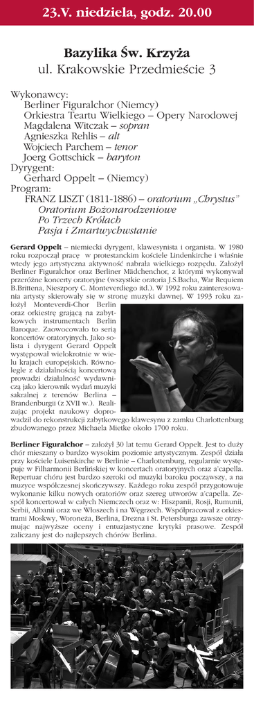 23.V. niedziela, godz. 20.00 Bazylika Św. Krzyża ul. Krakowskie Przedmieście 3 Wykonawcy: Berliner Figuralchor (Niemcy) Orkiestra Teartu Wielkiego – Opery Narodowej Magdalena Witczak – sopran Agnieszka Rehlis – alt Wojciech Parchem – tenor Joerg Gottschick – baryton Dyrygent: Gerhard Oppelt – (Niemcy) Program: FRANZ LISZT (1811-1886) – oratorium „Chrystus” Oratorium Bożonarodzeniowe Po Trzech Królach Pasja i Zmartwychwstanie Gerard Oppelt – niemiecki dyrygent, klawesynista i organista. W 1980 roku rozpoczął pracę w protestanckim kościele Lindenkirche i właśnie wtedy jego artystyczna aktywność nabrała wielkiego rozpędu. Założył Berliner Figuralchor oraz Berliner Mädchenchor, z którymi wykonywał przeróżne koncerty oratoryjne (wszystkie oratoria J.S.Bacha, War Requiem B.Brittena, Nieszpory C. Monteverdiego itd.). W 1992 roku zainteresowania artysty skierowały się w stronę muzyki dawnej. W 1993 roku założył Monteverdi-Chor Berlin oraz orkiestrę grającą na zabytkowych instrumentach Berlin Baroque. Zaowocowało to serią koncertów oratoryjnych. Jako solista i dyrygent Gerard Oppelt występował wielokrotnie w wielu krajach europejskich. Równolegle z działalnością koncertową prowadzi działalność wydawniczą jako kierownik wydań muzyki sakralnej z terenów Berlina – Brandenburgii (z XVII w.). Realizując projekt naukowy doprowadził do rekonstrukcji zabytkowego klawesynu z zamku Charlottenburg zbudowanego przez Michaela Mietke około 1700 roku. Berliner Figuralchor – założył 30 lat temu Gerard Oppelt. Jest to duży chór mieszany o bardzo wysokim poziomie artystycznym. Zespół działa przy kościele Luisenkirche w Berlinie – Charlottenburg, regularnie występuje w Filharmonii Berlińskiej w koncertach oratoryjnych oraz a’capella. Repertuar chóru jest bardzo szeroki od muzyki baroku począwszy, a na muzyce współczesnej skończywszy. Każdego roku zespół przygotowuje wykonanie kilku nowych oratoriów oraz szereg utworów a’capella. Zespół koncertował w całych Niemczech oraz w: Hiszpanii, Rosji, Rumunii, Serbii, Albanii oraz we Włoszech i na Węgrzech. Współpracował z orkiestrami Moskwy, Woroneża, Berlina, Drezna i St. Petersburga zawsze otrzymując najwyższe oceny i entuzjastyczne krytyki prasowe. Zespół zaliczany jest do najlepszych chórów Berlina.