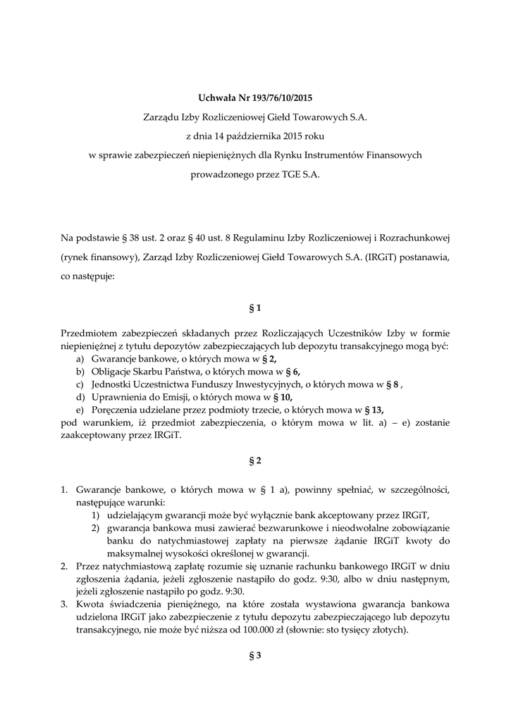 Uchwała Nr 193/76/10/2015 Zarządu Izby Rozliczeniowej Giełd Towarowych S.A. z dnia 14 października 2015 roku w sprawie zabezpieczeń niepieniężnych dla Rynku Instrumentów Finansowych prowadzonego przez TGE S.A. Na podstawie § 38 ust. 2 oraz § 40 ust. 8 Regulaminu Izby Rozliczeniowej i Rozrachunkowej (rynek finansowy), Zarząd Izby Rozliczeniowej Giełd Towarowych S.A. (IRGiT) postanawia, co następuje: §1 Przedmiotem zabezpieczeń składanych przez Rozliczających Uczestników Izby w formie niepieniężnej z tytułu depozytów zabezpieczających lub depozytu transakcyjnego mogą być: a) Gwarancje bankowe, o których mowa w § 2, b) Obligacje Skarbu Państwa, o których mowa w § 6, c) Jednostki Uczestnictwa Funduszy Inwestycyjnych, o których mowa w § 8 , d) Uprawnienia do Emisji, o których mowa w § 10, e) Poręczenia udzielane przez podmioty trzecie, o których mowa w § 13, pod warunkiem, iż przedmiot zabezpieczenia, o którym mowa w lit. a) – e) zostanie zaakceptowany przez IRGiT. §2 1. Gwarancje bankowe, o których mowa w § 1 a), powinny spełniać, w szczególności, następujące warunki: 1) udzielającym gwarancji może być wyłącznie bank akceptowany przez IRGiT, 2) gwarancja bankowa musi zawierać bezwarunkowe i nieodwołalne zobowiązanie banku do natychmiastowej zapłaty na pierwsze żądanie IRGiT kwoty do maksymalnej wysokości określonej w gwarancji. 2. Przez natychmiastową zapłatę rozumie się uznanie rachunku bankowego IRGiT w dniu zgłoszenia żądania, jeżeli zgłoszenie nastąpiło do godz. 9:30, albo w dniu następnym, jeżeli zgłoszenie nastąpiło po godz. 9:30. 3. Kwota świadczenia pieniężnego, na które została wystawiona gwarancja bankowa udzielona IRGiT jako zabezpieczenie z tytułu depozytu zabezpieczającego lub depozytu transakcyjnego, nie może być niższa od 100.000 zł (słownie: sto tysięcy złotych). §3 1. Rozliczający Uczestnik Izby proponując złożenie zabezpieczenia w formie gwarancji bankowej, zobowiązany jest do określenia tytułu zabezpieczenia oraz do złożenia w IRGiT projektu dokumentu gwarancji bankowej. 2. Ostateczna akceptacja gwarancji bankowej, jako zabezpieczenia składanego w formie niepieniężnej następuje w formie Uchwały Zarządu IRGiT. Gwarancja zostaje zarejestrowana w Rejestrze Zabezpieczeń Niepieniężnych prowadzonym dla Rynku Instrumentów Finansowych i jest uznawana jako zabezpieczenie po podjęciu Uchwały przez Zarząd IRGiT. §4 1. IRGIT na żądanie Rozliczającego Uczestnika Izby, udziela informacji dotyczącej banków akceptowanych przez IRGiT jako wystawców gwarancji bankowych stanowiących przedmiot zabezpieczenia składanego przez Rozliczającego Uczestnika Izby. 2. W przypadku, gdy w okresie obowiązywania gwarancji bankowej przyjętej na poczet zabezpieczenia bank, który jej udzielił, utracił status banku akceptowanego przez IRGiT, Rozliczający Uczestnik Izby, na wezwanie IRGiT zobowiązany jest do niezwłocznego, nie później niż w ciągu 7 dni roboczych od dnia wystosowania żądania, złożenia dokumentu gwarancji bankowej udzielonej przez inny bank, spełniającej warunki określone w § 2 oraz § 3, lub niezwłocznego złożenia zabezpieczenia w innej formie akceptowanej przez IRGiT. §5 Rozliczający Uczestnik Izby, który złożył zabezpieczenie w formie gwarancji bankowej, jest zobowiązany, najpóźniej na 5 dni przed upływem okresu obowiązywania tej gwarancji, złożyć nowy dokument gwarancji bankowej, aneks do obowiązującej gwarancji lub oświadczenie, iż zabezpieczenie to zostanie przez niego złożone w innej dopuszczalnej formie. W przypadku niespełnienia tego warunku IRGiT ma prawo do zaprzestania uznawania gwarancji oraz wykreślenia gwarancji z Rejestru Zabezpieczeń Niepieniężnych prowadzonego dla Rynku Instrumentów Finansowych. §6 1. IRGiT akceptuje jako zabezpieczenie niepieniężne zobowiązań z tytułu depozytów zabezpieczających lub depozytu transakcyjnego Obligacje Skarbu Państwa. 2. Rozliczający Uczestnik Izby składający zabezpieczenie w formie Obligacji Skarbu Państwa, dokonuje ich transferu ze swojego konta depozytowego na konto depozytowe IRGiT w Krajowym Depozycie Papierów Wartościowych. Ponadto do IRGiT przekazywana jest podpisana przez Rozliczającego Uczestnika Izby Umowa przewłaszczenia na zabezpieczenie (zgodnie z wzorem obowiązującym w IRGiT). 3. Zaliczenie na poczet zabezpieczeń Obligacji Skarbu Państwa, następuje następnego dnia po podpisaniu umowy przewłaszczenia na zabezpieczenie, z zastrzeżeniem, iż przed zawarciem umowy przewłaszczenia na zabezpieczenie Obligacje Skarbu Państwa, będące przedmiotem przewłaszczenia zostaną przekazane na konto depozytowe IRGiT. 4. Obligacje Skarbu Państwa przestają być uznawane jako zabezpieczenie niepieniężne począwszy od drugiego dnia przed dniem ich wykupu. §7 1. Zaliczeniu do wartości zabezpieczeń składanych w formie Obligacji Skarbu Państwa, podlega część wartości rynkowej tych obligacji ustalana w następujący sposób: 𝑾𝒊 = 𝑳𝒊 ∗ 𝑾𝒓𝒊 ∗ 𝑼𝒊 gdzie: 𝑾𝒊 - wartość zabezpieczenia w danym rodzaju Obligacji Skarbu Państwa, 𝑳𝒊 – liczba Obligacji Skarbu Państwa, określonego rodzaju, 𝑾𝒓𝒊 - wartość rynkowa Obligacji Skarbu Państwa, określonego rodzaju, 𝑼𝒊 - współczynnik uznania dla danego rodzaju Obligacji Skarbu Państwa, podawany w komunikatach IRGiT. 2. Wartość 𝑾𝒊 sumuje się z innymi zabezpieczeniami wniesionymi przez danego Rozliczającego Uczestnika Izby lub jego klienta w formie niepieniężnej. §8 1. IRGiT akceptuje jako zabezpieczenie niepieniężne zobowiązań z tytułu depozytów zabezpieczających oraz transakcyjnych Jednostki Uczestnictwa Funduszy Inwestycyjnych spełniające następujące warunki: a) Emitent instrumentu ma siedzibę w Polsce i charakteryzuje się niskim ryzykiem kredytowym, b) Instrument charakteryzuje się niskim ryzykiem rynkowym stwierdzon