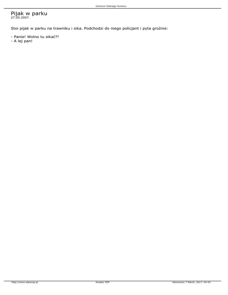 Centrum Dobrego Humoru Pijak w parku 27.05.2007. Stoi pijak w parku na trawniku i sika. Podchodzi do niego policjant i pyta groźnie: - Panie! Wolno tu sikać?! - A lej pan! http://www.edowcip.pl Kreator PDF Utworzono 7 March, 2017, 04:43