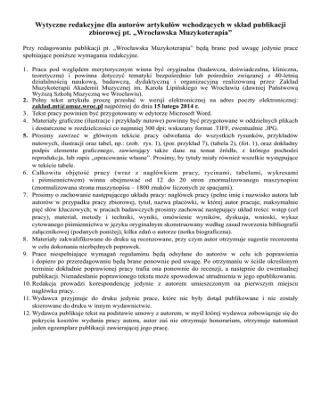 ! Wytyczne redakcyjne dla autorów artykułów wchodzących w skład publikacji zbiorowej pt. „Wrocławska Muzykoterapia” Przy redagowaniu publikacji pt. „Wrocławska Muzykoterapia” będą brane pod uwagę jedynie prace spełniające poniższe wymagania redakcyjne. ! 1. Praca pod względem merytorycznym winna być oryginalna (badawcza, doświadczalna, kliniczna, teoretyczna) i powinna dotyczyć tematyki bezpośrednio lub pośrednio związanej z 40-letnią działalnością naukową, badawczą, dydaktyczną i organizacyjną realizowaną przez Zakład Muzykoterapii Akademii Muzycznej im. Karola Lipińskiego we Wrocławiu (dawniej Państwową Wyższą Szkołą Muzyczną we Wrocławiu). 2. Pełny tekst artykułu proszę przesłać w wersji elektronicznej na adres poczty elektronicznej: [email protected] najpóźniej do dnia 15 lutego 2014 r. 3. Tekst pracy powinien być przygotowany w edytorze Microsoft Word. 4. Materiały graficzne (ilustracje i przykłady nutowe) powinny być przygotowane w oddzielnych plikach i dostarczone w rozdzielczości co najmniej 300 dpi; wskazany format .TIFF, ewentualnie .JPG. 5. Prosimy zawrzeć w głównym tekście pracy odwołania do wszystkich rysunków, przykładów nutowych, ilustracji oraz tabel, np.: (zob. rys. 1), (por. przykład 7), (tabela 2), (fot. 1), oraz dokładny podpis elementu graficznego, zawierający także dane na temat źródła, z którego pochodzi reprodukcja, lub zapis „opracowanie własne”. Prosimy, by tytuły miały również wszelkie występujące w tekście tabele. 6. Całkowita objętość pracy (wraz z nagłówkiem pracy, rycinami, tabelami, wykresami i piśmiennictwem) winna obejmować od 12 do 20 stron znormalizowanego maszynopisu (znormalizowana strona maszynopisu – 1800 znaków liczonych ze spacjami). 7. Prosimy o zachowanie następującego układu pracy: nagłówek pracy (pełne imię i nazwisko autora lub autorów w przypadku pracy zbiorowej, tytuł, nazwa placówki, w której autor pracuje, maksymalnie pięć słów kluczowych; w pracach badawczych prosimy zachować następujący układ treści: wstęp (cel pracy), materiał, metody i techniki, wyniki, omówienie wyników, dyskusja, wnioski, wykaz cytowanego piśmiennictwa w języku oryginalnym skonstruowany według zasad tworzenia bibliografii załącznikowej (podanych poniżej), kilka zdań o autorze (notka biograficzna). 8. Materiały zakwalifikowane do druku są recenzowane, przy czym autor otrzymuje sugestie recenzenta w celu dokonania niezbędnych poprawek. 9. Prace niespełniające wymagań regulaminu będą odsyłane do autorów w celu ich poprawienia i dopiero po przeredagowaniu będą brane ponownie pod uwagę. Po otrzymaniu w ściśle określonym terminie dokładnie poprawionej pracy trafia ona ponownie do recenzji, a następnie do ewentualnej publikacji. Nienadesłanie poprawionego tekstu może spowodować utrudnienia w jego opublikowaniu. 10. Redakcja prowadzi korespondencję jedynie z autorem umieszczonym na pierwszym miejscu nagłówka pracy. 11. Wydawca przyjmuje do druku jedynie prace, które nie były dotąd publikowane i nie zostały skierowane do druku w innym wydawnictwie. 12. Wydawca publikuje tekst na podstawie umowy z autorem, w myśl której wydawca zobowiązuje się do pokrycia kosztów wydania pracy autora, autor zaś nie otrzymuje honorarium, otrzymuje natomiast jeden egzemplarz publikacji zawierającej jego pracę. ! ! ! I. ! Konwencja tworzenia bibliografii załącznikowej Szczegółowe zasady tworzenia opisu bibliograficznego 1. Książka jednego autora Natanson Tadeusz, Wstęp do nauki o muzykoterapii. Wrocław–Warszawa–Kraków–Gdańsk 1979. Nie ma potrzeby podawania wydawnictwa, wystarczy miejsce wydania. ! 2. Praca zbiorowa Życie muzyczne Wrocławia (1945–1995). Red. Maria Zduniak i zespół. „Zeszyt Naukowy Akademii Muzycznej im. Karola Lipińskiego we Wrocławiu” nr 75. Wrocław 1999. ! 3. Artykuł w publikacji zbiorowej Natanson Tadeusz, W stronę ilościowej oceny jakości dzieła muzycznego. W: Problemy wychowania muzycznego. Red. Helena Danel-Bobrzyk. „Prace Naukowe Uniwersytetu Śląskiego” nr 841. Katowice 1987, s. 49–67. W szczególności w przypadku artykułu z Zeszytu Naukowego Akademii Muzycznej we Wrocławiu stosujemy zapis: Galińska Elżbieta, Podstawy teoretyczne muzykoterapii. W: V Ogólnopolskie Spotkanie współpracowników Zakładu Muzykoterapii (13–14 listopada 1976. Red. Tadeusz Natanson, Grażyna Pstrokońska-Nawratil. „Zeszyt Naukowy Akademii Muzycznej im. Karola Lipińskiego we Wrocławiu” nr 17. Wrocław 1978, s. 81–98. ! 4. Artykuł w czasopiśmie Cesarz Helena, O muzyce i muzykoterapii. „Muzykoterapia Polska” t. 2 (2003) nr 1, s. 7– 13. Krout Robert E., Music listening to facilitate relaxation and promote wellness: Integrated aspects of our neurophysiological responses to music. „The Arts in Psychotherapy” Vol. 34 (2007) No. 2, s. 134–141. ! Przed tytułem czasopisma – w przeciwieństwie do tytułu pracy zbiorowej – nie piszemy: „W:” W przypadku dzienników nie trzeba podawać numeru strony. ! 5. Hasło w encyklopedii, leksykonie etc.: ! ! ! Schaal Richard, Fuchs Alois. W: Die Musik in Geschichte und Gegenwart. Personenteil. T. 7. Red. Ludwig Finscher. Kassel–Basel 2002, szp. 226–228. Rozróżniamy strony i szpalty, w powyższym przypadku (Die Musik in Geschichte und Gegenwart) mamy właśnie szpalty. 6. Rękopis W przypadku rękopisów podajemy sygnaturę i miejsce przechowywania: Schnabel Joseph Ignaz, Sztambuch z lat 1803–1862. Rkps. Biblioteka Uniwersytecka w Warszawie, sygn. Mus. 2. ! 7. Praca magisterska, doktorska Spólny Małgorzata, Muzykoterapia we wrocławskiej Akademii Muzycznej – pionierska specjalność w Polsce 1972–1998. Praca magisterska [wydruk komputerowy]. Akademia Muzyczna im. Karola Lipińskiego we Wrocławiu. Wrocław 1999. ! ! II. ! Tworzenie bibliografii załącznikowej Kolejne pozycje bibliografii załącznikowej powinny 