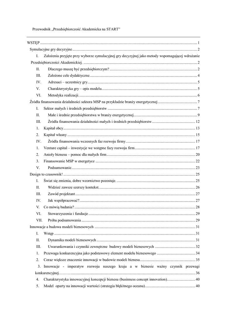 Przewodnik „Przedsiębiorczość Akademicka na START” WSTĘP ............................................................................................................................................................ 1 Symulacyjne gry decyzyjne ............................................................................................................................ 2 I. Założenia przyjęte przy wyborze symulacyjnej gry decyzyjnej jako metody wspomagającej wdrażanie Przedsiębiorczości Akademickiej. ................................................................................................................. 2 II. Dlaczego muszę być przedsiębiorczym? ....................................................................................... 2 III. Założone cele dydaktyczne........................................................................................................... 4 IV. Adresaci – uczestnicy gry............................................................................................................. 5 V. Charakterystyka gry – opis modelu. .............................................................................................. 5 VI. Metodyka realizacji. ..................................................................................................................... 6 Źródła finansowania działalności sektora MSP na przykładzie branży energetycznej ....................................... 7 I. Sektor małych i średnich przedsiębiorstw ......................................................................................... 7 II. Małe i średnie przedsiębiorstwa w branży energetycznej ............................................................... 9 III. Źródła finansowania działalności małych i średnich przedsiębiorstw ........................................... 12 1. Kapitał obcy ................................................................................................................................... 13 2. Kapitał własny ............................................................................................................................... 15 IV. Źródła finansowania wczesnych faz rozwoju firmy ..................................................................... 17 1. Venture capital – inwestycje we wstępne fazy rozwoju firm ............................................................ 17 2. Anioły biznesu – pomoc dla małych firm ........................................................................................ 20 3. Finansowanie MSP w energetyce ................................................................................................... 22 V. Podsumowanie ........................................................................................................................... 23 Design to czasownik! ................................................................................................................................... 25 I. Świat się zmienia, dobre wzornictwo pozostaje. .............................................................................. 25 II. Widzieć zawsze szerszy kontekst. ............................................................................................... 26 III. Zawód projektant ....................................................................................................................... 27 IV. Jak współpracować? ................................................................................................................... 27 V. Co mówią badania? ........................................................................................................................ 28 VI. Stowarzyszenia i fundacje .......................................................................................................... 29 VII. Próba podsumowania ................................................................................................................. 29 Innowacje a budowa modeli biznesowych .................................................................................................... 31 I. Wstęp ............................................................................................................................................ 31 II. Dynamika modeli biznesowych .................................................................................................. 31 III. Uwarunkowania i czynniki zewnętrzne budowy modeli biznesowych ........................................ 32 1. Przewaga konkurencyjna jako podstawowy element modelu biznesowego ...................................... 34 2. Coraz większe znaczenie innowacji w budowie modeli biznesu....................................................... 35 3. Innowacje - imperatyw rozwoju naszego kraju a w biznesie ważny czynnik przewagi konkurencyjnej……… ............................................................................................................................ 36 4. Charakterystyka innowacyjnej koncepcji biznesu (businness concept innovation). ........................... 40 5. Model oparty na innowacji wartości (strategia błękitnego oceanu).................................................. 40 Przewodnik „Przedsiębiorczość Akademicka na START” IV. Podsumowanie . ......................................................................................................................... 43 Instrumenty zarządzania a wzrost efektywności i konkurencyjności organizacji ............................................ 44 I. Zarządzanie wartością .................................................................................................................... 44 1. Narzędzia zarządzania wartością firmy wartością ............................................................................ 46 2. Monitoring finansowy wartością ..................................................................................................... 46 3. Controlling i