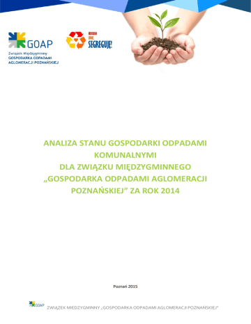 ANALIZA STANU GOSPODARKI ODPADAMI KOMUNALNYMI DLA ZWIĄZKU MIĘDZYGMINNEGO „GOSPODARKA ODPADAMI AGLOMERACJI POZNAŃSKIEJ” ZA ROK 2014 Poznań 2015 ZWIĄZEK MIEDZYGMINNY „GOSPODARKA ODPADAMI AGLOMERACJI POZNAŃSKIEJ” Analiza stanu gospodarki odpadami komunalnymi dla ZM GOAP za rok 2014 Analizę opracował Dział Gospodarki Komunalnej w składzie: Katarzyna Jauksz – Zalewska Magdalena Tuzel Zaakceptowała: Katarzyna Stróżyk– Kierownik Działu Gospodarki Komunalnej Zatwierdził: Bartosz Wieliński – Dyrektor Biura Związku ZWIĄZEK MIĘDZYGMINNY „GOSPODARKA ODPADAMI AGLOMERACJI POZNAŃSKIEJ” 2 Analiza stanu gospodarki odpadami komunalnymi dla ZM GOAP za rok 2014 Spis treści 1. Wprowadzenie ................................................................................................................................ 4 1.1. Podstawa prawna .................................................................................................................... 4 1.2. Wykaz aktów prawnych .......................................................................................................... 4 1.2.1. Ustawy i rozporządzenia ............................................................................................. 4 1.2.2. Dokumenty strategiczne ..............................................................................................5 2. Charakterystyka ZM GOAP .............................................................................................................. 5 2.1. Gminy członkowskie ZM GOAP ............................................................................................... 6 2.2. Struktura ludności ZM GOAP ................................................................................................... 7 2.3. Liczba złożonych deklaracji...................................................................................................... 8 2.4. Liczba osób ujętych w deklaracjach ........................................................................................ 9 2.5. Procent deklaracji, w których zadeklarowano selektywną zbiórkę odpadów komunalnych 11 3. Możliwości przetwarzania zmieszanych odpadów komunalnych, odpadów zielonych oraz pozostałości z sortowania odpadów komunalnych przeznaczonych do składowania .......................... 12 4. Potrzeby inwestycyjne związane z gospodarowaniem odpadami komunalnymi ......................... 15 4.1. Instalacje dla Regionu II ......................................................................................................... 15 4.1.1. Instalacja Termicznego Przekształcania Odpadów Komunalnych (ITPOK).................... 15 4.1.2. Instalacja do odzysku odpadów biodegradowalnych - biogazowania .......................... 18 4.1.3. Składowisko odpadów w Suchym Lesie ...................................................................... 19 4.2. Punkty selektywnego zbierania odpadów komunalnych ...................................................... 20 5. Odpady komunalne wytwarzane na terenie ZM GOAP ................................................................ 22 5.1. Zarys systemu gospodarki odpadami komunalnymi ............................................................. 22 5.2. Źródła powstawania odpadów komunalnych ....................................................................... 24 5.3. Masa wszystkich odpadów komunalnych odebranych na terenie ZM GOAP ....................... 24 5.4. Masa wytworzonych odpadów w podziale na poszczególne frakcje .................................... 26 5.5. Masa wytworzonych odpadów w przeliczeniu na 1 mieszkańca .......................................... 30 5.6. Ilość zmieszanych odpadów komunalnych, odpadów zielonych oraz pozostałości z sortowania odpadów komunalnych przeznaczonych do składowania, odebranych z obszaru ZM GOAP ………………………………………………………………………………………………………………………………………….31 5.6.1. Odpady zmieszane ..................................................................................................... 31 5.6.2. Odpady zielone .......................................................................................................... 34 5.6.3. Pozostałości z sortowania odpadów komunalnych ..................................................... 35 5.7. Masa odebranych surowców wtórnych ................................................................................ 36 5.8. Odpady budowlane i rozbiórkowe ........................................................................................ 37 5.9. Punkty Selektywnej Zbiórki Odpadów Komunalnych (PSZOK) .............................................. 38 6. Koszty poniesione w związku z odbieranie, odzyskiem, recyklingiem i unieszkodliwianiem odpadów komunalnych ......................................................................................................................... 41 Spis Tabel ............................................................................................................................................... 43 Spis Wykresów ...................................................................................................................................... 43 ZWIĄZEK MIĘDZYGMINNY „GOSPODARKA ODPADAMI AGLOMERACJI POZNAŃSKIEJ” 3 Analiza stanu gospodarki odpadami komunalnymi dla ZM GOAP za rok 2014 1. Wprowadzenie 1.1. Podstawa prawna Zgodnie z art. 3 ust. 2 pkt 10 ustawy z dnia 13 września 1996 roku o utrzymaniu czystości i porządku w gminach do zadań własnych gminy należy sporządzanie corocznej analizy stanu gospodarki odpadami komunalnymi, w celu weryfikacji możliwości technicznych i organizacyjnych gminy w zakresie gospodarowania odpadami komunalnymi, w tym: możliwości przetwarzania zmieszanych odpadów komunalnych, odpadów zielonych oraz pozostałości z sortowania odpadów komunalnych przeznaczony