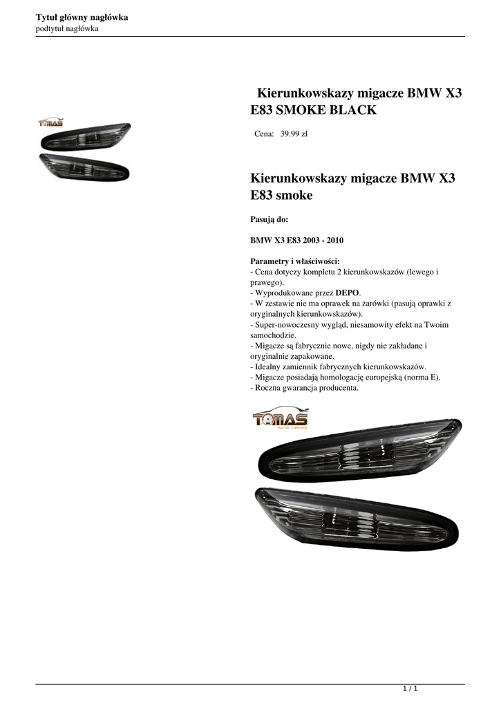 Tytuł główny nagłówka podtytuł nagłówka Kierunkowskazy migacze BMW X3 E83 SMOKE BLACK Cena: 39.99 zł Kierunkowskazy migacze BMW X3 E83 smoke Pasują do: BMW X3 E83 2003 - 2010 Parametry i właściwości: - Cena dotyczy kompletu 2 kierunkowskazów (lewego i prawego). - Wyprodukowane przez DEPO. - W zestawie nie ma oprawek na żarówki (pasują oprawki z oryginalnych kierunkowskazów). - Super-nowoczesny wygląd, niesamowity efekt na Twoim samochodzie. - Migacze są fabrycznie nowe, nigdy nie zakładane i oryginalnie zapakowane. - Idealny zamiennik fabrycznych kierunkowskazów. - Migacze posiadają homologację europejską (norma E). - Roczna gwarancja producenta. 1/1 Powered by TCPDF (www.tcpdf.org)