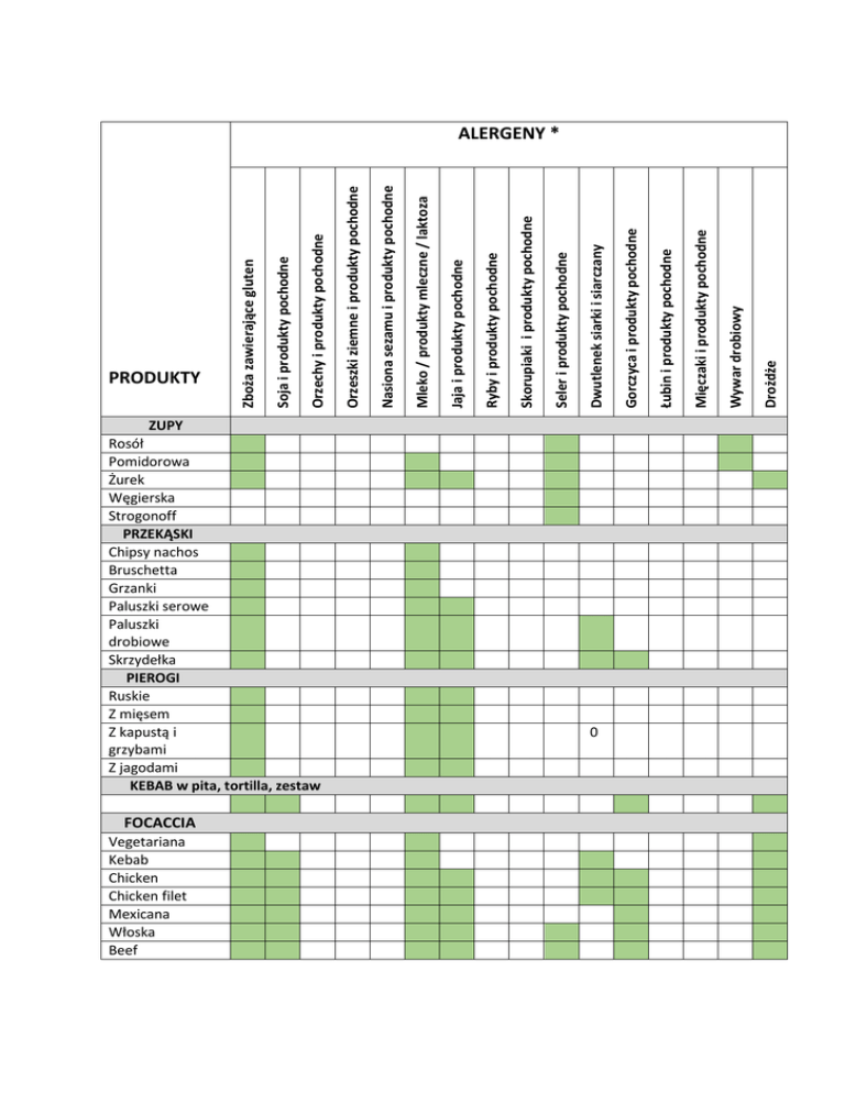 PRODUKTY Vegetariana Kebab Chicken Chicken filet Mexicana Włoska Beef FOCACCIA Rosół Pomidorowa Żurek Węgierska Strogonoff PRZEKĄSKI Chipsy nachos Bruschetta Grzanki Paluszki serowe Paluszki drobiowe Skrzydełka PIEROGI Ruskie Z mięsem Z kapustą i grzybami Z jagodami KEBAB w pita, tortilla, zestaw ZUPY 0 Drożdże Wywar drobiowy Mięczaki i produkty pochodne Łubin i produkty pochodne Gorczyca i produkty pochodne Dwutlenek siarki i siarczany Seler i produkty pochodne Skorupiaki i produkty pochodne Ryby i produkty pochodne Jaja i produkty pochodne Mleko / produkty mleczne / laktoza Nasiona sezamu i produkty pochodne Orzeszki ziemne i produkty pochodne Orzechy i produkty pochodne Soja i produkty pochodne Zboża zawierające gluten ALERGENY * PRODUKTY Beef hot Beef z jajem Beef mexicana Beef double Beef King DANIA OBIADOWE Schab Filet z kurczaka De Volaille Pierś po hawajsku Kotlet farmerski Kotlet góralski Pierś z grilla Łosoś DANIA DLA DZIECI Mały miś Paluszki drobiowe De volaille mini PLACKI Cygański Węgierki PASTY Penne z tuńczykiem Bolognese Carbonara Pesto Lasagne 0 Drożdże Wywar drobiowy Mięczaki i produkty pochodne Łubin i produkty pochodne Gorczyca i produkty pochodne Dwutlenek siarki i siarczany Seler i produkty pochodne Skorupiaki i produkty pochodne Ryby i produkty pochodne Jaja i produkty pochodne Mleko / produkty mleczne / laktoza Nasiona sezamu i produkty pochodne Orzeszki ziemne i produkty pochodne Orzechy i produkty pochodne Soja i produkty pochodne Zboża zawierające gluten ALERGENY * PRODUKTY SAŁATKI Grecka Meksykańska Kebab Cezar Z kurczakiem grillowanym Chicken Z gruszką TROCHĘ MEKSYKU Sombrero Quesadillas z serem Ouesadillas z szynką i serem Quesadillas z kurcz. I serem Quesadillas z camemb. I jalpeno Nachos Burrito classic Burrito meks. Enchiladas Tacos z chilli Tacos z kurczakiem Tacos z krewetkami Fajitas z kurcz. Fajitas z krewetkami 0 0 0 0 0 0 0 0 0 0 0 Drożdże Wywar drobiowy Mięczaki i produkty pochodne Łubin i produkty pochodne Gorczyca i produkty pochodne Dwutlenek siarki i siarczany Seler i produkty pochodne Skorupiaki i produkty pochodne Ryby i produkty pochodne Jaja i produkty pochodne Mleko / produkty mleczne / laktoza Nasiona sezamu i produkty pochodne Orzeszki ziemne i produkty pochodne Orzechy i produkty pochodne Soja i produkty pochodne Zboża zawierające gluten ALERGENY * PRODUKTY DODATKI Ryż Frytki/ziemniaczki Warzywa gotow. Pieczywo czosnkowe Pieczywo czosnk. z serem Sos tzaziki Sos ostry Sos czosnkowy Sos majonezowy Sos barbecue Sos guacamole Surówka z b. kap. Surówka z marchwi Surówka z kap. pekińskiej Surówka z ogórka kisz. Surówka z buraczków Surówka z selera Surówka z pora DESERY Beza 0 0 0 0 0 0 0 Drożdże Wywar drobiowy Mięczaki i produkty pochodne Łubin i produkty pochodne Gorczyca i produkty pochodne Dwutlenek siarki i siarczany Seler i produkty pochodne Skorupiaki i produkty pochodne Ryby i produkty pochodne Jaja i produkty pochodne Mleko / produkty mleczne / laktoza Nasiona sezamu i produkty pochodne Orzeszki ziemne i produkty pochodne Orzechy i produkty pochodne Soja i produkty pochodne Zboża zawierające gluten ALERGENY * Naleśniki z twarogiem Naleśniki z czekoladą 0 0 *Na podstawie deklaracji producenta zawiera O O o. może zawierać