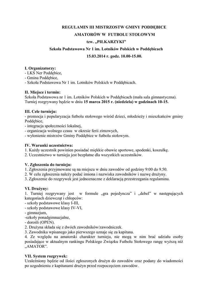REGULAMIN III MISTRZOSTW GMINY PODDĘBICE AMATORÓW W FUTBOLU STOŁOWYM tzw. „PIŁKARZYKI” Szkoła Podstawowa Nr 1 im. Lotników Polskich w Poddębicach 15.03.2014 r. godz. 10.00-15.00. I. Organizatorzy: - LKS Ner Poddębice, - Gmina Poddębice, - Szkoła Podstawowa Nr 1 im. Lotników Polskich w Poddębicach. II. Miejsce i termin: Szkoła Podstawowa nr 1 im. Lotników Polskich w Poddębicach (mała sala gimnastyczna). Turniej rozgrywany będzie w dniu 15 marca 2015 r. (niedziela) w godzinach 10-15. III. Cele turnieju: - promocja i popularyzacja futbolu stołowego wśród dzieci, młodzieży i mieszkańców gminy Poddębice, - integracja społeczności lokalnej, - organizacja wolnego czasu w okresie ferii zimowych, - wyłonienie mistrzów Gminy Poddębice w futbolu stołowym. IV. Warunki uczestnictwa: 1. Każdy uczestnik powinien posiadać miękkie obuwie sportowe, spodenki, koszulkę. 2. Uczestnictwo w turnieju jest bezpłatne dla wszystkich uczestników. V. Zgłoszenia do turnieju: 1. Zgłoszenia przyjmowane są na miejscu w dniu zawodów od godziny 9:00 do 9.50. 2. W celu zgłoszenia należy podać imiona i nazwiska zawodników i nazwę drużyny. 3. Zgłoszenie do rozgrywek jest jednoznaczne z deklaracją przestrzegania regulaminu. VI. Drużyny: 1. Turniej rozgrywany jest w formule „gra pojedyncza” i „debel” w następujących kategoriach dziewcząt i chłopców: - szkoły podstawowe klasy I-III, - szkoły podstawowe klasy IV-VI, - gimnazjum, -szkoły ponadgimnazjalne, - dorośli (OPEN). 2. Drużyna składa się z dwóch zawodników/zawodniczek. 3. Zawodnika wpisanego jako pierwszego uznaje się za kapitana. 4. Ze względu na amatorski charakter turnieju, nie mogą w nim brać udziału osoby posiadające w aktualnym rankingu Polskiego Związku Futbolu Stołowego rangę wyższą niż „AMATOR”. VII. System rozgrywek: Uzależniony będzie od ilości zgłoszonych drużyn do zawodów oraz podany do wiadomości po uzgodnieniu z kapitanami drużyn przed rozpoczęciem zawodów. Turniej zostanie przeprowadzony według uproszczonych przepisów gry omówionych przed rozpoczęciem rozgrywek. Mecze rozgrywane będą do dwóch wygranych setów do 5 pkt. (bramek). Kontakt: 694483071 lub e-mail : [email protected]. Organizatorzy