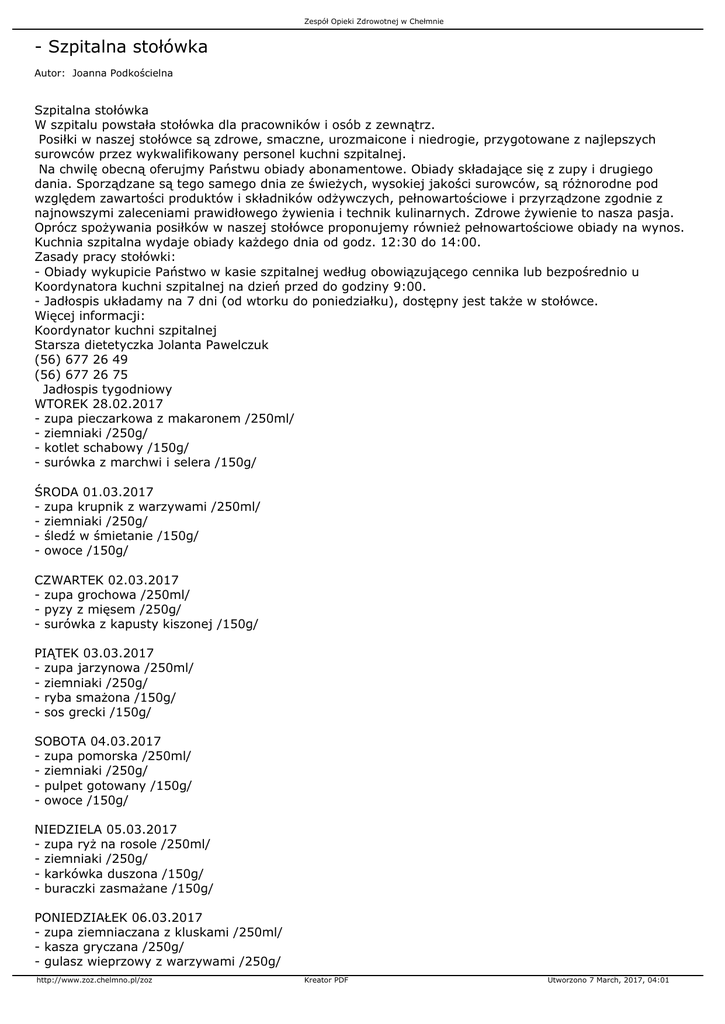 Zespół Opieki Zdrowotnej w Chełmnie - Szpitalna stołówka Autor: Joanna Podkościelna Szpitalna stołówka W szpitalu powstała stołówka dla pracowników i osób z zewnątrz. Posiłki w naszej stołówce są zdrowe, smaczne, urozmaicone i niedrogie, przygotowane z najlepszych surowców przez wykwalifikowany personel kuchni szpitalnej. Na chwilę obecną oferujmy Państwu obiady abonamentowe. Obiady składające się z zupy i drugiego dania. Sporządzane są tego samego dnia ze świeżych, wysokiej jakości surowców, są różnorodne pod względem zawartości produktów i składników odżywczych, pełnowartościowe i przyrządzone zgodnie z najnowszymi zaleceniami prawidłowego żywienia i technik kulinarnych. Zdrowe żywienie to nasza pasja. Oprócz spożywania posiłków w naszej stołówce proponujemy również pełnowartościowe obiady na wynos. Kuchnia szpitalna wydaje obiady każdego dnia od godz. 12:30 do 14:00. Zasady pracy stołówki: - Obiady wykupicie Państwo w kasie szpitalnej według obowiązującego cennika lub bezpośrednio u Koordynatora kuchni szpitalnej na dzień przed do godziny 9:00. - Jadłospis układamy na 7 dni (od wtorku do poniedziałku), dostępny jest także w stołówce. Więcej informacji: Koordynator kuchni szpitalnej Starsza dietetyczka Jolanta Pawelczuk (56) 677 26 49 (56) 677 26 75 Jadłospis tygodniowy WTOREK 28.02.2017 - zupa pieczarkowa z makaronem /250ml/ - ziemniaki /250g/ - kotlet schabowy /150g/ - surówka z marchwi i selera /150g/ ŚRODA 01.03.2017 - zupa krupnik z warzywami /250ml/ - ziemniaki /250g/ - śledź w śmietanie /150g/ - owoce /150g/ CZWARTEK 02.03.2017 - zupa grochowa /250ml/ - pyzy z mięsem /250g/ - surówka z kapusty kiszonej /150g/ PIĄTEK 03.03.2017 - zupa jarzynowa /250ml/ - ziemniaki /250g/ - ryba smażona /150g/ - sos grecki /150g/ SOBOTA 04.03.2017 - zupa pomorska /250ml/ - ziemniaki /250g/ - pulpet gotowany /150g/ - owoce /150g/ NIEDZIELA 05.03.2017 - zupa ryż na rosole /250ml/ - ziemniaki /250g/ - karkówka duszona /150g/ - buraczki zasmażane /150g/ PONIEDZIAŁEK 06.03.2017 - zupa ziemniaczana z kluskami /250ml/ - kasza gryczana /250g/ - gulasz wieprzowy z warzywami /250g/ http://www.zoz.chelmno.pl/zoz Kreator PDF Utworzono 7 March, 2017, 04:01 Zespół Opieki Zdrowotnej w Chełmnie - maślanka /200ml/ Uwaga! Jadłospis wciągu tygodnia może ulec zmianom! Opracowała - Dietetyczka Jolanta Pawelczuk Smacznego! http://www.zoz.chelmno.pl/zoz Kreator PDF Utworzono 7 March, 2017, 04:01