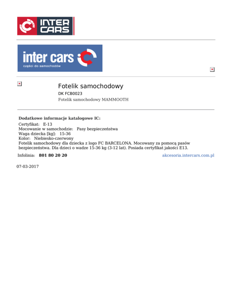 Fotelik samochodowy DK FCB0023 Fotelik samochodowy MAMMOOTH Dodatkowe informacje katalogowe IC: Certyfikat: E-13 Mocowanie w samochodzie: Pasy bezpieczeństwa Waga dziecka [kg]: 15-36 Kolor: Niebiesko-czerwony Fotelik samochodowy dla dziecka z logo FC BARCELONA. Mocowany za pomocą pasów bezpieczeństwa. Dla dzieci o wadze 15-36 kg (3-12 lat). Posiada certyfikat jakości E13. Infolinia: 801 80 20 20 07-03-2017 akcesoria.intercars.com.pl