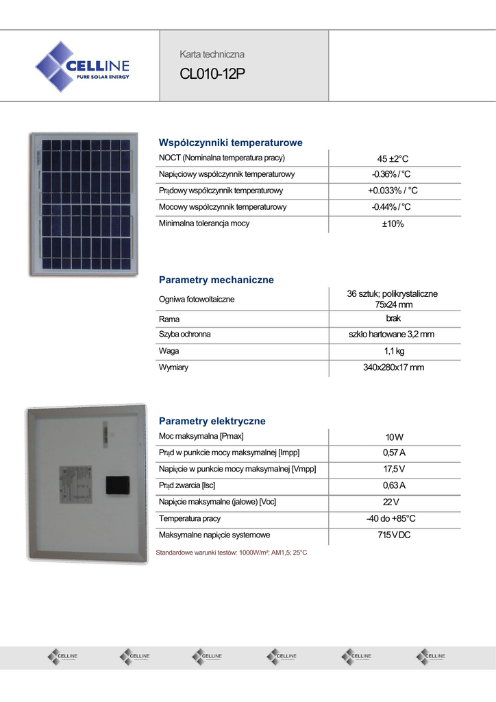 Karta techniczna CL010-12P Współczynniki temperaturowe 45 ±2°C NOCT (Nominalna temperatura pracy) -0.36% / °C Napięciowy współczynnik temperaturowy Prądowy współczynnik temperaturowy +0.033% / °C Mocowy współczynnik temperaturowy -0.44% / °C ±10% Minimalna tolerancja mocy Parametry mechaniczne Rama 36 sztuk; polikrystaliczne 75x24 mm brak Szyba ochronna szkło hartowane 3,2 mm Ogniwa fotowoltaiczne 1,1 kg Waga 340x280x17 mm Wymiary 34 0 Parametry elektryczne Moc maksymalna [Pmax] 10 W Prąd w punkcie mocy maksymalnej [Impp] 0,57 A Napięcie w punkcie mocy maksymalnej [Vmpp] 17,5 V Prąd zwarcia [Isc] 0,63 A Napięcie maksymalne (jałowe) [Voc] 22 V -40 do +85°C Temperatura pracy 715 V DC Maksymalne napięcie systemowe 280 CELLINE PURE SOLAR ENERGY Standardowe warunki testów: 1000W/m²; AM1,5; 25°C CELLINE PURE SOLAR ENERGY CELLINE PURE SOLAR ENERGY CELLINE PURE SOLAR ENERGY CELLINE PURE SOLAR ENERGY CELLINE PURE SOLAR ENERGY