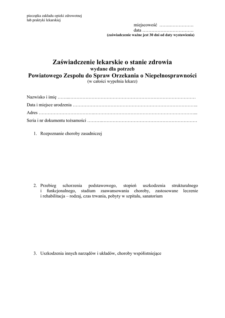 pieczątka zakładu opieki zdrowotnej lub praktyki lekarskiej miejscowość …….……………. data ……………………………. (zaświadczenie ważne jest 30 dni od daty wystawienia) Zaświadczenie lekarskie o stanie zdrowia wydane dla potrzeb Powiatowego Zespołu do Spraw Orzekania o Niepełnosprawności (w całości wypełnia lekarz) Nazwisko i imię ……..………………………………………………………………………… Data i miejsce urodzenia ……………………………………………………………………….. Adres ……………………………….…………………………………………………………... Seria i nr dokumentu tożsamości ……….……………………………………………………… 1. Rozpoznanie choroby zasadniczej 2. Przebieg schorzenia podstawowego, stopień uszkodzenia strukturalnego i funkcjonalnego, stadium zaawansowania choroby, zastosowane leczenie i rehabilitacja – rodzaj, czas trwania, pobyty w szpitalu, sanatorium 3. Uszkodzenia innych narządów i układów, choroby współistniejące 4. Ocena wyników leczenia, rokowania (trwałość uszkodzeń, możliwość poprawy), dalsze leczenie i rehabilitacja 5. Używane zaopatrzenie ortopedyczne i sprzęt rehabilitacyjny – ewentualne potrzeby w tym zakresie 6. Wykaz wykonywanych badań dodatkowych w załączeniu 7. Wykaz istotnych konsultacji specjalistycznych załączonych do zaświadczenia Czy lekarz wystawiający zaświadczenie ma pełny wgląd do dokumentacji medycznej pacjenta? TAK NIE Od kiedy pacjent posiada dokumentacją medyczną? rok …………………………… Od kiedy pacjent pozostaje pod opieką lekarza wystawiającego zaświadczenie? rok …………… Pacjent wymaga opieki osoby drugiej ze względu na niemożność samodzielnej egzystencji Pacjent TAK może NIE nie może przybyć na posiedzenie składu orzekającego. ………………………… pieczątka i podpis lekarza Brak pieczątek podmiotu wystawiającego zaświadczenie i/lub podpisu lekarza, daty oraz danych osobowych pacjenta, powoduje nieważność zaświadczenia.