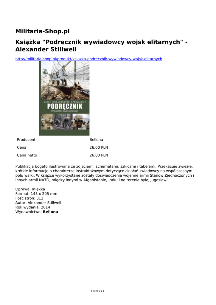 Militaria-Shop.pl Książka "Podręcznik wywiadowcy wojsk elitarnych" Alexander Stillwell http://militaria-shop.pl/produkt/ksiazka-podrecznik-wywiadowcy-wojsk-elitarnych Producent Bellona Cena 26.00 PLN Cena netto 26.00 PLN Publikacja bogato ilustrowana ze zdjęciami, schematami, szkicami i tabelami. Przekazuje zwięzłe, krótkie informacje o charakterze instruktażowym dotyczące działań zwiadowcy na współczesnym polu walki. W książce wykorzystane zostały doświadczenia wojenne armii Stanów Zjednoczonych i innych armii NATO, między innymi w Afganistanie, Iraku i na terenie byłej Jugosławii. Oprawa: miękka Format: 145 x 205 mm Ilość stron: 312 Autor: Alexander Stillwell Rok wydania: 2014 Wydawnictwo: Bellona Strona 1 z 1