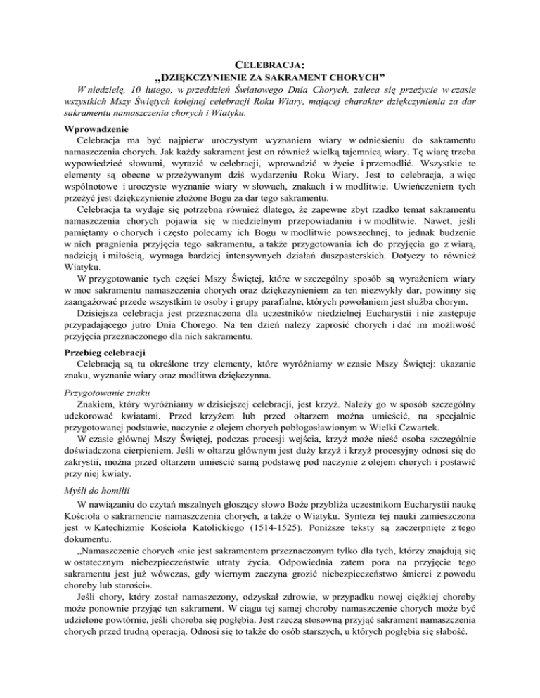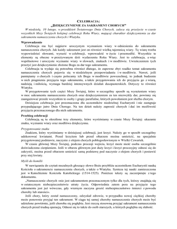 CELEBRACJA: „DZIĘKCZYNIENIE ZA SAKRAMENT CHORYCH” W niedzielę, 10 lutego, w przeddzień Światowego Dnia Chorych, zaleca się przeŜycie w czasie wszystkich Mszy Świętych kolejnej celebracji Roku Wiary, mającej charakter dziękczynienia za dar sakramentu namaszczenia chorych i Wiatyku. Wprowadzenie Celebracja ma być najpierw uroczystym wyznaniem wiary w odniesieniu do sakramentu namaszczenia chorych. Jak kaŜdy sakrament jest on równieŜ wielką tajemnicą wiary. Tę wiarę trzeba wypowiedzieć słowami, wyrazić w celebracji, wprowadzić w Ŝycie i przemodlić. Wszystkie te elementy są obecne w przeŜywanym dziś wydarzeniu Roku Wiary. Jest to celebracja, a więc wspólnotowe i uroczyste wyznanie wiary w słowach, znakach i w modlitwie. Uwieńczeniem tych przeŜyć jest dziękczynienie złoŜone Bogu za dar tego sakramentu. Celebracja ta wydaje się potrzebna równieŜ dlatego, Ŝe zapewne zbyt rzadko temat sakramentu namaszczenia chorych pojawia się w niedzielnym przepowiadaniu i w modlitwie. Nawet, jeśli pamiętamy o chorych i często polecamy ich Bogu w modlitwie powszechnej, to jednak budzenie w nich pragnienia przyjęcia tego sakramentu, a takŜe przygotowania ich do przyjęcia go z wiarą, nadzieją i miłością, wymaga bardziej intensywnych działań duszpasterskich. Dotyczy to równieŜ Wiatyku. W przygotowanie tych części Mszy Świętej, które w szczególny sposób są wyraŜeniem wiary w moc sakramentu namaszczenia chorych oraz dziękczynieniem za ten niezwykły dar, powinny się zaangaŜować przede wszystkim te osoby i grupy parafialne, których powołaniem jest słuŜba chorym. Dzisiejsza celebracja jest przeznaczona dla uczestników niedzielnej Eucharystii i nie zastępuje przypadającego jutro Dnia Chorego. Na ten dzień naleŜy zaprosić chorych i dać im moŜliwość przyjęcia przeznaczonego dla nich sakramentu. Przebieg celebracji Celebracją są tu określone trzy elementy, które wyróŜniamy w czasie Mszy Świętej: ukazanie znaku, wyznanie wiary oraz modlitwa dziękczynna. Przygotowanie znaku Znakiem, który wyróŜniamy w dzisiejszej celebracji, jest krzyŜ. NaleŜy go w sposób szczególny udekorować kwiatami. Przed krzyŜem lub przed ołtarzem moŜna umieścić, na specjalnie przygotowanej podstawie, naczynie z olejem chorych pobłogosławionym w Wielki Czwartek. W czasie głównej Mszy Świętej, podczas procesji wejścia, krzyŜ moŜe nieść osoba szczególnie doświadczona cierpieniem. Jeśli w ołtarzu głównym jest duŜy krzyŜ i krzyŜ procesyjny odnosi się do zakrystii, moŜna przed ołtarzem umieścić samą podstawę pod naczynie z olejem chorych i postawić przy niej kwiaty. Myśli do homilii W nawiązaniu do czytań mszalnych głoszący słowo BoŜe przybliŜa uczestnikom Eucharystii naukę Kościoła o sakramencie namaszczenia chorych, a takŜe o Wiatyku. Synteza tej nauki zamieszczona jest w Katechizmie Kościoła Katolickiego (1514-1525). PoniŜsze teksty są zaczerpnięte z tego dokumentu. „Namaszczenie chorych «nie jest sakramentem przeznaczonym tylko dla tych, którzy znajdują się w ostatecznym niebezpieczeństwie utraty Ŝycia. Odpowiednia zatem pora na przyjęcie tego sakramentu jest juŜ wówczas, gdy wiernym zaczyna grozić niebezpieczeństwo śmierci z powodu choroby lub starości». Jeśli chory, który został namaszczony, odzyskał zdrowie, w przypadku nowej cięŜkiej choroby moŜe ponownie przyjąć ten sakrament. W ciągu tej samej choroby namaszczenie chorych moŜe być udzielone powtórnie, jeśli choroba się pogłębia. Jest rzeczą stosowną przyjąć sakrament namaszczenia chorych przed trudną operacją. Odnosi się to takŜe do osób starszych, u których pogłębia się słabość. Tylko kapłani (biskupi i prezbiterzy) są szafarzami namaszczenia chorych. Obowiązkiem duszpasterzy jest pouczanie wiernych o dobrodziejstwach tego sakramentu. Wierni powinni zachęcać chorych do wezwania kapłana i przyjęcia tego sakramentu. Chorzy powinni przygotować się do jego przyjęcia przez dobre dyspozycje, z pomocą duszpasterza i całej wspólnoty kościelnej, która w szczególny sposób powinna otaczać chorych swoją modlitwą i braterską pomocą. Skutki sprawowania tego sakramentu Szczególny dar Ducha Świętego. Pierwszą łaską sakramentu namaszczenia chorych jest łaska umocnienia, pokoju i odwagi, by przezwycięŜyć trudności związane ze stanem cięŜkiej choroby lub niedołęstwem starości. Ta łaska jest darem Ducha Świętego, który odnawia ufność i wiarę w Boga oraz umacnia przeciw pokusom złego ducha, przeciw pokusie zniechęcenia i trwogi przed śmiercią. Wsparcie Pana przez moc Jego Ducha ma prowadzić chorego do uzdrowienia duszy, a takŜe do uzdrowienia ciała, jeśli taka jest wola BoŜa. ponadto, «jeśliby popełnił grzechy, będą mu odpuszczone» (Jk 5,15). Zjednoczenie z męką Chrystusa. Przez łaskę tego sakramentu chory otrzymuje siłę i dar głębszego zjednoczenia z męką Chrystusa. Jest on w pewien sposób konsekrowany, by przynosić owoc przez upodobnienie do odkupieńczej śmierci Zbawiciela. Cierpienie – następstwo grzechu pierworodnego – otrzymuje nowe znaczenie: staje się uczestnictwem w zbawczym dziele Jezusa. Łaska eklezjalna. Chorzy, którzy przyjmują ten sakrament, «łącząc się dobrowolnie z męką i śmiercią Chrystusa, przysparzają dobra Ludowi BoŜemu». Celebrując ten sakrament, Kościół w komunii świętych wstawia się w intencji chorego. Ze swej strony chory przez łaskę tego sakramentu przyczynia się do uświęcenia Kościoła i do dobra wszystkich ludzi, dla których Kościół cierpi i ofiaruje się przez Chrystusa Bogu Ojcu. Przygotowanie do ostatniego przejścia. Jeśli sakrament namaszczenia chorych udzielany jest wszystkim, którzy cierpią z powodu cięŜkiej choroby i niedołęstwa, to tym bardziej jest on przeznaczony dla tych, którzy zbliŜają się do kresu Ŝycia, tak Ŝe nazywano go równieŜ sacramentum exeunt