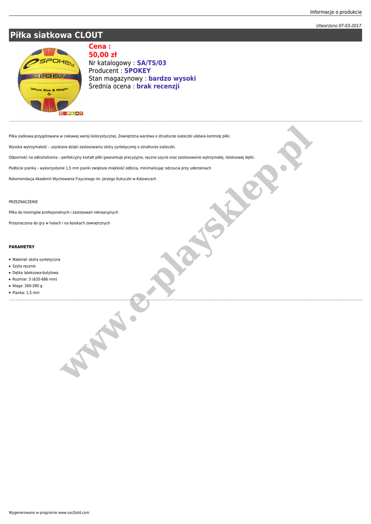 Informacje o produkcie Utworzono 07-03-2017 Piłka siatkowa CLOUT Cena : 50,00 zł Nr katalogowy : SA/TS/03 Producent : SPOKEY Stan magazynowy : bardzo wysoki Średnia ocena : brak recenzji Wysoka wytrzymałość – uzyskana dzięki zastosowaniu skóry syntetycznej o strukturze siateczki. p. pl Piłka siatkowa przygotowana w ciekawej wersji kolorystycznej. Zewnętrzna warstwa o strukturze siateczki ułatwia kontrolę piłki. Odporność na odkształcenia – perfekcyjny kształt piłki gwarantuje precyzyjne, ręczne szycie oraz zastosowanie wytrzymałej, lateksowej dętki. Podbicie pianką – wykorzystanie 1,5 mm pianki zwiększa miękkość odbicia, minimalizując odczucia przy uderzeniach PRZEZNACZENIE Piłka do treningów profesjonalnych i zastosowań rekreacyjnych Przeznaczona do gry w halach i na boiskach zewnętrznych PARAMETRY Materiał: skóra syntetyczna ● Szyta ręcznie ● Dętka lateksowa-butylowa ● Rozmiar: 5 (635-686 mm) ● Waga: 260-280 g ● Pianka: 1,5 mm w w w .e - pl ● ay sk le Rekomendacja Akademii Wychowania Fizycznego im. Jerzego Kukuczki w Katowicach Wygenerowano w programie www.oscGold.com