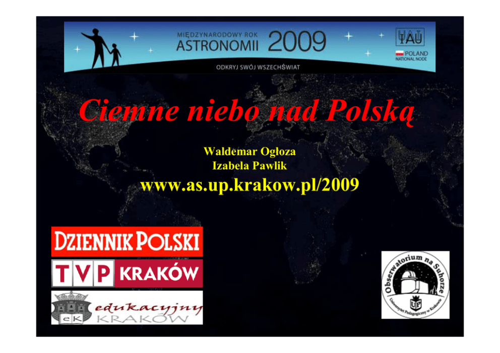 Ciemne niebo nad Polską Waldemar Ogłoza Izabela Pawlik www.as.up.krakow.pl/2009 Satelitarne zdjęcie nocnej Europy • Rozproszone światło zanieczyszcza nocne niebo Polska w nocy Niekorzystne oświetlenie • Kulisty kształt klosza kieruje światło w przestrzeń, prawdą wydaje się powiedzenie „najciemniej pod latarnią” AbaŜury • Brak osłon bocznych powoduje oślepianie oraz ucieczkę światła poza oświetlany teren Dobre oświetlenie • Lampa jest wyposaŜona w pełny abaŜur oraz płaski klosz. Światło jest kierowane tylko we właściwym kierunku Nowoczesne lampy: • Kompletny abaŜur • Płaski szklany klosz • Poziome ustawienie Nowoczesne lampy: • Nowoczesne lampy coraz częściej zastępują lampy starego typu z obłymi kloszami Nowoczesne lampy: • Obłe klosze lamp rozpraszają światło na boki, dlatego stosuje się obecnie nowoczesne, płaskie klosze i zamknięte od góry abaŜury • Uzupełnieniem systemu mogą być czujniki zmierzchowe, obniŜanie napięcia w godzinach późnej nocy lub wygaszanie co 2 lampy Nowoczesne lampy: Nowoczesne lampy: Złe oświetlenie: • Kuliste klosze, ulubione przez projektantów parków miejskich .... • 40 % energii ucieka w niebo • 20% energii oślepia oczy przechodniów • Tylko 40% światła kierowane jest w dobrym kierunku Złe oświetlenie: • Stare lampy z obłymi kloszami jednakowo oświetlają drogi jak i teren pobocza leŜącego za lampami Złe oświetlenie: • Kuliste klosze, jednakowo oświetlają chodnik jak i okna naszych mieszkań Złe oświetlenie: Lampy w chodniku lub w jego pobliŜu. Zastosowanie: • Oślepianie • Zanieczyszczanie • Marnowanie energii Prawidłowe ustawienie lamp • Lampa oświetla ściśle zadany obszar. • Teren za słupem lampy nie jest oświetlany Prawidłowe oświetlenie • Awangardowe oświetlenie o pełnych abaŜurach Prawidłowe oświetlenie • Oświetlony plac, frontony kamienic nie są oświetlone Prawidłowe oświetlenie • Lampy umieszczone nad obszarem roboczym, redukcja niepoŜądanego oświetlenia powyŜej parteru Prawidłowe oświetlenie • Prawidłowo oświetlona ulica i deptak dla pieszych Prawidłowe oświetlenie • Oświetlenie deptaków lampami świecącymi pod nogi przechodniów Prawidłowe oświetlenie • Oświetlenie schodów Prawidłowe oświetlenie • Lampy wysokościowe z nachylonym kloszem, moŜna zastąpić nowoczesnymi lampami poziomymi, równieŜ obejmującymi duŜe powierzchnie Prawidłowe oświetlenie • Prawidłowo oświetlona ulica, brak oślepiania, ciągłe pokrycie jezdni światłem, cała wiązka latarń skierowana na drogę Inne źródła oświetlenia • Planowe oświetlenie ulic to tylko część światła w naszych miastach Inne źródła oświetlenia • Chaos róŜnych systemów oświetlenia: Absurdy: • Nowoczesna lampa ekologiczna, świecąca w dzień! Absurdy: • Kulista lampa oświetla zarośla i oślepia przechodniów, chodnik pozostaje w cieniu. Absurdy: • Podwójny stojak billboardowy, zaoszczędzono na niezaleŜnym wyłączniku prądu dla kaŜdej powierzchni reklamowej . Absurdy: • Jasno oświetlone reklamy „białego śniegu” . Absurdy: • Ruch uliczny w centrum Krakowa o godzinie 1:00, wszystkie lampy świecą tak, jak wieczorem. Nie zaprojektowano moŜliwości obniŜania napięcia czy selektywnego wygaszania. Absurdy: • Oślepianie zamiast zaplanowanego oświetlania. Pozostawiono część nazwy aby moŜna ocenić skuteczność takiej „reklamy” Absurdy: Lampy mają zapewniać bezpieczeństwo. Ta lampa nie oświetla dostatecznie chodnika lecz oślepia! Widok naturalny! Absurdy: Po obróbce cyfrowej poprzedniego zdjęcia widać chodnik i stojącego męŜczyznę, którego nie było widać na nieobrobionym zdjęciu Jaśniej nie zawsze znaczy bezpieczniej! Absurdy: Nowoczesna lampa ekologiczna, i lampy kuliste oświetlają się nawzajem! Absurdy: • • • • Oprócz drogi lampa oświetla: pobocze, trawnik, płot ogródek posesji Więcej informacji: Polecamy artykuł w „Dzienniku Polskim” z 30 I 2009: http://www.as.up.krakow.pl/2009/guwbr.pdf Zapraszamy do wzięcia udziału w konkursie „Ciemne niebo nad Polską”; www.as.up.krakow.pl/2009/ciemneniebo.pdf organizator: www.as.up.krakow.pl/2009 www.astronomia2009.pl