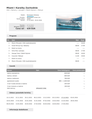 Miami i Karaiby Zachodnie USA > Bahamy > Jamajka > Wielki KAjman > Meksyk Statek : Armator : Numer oferty : Termin : Termin : Długość pobytu : Norwegian Getaway Norwegian Cruise Line 30364 27.12.2015 - 03.01.2016 27.12.2015 7 noclegów Cena od : 639 EUR Program Nr. Opis Wpł. Wypł. --:-- 16:00 08:00 17:00 --:-- --:-- 1 Miami (Floryda) / USA (zaokrętowanie) 2 Great Stirrup Cay / Bahamy 3 Dzień na morzu 4 Ocho Rios / Jamajka 08:00 17:00 5 George Town / Wielki Kajman 08:00 16:00 6 Cozumel / Meksyk 11:00 19:00 7 Dzień na morzu --:-- --:-- 8 Miami (Floryda) / USA (wyokrętowanie) 08:00 --:-- Cennik Nazwa Opis Cena katalogowa Cena promocyjna kabina wewnętrzna 639 EUR --; kabina z oknem 699 EUR --; kabina z balkonem 799 EUR --; apartament (suite) 999 ÷ 1.649 EUR --; 3 lub 4 osoba dorosła w kabinie 359 EUR --; 3 lub 4 dziecko w kabinie 199 EUR --; --; --; bilet lotniczy SPRAWDŹ CENĘ Zobacz pozostałe terminy 15.11.2015 22.11.2015 29.11.2015 06.12.2015 13.12.2015 20.12.2015 27.12.2015 03.01.2016 10.01.2016 17.01.2016 24.01.2016 31.01.2016 07.02.2016 14.02.2016 21.02.2016 28.02.2016 06.03.2016 13.03.2016 20.03.2016 27.03.2016 03.04.2016 10.04.2016 17.04.2016 Informacje dodatkowe Cena obejmuje: ● ● ● ● ● ● zakwaterowanie w kabinie wybranej kategorii; serwis bagażowy i kabinowy; wyżywienie – 3 główne posiłki, przekąski między posiłkami, bufet lub przekąski o północy; korzystanie z basenu i innych urządzeń sportowo-rekreacyjnych; udział we wszystkich imprezach organizowanych na statku; opłaty portowe. Cena nie obejmuje: ● ● ● ● ● ● kosztów dojazdu do portu; ewentualnych noclegów w hotelu przed/po rejsie i transferów (na zapytanie); wycieczek fakultatywnych; korzystania z punktów usługowych (pralnia, fotograf, salon piękności i odnowy biologicznej, internet); napojów do obiadów i kolacji, drinków oraz napiwków obowiązkowych (ok. 12,95 - 14,95 $/os./dzień); ubezpieczenia KL, NW i bagażu. Uwagi: Kabiny 3/4 osobowe nie są dostępne we wszystkich kategoriach, a ich liczba jest ograniczona - sprzedaż tylko po potwierdzeniu; propozycje dojazdu do portu, hoteli przed/po rejsie na zapytanie. Ceny minimalne są podane tylko w celach orientacyjnych. Ceny są "płynne" i codziennie ulegają zmianom. Aby uzyskać najkorzystniejszą cenę w danym dniu, skontaktuj się z nami 0 801 000 351.
