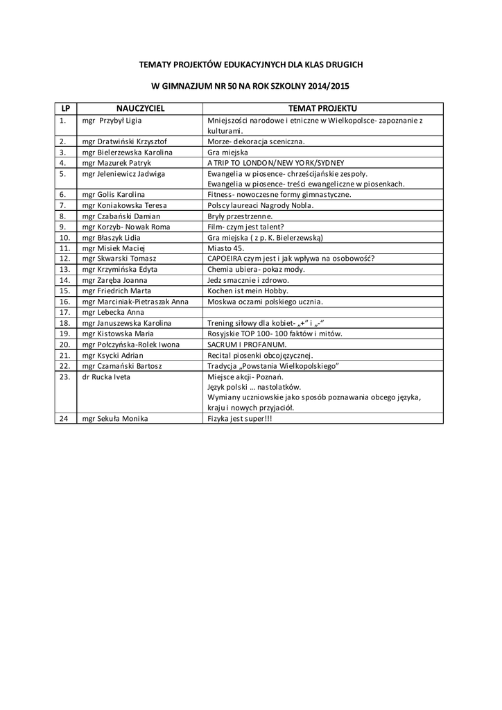 TEMATY PROJEKTÓW EDUKACYJNYCH DLA KLAS DRUGICH W GIMNAZJUM NR 50 NA ROK SZKOLNY 2014/2015 LP NAUCZYCIEL 1. mgr Przybył Ligia 2. 3. 4. 5. mgr Dratwiński Krzysztof mgr Bielerzewska Karolina mgr Mazurek Patryk mgr Jeleniewicz Jadwiga 6. 7. 8. 9. 10. 11. 12. 13. 14. 15. 16. 17. 18. 19. 20. 21. 22. 23. mgr Golis Karolina mgr Koniakowska Teresa mgr Czabański Damian mgr Korzyb- Nowak Roma mgr Błaszyk Lidia mgr Misiek Maciej mgr Skwarski Tomasz mgr Krzymińska Edyta mgr Zaręba Joanna mgr Friedrich Marta mgr Marciniak-Pietraszak Anna mgr Lebecka Anna mgr Januszewska Karolina mgr Kistowska Maria mgr Połczyńska-Rolek Iwona mgr Ksycki Adrian mgr Czamański Bartosz dr Rucka Iveta 24 mgr Sekuła Monika TEMAT PROJEKTU Mniejszości narodowe i etniczne w Wielkopolsce- zapoznanie z kulturami. Morze- dekoracja sceniczna. Gra miejska A TRIP TO LONDO N/NEW YO RK/SYDNEY Ewangelia w piosence- chrześcijańskie zespoły. Ewangelia w piosence- treści ewangeliczne w piosenkach. Fitness- nowoczesne formy gimnastyczne. Polscy laureaci Nagrody Nobla. Bryły przestrzenne. Film- czym jest talent? Gra miejska ( z p. K. Bielerzewską) Miasto 45. CAPOEIRA czym jest i jak wpływa na osobowość? Chemia ubiera- pokaz mody. Jedz smacznie i zdrowo. Kochen ist mein Hobby. Moskwa oczami polskiego ucznia. Trening siłowy dla kobiet- „+” i „-‘’ Rosyjskie TOP 100- 100 faktów i mitów. SACRUM I PROFANUM. Recital piosenki obcojęzycznej. Tradycja „Powstania Wielkopolskiego” Miejsce akcji- Poznań. Język polski … nastolatków. Wymiany uczniowskie jako sposób poznawania obcego języka, kraju i nowych przyjaciół. Fizyka jest super!!!