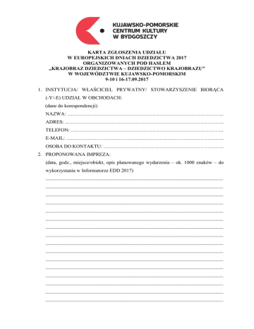 KARTA ZGŁOSZENIA UDZIAŁU W EUROPEJSKICH DNIACH DZIEDZICTWA 2017 ORGANIZOWANYCH POD HASŁEM „KRAJOBRAZ DZIEDZICTWA – DZIEDZICTWO KRAJOBRAZU” W WOJEWÓDZTWIE KUJAWSKO-POMORSKIM 9-10 i 16-17.09.2017 1. INSTYTUCJA/ WŁAŚCICIEL PRYWATNY/ STOWARZYSZENIE BIORĄCA (-Y/-E) UDZIAŁ W OBCHODACH: (dane do korespondencji) NAZWA: ……………………………………………………………………………….. ADRES: ..……………………………………………………………………………….. TELEFON: ….………………………………………………………………………….. E-MAIL: ….…………………………………………………………………………….. OSOBA DO KONTAKTU: …………………………………………………………….. 2. PROPONOWANA IMPREZA: (data, godz., miejsce/obiekt, opis planowanego wydarzenia – ok. 1000 znaków – do wykorzystania w Informatorze EDD 2017) ........................................................................................................................................... ........................................................................................................................................... ........................................................................................................................................... ........................................................................................................................................... ........................................................................................................................................... ........................................................................................................................................... ........................................................................................................................................... ........................................................................................................................................... ........................................................................................................................................... ........................................................................................................................................... ........................................................................................................................................... ........................................................................................................................................... ........................................................................................................................................... ........................................................................................................................................... ........................................................................................................................................... ........................................................................................................................................... 3. INFORMACJE DODATKOWE: (np. dostępność wydarzenia: impreza otwarta lub ograniczona zapisami) ........................................................................................................................................... ........................................................................................................................................... ........................................................................................................................................... ........................................................................................................................................... ........................................................................................................................................... Deklaruję udział w Europejskich Dniach Dziedzictwa 2017. Zobowiązuję się do zapewnienia bezpłatnego wstępu na wydarzenie zorganizowane w ramach Europejskich Dni Dziedzictwa 2017. Zobowiązuję się przesłać 2 fotografie (300 dpi), które zostaną wykorzystane jako ilustracja planowanego wydarzenia w materiałach promocyjnych przygotowywanych przez Kujawsko-Pomorskie Centrum Kultury w Bydgoszczy (w terminie do 15 maja). Zobowiązuję się do sporządzenia sprawozdania (ok. 1000 znaków) oraz przesłania od 2 do 5 fotografii ze zgłoszonego wydarzenia (w terminie do 2 tygodni od przeprowadzenia imprezy). Podpis organizatora …………………… Dziękujemy za wypełnienie karty zgłoszenia. Kartę proszę przesłać do 15 maja 2017 r. na adres: Kujawsko-Pomorskie Centrum Kultury Plac Kościeleckich 6 85-033 Bydgoszcz Tel.: 52 585 15 01/02/03 [email protected] Uwaga: Karta dotyczy 1 wydarzenia. Przesyłając kartę zgłoszenia, sprawozdanie oraz inne materiały tekstowe, a także zdjęcia i filmy dotyczące imprezy przygotowywanej w ramach Europejskich Dni Dziedzictwa Organizator wydarzenia wyraża zgodę na nieodpłatną, anonimową, nieograniczoną czasowo i terytorialnie publikację relacji tekstowej, zdjęcia, filmu lub innego materiału m.in. w portalach internetowych: www.edd-kpck.pl, www.kpck.pl i w wydawnictwach takich jak Informator Europejskich Dni Dziedzictwa 2017 w województwie kujawsko-pomorskim, wrzesień 2017. Zespół koordynujący Europejskie Dni Dziedzictwa w województwie kujawsko-pomorskim zastrzega sobie prawo skracania, adiustacji, zmiany tytułów i opracowania redakcyjnego dostarczonych tekstów oraz graficznej korekty materiałów ilustracyjnych.