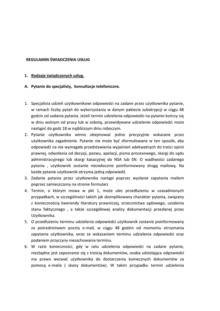 REGULAMIN ŚWIADCZENIA USŁUG 1. Rodzaje świadczonych usług. A. Pytanie do specjalisty, konsultacje telefoniczne. 1. Specjalista udzieli użytkownikowi odpowiedzi na zadane przez użytkownika pytanie, w ramach liczby pytań do wykorzystania w danym pakiecie subskrypcji w ciągu 48 godzin od zadania pytania. Jeżeli termin udzielenia odpowiedzi na pytanie kończy się w dniu wolnym od pracy lub w sobotę, przewidywane udzielenie odpowiedzi może nastąpić do godz 18 w najbliższym dniu roboczym. 2. Pytanie użytkownika winno obejmować jedno precyzyjnie wskazane przez użytkownika zagadnienie. Pytanie nie może być sformułowane w ten sposób, aby odpowiedź na nie wymagała przedstawienia wyjaśnień adekwatnych do treści opinii prawnej, odwołania od decyzji, pozwu, apelacji, pisma procesowego, skargi do sądu administracyjnego lub skargi kasacyjnej do NSA lub SN. O wadliwości zadanego pytania , użytkownik zostanie niezwłocznie poinformowany drogą mailową. Na każde pytanie użytkownik otrzyma jedną odpowiedź. 3. Zadanie pytania przez użytkownika nastąpi poprzez wysłanie zapytania mailem poprzez zamieszczony na stronie formularz 4. Termin, o którym mowa w pkt 1, może ulec przedłużeniu w uzasadnionych przypadkach, w szczególności takich jak skomplikowany charakter pytania, związany z koniecznością kwerendy literatury prawniczej, orzecznictwa sądowego, ustalenia stanu faktycznego , a także szczegółowej analizy dokumentacji przesłanej przez Użytkownika. 5. O przedłużeniu terminu udzielenia odpowiedzi użytkownik zostanie poinformowany za pośrednictwem poczty e-mail, w ciągu 48 godzin od momentu otrzymania zapytania użytkownika, wraz ze wskazaniem terminu udzielenia odpowiedzi oraz podaniem przyczyny niezachowania terminu. 6. W razie konieczności, gdy w celu udzielenia odpowiedzi na zadane pytanie, niezbędne jest zapoznanie się z treścią dokumentów, osoba udzielająca odpowiedzi ma prawo wezwać użytkownika do dostarczenia koniecznych dokumentów za pomocą e-maila ( skany dokumentów). W takim przypadku termin udzielenia odpowiedzi biegnie od godziny dostarczenia przez użytkownika dokumentów. 7. Konsultacja telefoniczna może zostać przeprowadzona po zgłoszeniu przez użytkownika takiej potrzebny za pośrednictwem formularza lub telefonicznie. Porada przez telefon udzielona zostanie w terminie uzgodnionym z użytkownikiem, po zweryfikowaniu danych użytkownika, wykupionego przez niego pakietu subskrypcji oraz opłaceniu kosztu takiej konsultacji, zgodnie z ceną zawartą w cenniku. 8. Na życzenie użytkownika konsultacja może zostać udzielona przy pomocy komunikatora Skype, na takich samych warunkach jak konsultacja telefoniczna. 9. Usługi niewykorzystane przez użytkownika w danym miesiącu kalendarzowym, nie przechodzą na następny miesiąc. 10. W przypadku wykorzystania przez użytkownika ilości usług mieszczących się w danym pakiecie, użytkownik może dokupić usługi. B. Doradztwo prawne w razie kontroli realizowanej przez NFZ lub podmioty uprawnione do przeprowadzania kontroli podmiotów prowadzących działalność leczniczą. 11. Użytkownik może skorzystać z pomocy prawnej w razie kontroli prowadzonej przez NFZ lub podmioty uprawnione do przeprowadzania kontroli podmiotów prowadzących działalność leczniczą lub przez inspekcję farmaceutyczną. 12. Pomoc prawna, o której mowa w punkcie poprzedzającym obejmuje: a) analizę postanowienia o wszczęciu kontroli oraz konsultację dla Użytkownika w zakresie przygotowania się do kontroli, b) doradztwo w trakcie trwania kontroli poprzez konsultacje telefoniczne lub emailowe w jej trakcie, trwające łącznie nie dłużej niż 3 godziny, c) analizę protokołu pokontrolnego i zgłoszenie uwag, zastrzeżeń i wyjaśnień do protokołu wraz z ewentualnym zgłoszeniem wniosków dowodowych, d) sporządzenie odwołań, zażaleń, wniosków o ponowne rozpatrzenie sprawy od wyników kontroli, w przewidzianym przez prawo trybie. 13. Skorzystanie z usługi określonej w pkt 11, wymaga zgłoszenia zapotrzebowania na usługę za pośrednictwem formularza i podania przez użytkownika wszelkich danych, umożliwiających szybki kontakt z użytkownikiem. 14. Po zgłoszeniu zapotrzebowania na usługę, prawnik kontaktuje się niezwłocznie z użytkownikiem ustalając z nim zakres oraz warunki finansowe realizacji zlecenia. 15. Warunkiem rozpoczęcia wykonywania usługi jest potwierdzenie przez użytkownika jej zamówienia poprzez przesłanie drogą mailową podpisanego przez użytkownika lub osobę/osoby go reprezentujące „Zamówienia na wykonywanie usługi”, określającego jego zakres, cenę i termin realizacji, wg. przesłanego Użytkownikowi wzoru. 16. Usługa doradztwa w trakcie kontroli dostępna jest w Pakiecie Kompleksowym, pod warunkiem zawarcia przez Użytkownika umowy na co najmniej 6 miesięcy. C. Pomoc w sporządzeniu oferty w procedurze kontraktowania świadczeń opieki zdrowotnej przez Narodowy Fundusz Zdrowia oraz konsultacje w związku z przygotowywaniem takiej oferty przez podmioty prowadzące działalność leczniczą. 17. Użytkownik może skorzystać z usługi pomocy w sporządzeniu oferty w procedurze kontraktowania świadczeń opieki zdrowotnej przez Narodowy Fundusz Zdrowia 18. Ofertę sporządzają specjaliści we współpracy z Użytkownikiem, który zobowiązuje się podać i przedstawić na żądanie specjalisty wszelkie dane i dokumenty wymagane do sporządzenia oferty. Kancelaria nie ponosi odpowiedzialności za podanie przez Użytkownika danych nieprawdziwych lub nieprawidłowych. 19. Oferty sporządzane będą z uwzględnieniem zasad określonych przepisami obowiązującego prawa oraz wymogami Narodowego Funduszu Zdrowia. D. Doradztwo w zakresie zakładania podmiotów prowadzących działalność leczniczą. 20. Użytkownik może skorzystać z usługi doradztwa w zakresie zakładania podmiotów prowadzących działalność leczniczą, obejmującą dorad