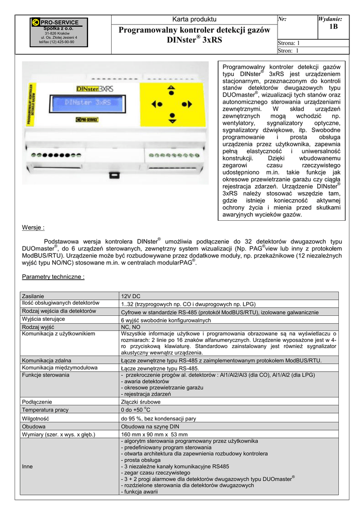 PRO-SERVICE Spółka z o.o. 31-826 Kraków ul. Os. Złotej Jesieni 4 tel/fax (12) 425-90-90 Karta produktu Nr: Programowalny kontroler detekcji gazów DINster® 3xRS Wydanie: 1B Strona: 1 Stron: 1 Programowalny kontroler detekcji gazów ® typu DINster 3xRS jest urządzeniem stacjonarnym, przeznaczonym do kontroli stanów detektorów dwugazowych typu ® DUOmaster , wizualizacji tych stanów oraz autonomicznego sterowania urządzeniami zewnętrznymi. W skład urządzeń zewnętrznych mogą wchodzić np. wentylatory, sygnalizatory optyczne, sygnalizatory dźwiękowe, itp. Swobodne programowanie i prosta obsługa urządzenia przez użytkownika, zapewnia pełną elastyczność i uniwersalność konstrukcji. Dzięki wbudowanemu zegarowi czasu rzeczywistego udostępniono m.in. takie funkcje jak okresowe przewietrzanie garażu czy ciągła ® rejestracja zdarzeń. Urządzenie DINster 3xRS należy stosować wszędzie tam, gdzie istnieje konieczność aktywnej ochrony życia i mienia przed skutkami awaryjnych wycieków gazów. Wersje : ® Podstawowa wersja kontrolera DINster umożliwia podłączenie do 32 detektorów dwugazowch typu ® ® DUOmaster , do 6 urządzeń sterowanych, zewnętrzny system wizualizacji (Np. PAG view lub inny z protokołem ModBUS/RTU). Urządzenie może być rozbudowywane przez dodatkowe moduły, np. przekaźnikowe (12 niezależnych ® wyjść typu NO/NC) stosowane m.in. w centralach modularPAG . Parametry techniczne : Zasilanie Ilość obsługiwanych detektorów Rodzaj wejścia dla detektorów Wyjścia sterujące Rodzaj wyjść Komunikacja z użytkownikiem Komunikacja zdalna Komunikacja międzymodułowa Funkcje sterowania Podłączenie Temperatura pracy Wilgotność Obudowa Wymiary (szer. x wys. x głęb.) Inne 12V DC 1..32 (trzyprogowych np. CO i dwuprogowych np. LPG) Cyfrowe w standardzie RS-485 (protokół ModBUS/RTU), izolowane galwanicznie 6 wyjść swobodnie konfigurowalnych NC, NO Wszystkie informacje użytkowe i programowania obrazowane są na wyświetlaczu o rozmiarach: 2 linie po 16 znaków alfanumerycznych. Urządzenie wyposażone jest w 4ro przyciskową klawiaturę. Standardowo zainstalowany jest również sygnalizator akustyczny wewnątrz urządzenia. Łącze zewnętrzne typu RS-485 z zaimplementowanym protokołem ModBUS/RTU. Łącze zewnętrzne typu RS-485. - przekroczenie progów al. detektorów : Al1/Al2/Al3 (dla CO), Al1/Al2 (dla LPG) - awaria detektorów - okresowe przewietrzanie garażu - rejestracja zdarzeń Złączki śrubowe o 0 do +50 C do 95 %, bez kondensacji pary Obudowa na szynę DIN 160 mm x 90 mm x 53 mm - algorytm sterowania programowany przez użytkownika - predefiniowany program sterowania - otwarta architektura dla zapewnienia rozbudowy kontrolera - prosta obsługa - 3 niezależne kanały komunikacyjne RS485 - zegar czasu rzeczywistego ® - 3 + 2 progi alarmowe dla detektorów dwugazowych typu DUOmaster - rozdzielone sterowania dla detektorów dwugazowych - funkcja awarii PRO-SERVICE Spółka z o.o. 31-826 Kraków ul. Os. Złotej Jesieni 4 tel/fax (12) 425-90-90 Karta produktu Nr: Programowalny kontroler detekcji gazów DINster® 3xRS Wydanie: 1B Strona: 2 Stron: 1 ® Rys. 1. – Opis zacisków kontrolera detekcji gazów DINster 3xRS Zasilanie – główne zasilanie modułu 12V DC ® Port detektorów RS485 – służy do podłączenia do 32 szt. dwugazowych detektorów typu DUOmaster Port zewnętrzny RS485 – służy do zdalnej wizualizacji stanu detektorów i przekaźników Port rozszerzający RS485 – przeznaczony jest do rozbudowy systemu o dodatkowe moduły (np. przekaźnikowe) Wyjścia przekaźnikowe P1..P6 – wyjścia bezpotencjałowych styków przekaźnikowych typu NC/NO dla sterowania urządzeń zewnętrznych (np. lampy, sygnalizatory, wentylatory) ® Rys. 2. – Wymiary obudowy kontrolera detekcji gazów DINster 3xRS