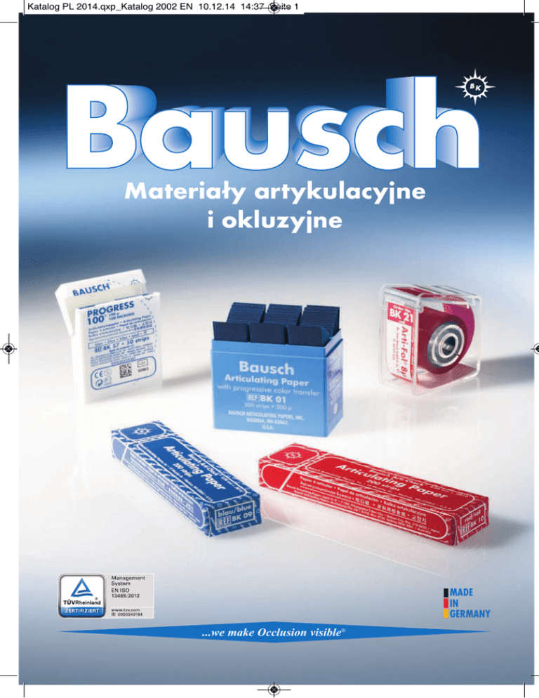 Katalog PL 2014.qxp_Katalog 2002 EN 10.12.14 14:37 Seite 1 Materiały artykulacyjne i okluzyjne MADE IN GERMANY ...we make Occlusion visible® Katalog PL 2014.qxp_Katalog 2002 EN 10.12.14 14:37 Seite 2 Fabryka, Niemcy Bausch U.S.A. Bausch Japonia Kolonia, Niemcy ...we make Occlusion visible® Katalog PL 2014.qxp_Katalog 2002 EN 10.12.14 14:37 Seite 3 Bausch - nazwa i pojęcie dla środków do kontroli artykulacji i okluzji. Prawidłowe fizjologiczne odtwarzanie okluzji było i jest dużym wyzwaniem dla każdego lekarza stomatologa i technika. Już małe kontakty przedwczesne w zakresie mogą wywołać zaburzenia okluzji. Warunki okluzyjne zmieniają się podczas każdego zabiegu stomatologicznego. Dlatego statyczna i dynamiczna czynność zębów ma kluczowe znaczenie dla powodzenia leczenia. Regularne kontrole okluzji są solidnymm fundamentem zdrowia pacjenta. Od 1953 roku firma Dr. Jean Bausch GmbH & Co. KG produkuje specjalne materiały do kontroli artykulacji i okluzji, których celem jest możliwie najdokładniejsze odtworzenie okluzji na powierzchni żującej. Założyciele firmy stomatolodzy Dr. Jean Basuch i Dr. Hans Bausch już bardzo wcześnie widzieli konieczność opracowania kalki artykulacyjnej czułej na nacisk, za pomocą której można by przedstawić różne siły żucia za pomocą odcieni barw. Niniejsza zasada progresywnych odcieni barw jest jeszcze dzisiaj jedną z ważniejszych metod sprawdzania punktów kontaktowych. Dr. Jean Bausch *1890 †1966 Dr. Hans Bausch *1928 †1998 Innym ważnym wymaganiem jest uzyskanie wyraźnego zabarwienia na problematycznych powierzchniach takich jak złoto, stopy metali, porcelana szczególnie na powierzchniach okluzyjnych wilgotnych od śliny. Dzięki konsekwentnemu,stałemu rozwojowi proponujemy jako jeden z przodujących producentów na rynkach światowych szeroki asortyment kalek artykulacyjnych i folii okluzyjnych o różnej grubości, kształcie i kolorze. Najważniejsze dla nas jest dobre odbijanie się barwnika na trudnych powierzchniach takich jak złoto lub ceramika. Wszystkie artykuły produkowane są zgodnie z europejskimi zaleceniami dla wyrobów medycznych oraz są stale kontrolowane przez nasz dział kontroli jakości. Surowce stosowane do produkcji są całkowicie obojetne fizjologicznie. Ta broszura jest skierowana przede wszystkim do praktycznych uzytkowników naszych produktów i ma byc pomocna przy wyborze odpowiedniego produktu. Prawidłowa okluzja jest ważna dla ogólnego zdrowia pacjenta. Interdyscyplinarne spojrzenie na wszystkie objawy jest ważne w codziennej praktyce dla postawienia diagnozy i odpowiedniego leczenia. Dlatego kontrola okluzji ma szczególne miejsce podczas leczenia pacjenta. ...we make Occlusion visible® 3 Katalog PL 2014.qxp_Katalog 2002 EN 10.12.14 14:37 Seite 4 Okluzja i przeszkody okluzyjne Okluzja kontakty zębowe szczęki i żuchwy w statyce i dynamice Statyczna okluzja kontakty zębowe bez ruchu żuchwy w zaguzkowaniu Dynamiczna okluzja kontakty zębowe powstające w wyniku ruchu żuchwy Centryczna okluzja statyczne okluzja w centrycznej pozycji kłykci (rys.1) Maksymalna okluzja (=maksymalne zaguzkowanie) = statyczna okluzja z maksymalnym kontaktem wielopunktowym (rys. 2) Okluzja nawykowa nawykowo przyjęta statyczna okluzja (HIKP) (Rys.8) Przeszkody zgryzowe /przedwczesne kontakty przedwczesny kontakt zęba lub grupy zębowej w statecznej lub dynamicznej okluzji Przedwczesny kontakt centryczny przedwczesny kontakt zęba lub grupy zębowej w centrycznej pozycji kłykci, który podczas przyjęcia nawykowej okluzji prowadzi kłykieć w pozycje ekscentryczną. Traumatyzująca okluzja przedwczesne kontakty w statycznej i/lub dynamicznej okluzji ,które prowadzą do uszkodzenia zęba i/lub przyzębia. źródło haseł: www.dgfdt.de ''CR" oznacza Centic Relation (centryczna relacja) ''CO'' oznacza Centric Occlusion (centryczna okluzja) CR-pozycja IKP-widok podniebienny Rys. 2 Rys.1 Centryczna pozycja kłykcia (centric relation) czaszkowo-brzuszna, niebocznie przesunięta [ang. maximal intercuspal position] statyczna okluzja z maksymalnym kłykiec-krążek i fizjologicznym obciążeniu struktur biorących udział. 4 Maksymalna okluzja (=maksymalne zaguzkowanie) pozycja obu kłykci przy fizjologicznej relacji statyczna okluzja z maksymalnym kontaktem wielopunktowym. Wszystkie zęby kontaktują równomiernie w relacji guzek-bruzda. ...we make Occlusion visible® Katalog PL 2014.qxp_Katalog 2002 EN 10.12.14 14:37 Seite 5 CO = CR Rys. 4 Rys. 3 Kłykcie w pozycji CR Kontakty okluzyjne w centrycznej okluzji Rys. 6 Rys. 5 Przeszkody okluzyjne Kłykcie w pozycji CR CO ≠ CR Rys. 8 Rys. 7 nowe kontakty okluzyjne w maksymalnej okluzji Ekscentryczna pozycje kłykci w HIKP ...we make Occlusion visible® 5 Katalog PL 2014.qxp_Katalog 2002 EN 10.12.14 14:37 Seite 6 Syndrom CMD Dysfunkcja czaskowo-żuchwowa Bóle głowy Nadrwrażliwość na światło Bóle uszu Szum w usach Nadwrażliwość na dźwieki Dolegliwości w stawach skoniowożuchwowych Bruksizm Utrudnione przełykanie Wzmożone napięcie karku Bóle ramion 6 ...we make Occlusion visible® Katalog PL 2014.qxp_Katalog 2002 EN 10.12.14 14:37 Seite 7 Okluzja i możliwe działanie przeszkód zgryzowych na pacjenta Każda odbudowa, ekstrakcja,uzupełnienia protetyczne jak również leczenie ortodontyczne zmieniają okluzje w statyce i dynamice. Najmniejsza przeszkoda okluzyjna w zakresie jest odbierana przez receptory czucia głębokiego jako zaburzenie w układzie stomatognatycznym. To moze prowadzic do bruksizmu (zgrzytagnie i zaciskanie),co może wywołać czynnościowe przeciążenie układu stomatognatycznego. Częto nastepstwem tego jest przeciążenie zębów,przyzębia,mięśni i stawów skroniowo-żuchwowych. Czynnościowe składowe aparatu zawieszeniowego zęba Siła żucia podczas kontaktów zębowych Przedwczesny kontakt Kość wyrostka zębodołowego „Proprioreceptory“ powoli adapttujące się receptory reaguja na nacisk Cement 