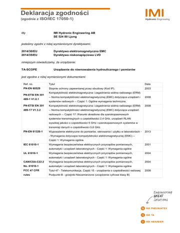 Deklaracja zgodności (zgodnie z ISO/IEC 17050-1) My IMI Hydronic Engineering AB SE 524 80 Ljung jesteśmy zgodni z niżej wymienionymi dyrektywami: 2014/30/EU 2014/35/EU Dyrektywa elektromagnetyczna EMC Dyrektywa niskonapięciowa LVD niniejszym oświadczamy, że urządzenie: TA-SCOPE Urządzenie do równoważenia hydraulicznego i pomiarów jest zgodne z niżej wymienionymi dokumentami: Ref. no. Tytuł Data PN-EN 60529 Stopnie ochrony zapewnianej przez obudowy (Kod IP). 2003 PN-ETSI EN 301 489-1 V1.8.1 Kompatybilność elektromagnetyczna i zagadnienia widma radiowego (ERM) -- Norma kompatybilności elektromagnetycznej (EMC) dotycząca urządzeń i 2008 systemów radiowych -- Część 1: Ogólne wymagania techniczne. PN-ETSI EN 301 Kompatybilność elektromagnetyczna i zagadnienia widma radiowego (ERM) 489-17 V1.3.2 -- Norma kompatybilności elektromagnetycznej (EMC) dotycząca urządzeń 2008 radiowych -- Część 17: Warunki określone dla szerokopasmowych systemów transmisyjnych o częstotliwości 2,4 GHz, urządzeń RLAN wysokiej jakości o częstotliwości 5 GHz i szerokopasmowych systemów w transmisji danych o częstotliwości 5,8 GHz. PN-EN 61326-1 Wyposażenie elektryczne do pomiarów, sterowania i użytku w laboratoriach - 2013 - Wymagania dotyczące kompatybilności elektromagnetycznej (EMC) -Część 1: Wymagania ogólne. IEC 61010-1 Wymagania bezpieczeństwa elektrycznych przyrządów pomiarowych, 2001 automatyki i urządzeń laboratoryjnych - Część 1: Wymagania ogólne UL 61010-1 Wymagania bezpieczeństwa elektrycznych przyrządów pomiarowych, 2004 automatyki i urządzeń laboratoryjnych - Część 1: Wymagania ogólne CAN/CSA-C22.2 Wymagania bezpieczeństwa elektrycznych przyrządów pomiarowych, No. 61010-1 automatyki i urządzeń laboratoryjnych - Część 1: Wymagania ogólne FCC 47 CFR Tytuł 47 - Telekomunikacja, Część 15 - urządzenia o częstotliwości radiowej rules Podpunkt B - grzejniki Niezamierzone (urządzenie cyfrowe klasy B) 2004 2008 Niniejszym oświadczamy, że nasza procedura oceny zgodności podlega pod Moduł H dyrektywy ciśnieniowej PED 2014/68/EU według jednostki notyfikowanej INSPECTA Sweden AB, No. 0409. Certificate No. PPC 22513. Dodatkowo chcielibyśmy poinformować, że nasz Zintegrowany System Zarządzania jest certyfikowany przez SP Technical Research Institute of Sweden w odniesieniu do: Ref. no. Tytuł Data PN – EN ISO 9001 System zarządzania jakością (cert.: 2125) 2008 PN – EN ISO 14001 System zarządzania środowiskowego (cert.: 2125 M) 2004 OHSAS 18001 System zarządzania BHP (cert.: 2125 O) 2007 Nazwisko: Marek Piecha Funkcja: Divisional Quality Manager Miasto: Olkusz Data: 2016-12-14 Numer deklaracji zgodności: 15/DC175 wersja 2