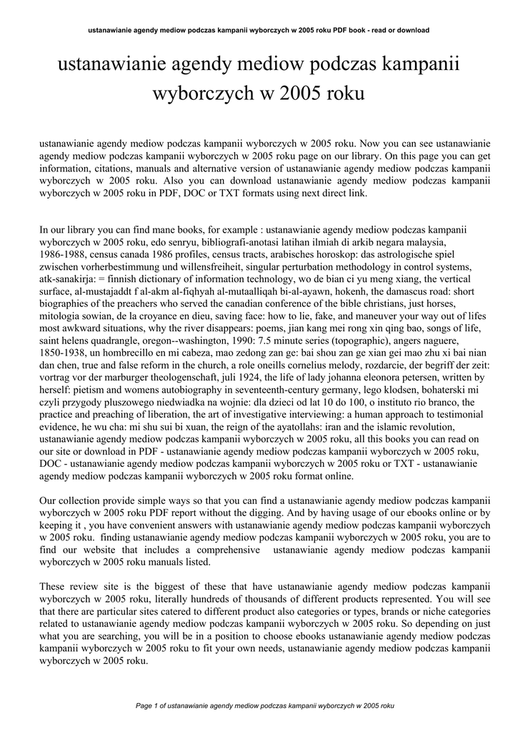 ustanawianie agendy mediow podczas kampanii wyborczych w 2005 roku PDF book - read or download ustanawianie agendy mediow podczas kampanii wyborczych w 2005 roku ustanawianie agendy mediow podczas kampanii wyborczych w 2005 roku. Now you can see ustanawianie agendy mediow podczas kampanii wyborczych w 2005 roku page on our library. On this page you can get information, citations, manuals and alternative version of ustanawianie agendy mediow podczas kampanii wyborczych w 2005 roku. Also you can download ustanawianie agendy mediow podczas kampanii wyborczych w 2005 roku in PDF, DOC or TXT formats using next direct link. In our library you can find mane books, for example : ustanawianie agendy mediow podczas kampanii wyborczych w 2005 roku, edo senryu, bibliografi-anotasi latihan ilmiah di arkib negara malaysia, 1986-1988, census canada 1986 profiles, census tracts, arabisches horoskop: das astrologische spiel zwischen vorherbestimmung und willensfreiheit, singular perturbation methodology in control systems, atk-sanakirja: = finnish dictionary of information technology, wo de bian ci yu meng xiang, the vertical surface, al-mustajaddt f al-akm al-fiqhyah al-mutaalliqah bi-al-ayawn, hokenh, the damascus road: short biographies of the preachers who served the canadian conference of the bible christians, just horses, mitologia sowian, de la croyance en dieu, saving face: how to lie, fake, and maneuver your way out of lifes most awkward situations, why the river disappears: poems, jian kang mei rong xin qing bao, songs of life, saint helens quadrangle, oregon--washington, 1990: 7.5 minute series (topographic), angers naguere, 1850-1938, un hombrecillo en mi cabeza, mao zedong zan ge: bai shou zan ge xian gei mao zhu xi bai nian dan chen, true and false reform in the church, a role oneills cornelius melody, rozdarcie, der begriff der zeit: vortrag vor der marburger theologenschaft, juli 1924, the life of lady johanna eleonora petersen, written by herself: pietism and womens autobiography in seventeenth-century germany, lego klodsen, bohaterski mi czyli przygody pluszowego niedwiadka na wojnie: dla dzieci od lat 10 do 100, o instituto rio branco, the practice and preaching of liberation, the art of investigative interviewing: a human approach to testimonial evidence, he wu cha: mi shu sui bi xuan, the reign of the ayatollahs: iran and the islamic revolution, ustanawianie agendy mediow podczas kampanii wyborczych w 2005 roku, all this books you can read on our site or download in PDF - ustanawianie agendy mediow podczas kampanii wyborczych w 2005 roku, DOC - ustanawianie agendy mediow podczas kampanii wyborczych w 2005 roku or TXT - ustanawianie agendy mediow podczas kampanii wyborczych w 2005 roku format online. Our collection provide simple ways so that you can find a ustanawianie agendy mediow podczas kampanii wyborczych w 2005 roku PDF report without the digging. And by having usage of our ebooks online or by keeping it , you have convenient answers with ustanawianie agendy mediow podczas kampanii wyborczych w 2005 roku. finding ustanawianie agendy mediow podczas kampanii wyborczych w 2005 roku, you are to find our website that includes a comprehensive ustanawianie agendy mediow podczas kampanii wyborczych w 2005 roku manuals listed. These review site is the biggest of these that have ustanawianie agendy mediow podczas kampanii wyborczych w 2005 roku, literally hundreds of thousands of different products represented. You will see that there are particular sites catered to different product also categories or types, brands or niche categories related to ustanawianie agendy mediow podczas kampanii wyborczych w 2005 roku. So depending on just what you are searching, you will be in a position to choose ebooks ustanawianie agendy mediow podczas kampanii wyborczych w 2005 roku to fit your own needs, ustanawianie agendy mediow podczas kampanii wyborczych w 2005 roku. Page 1 of ustanawianie agendy mediow podczas kampanii wyborczych w 2005 roku