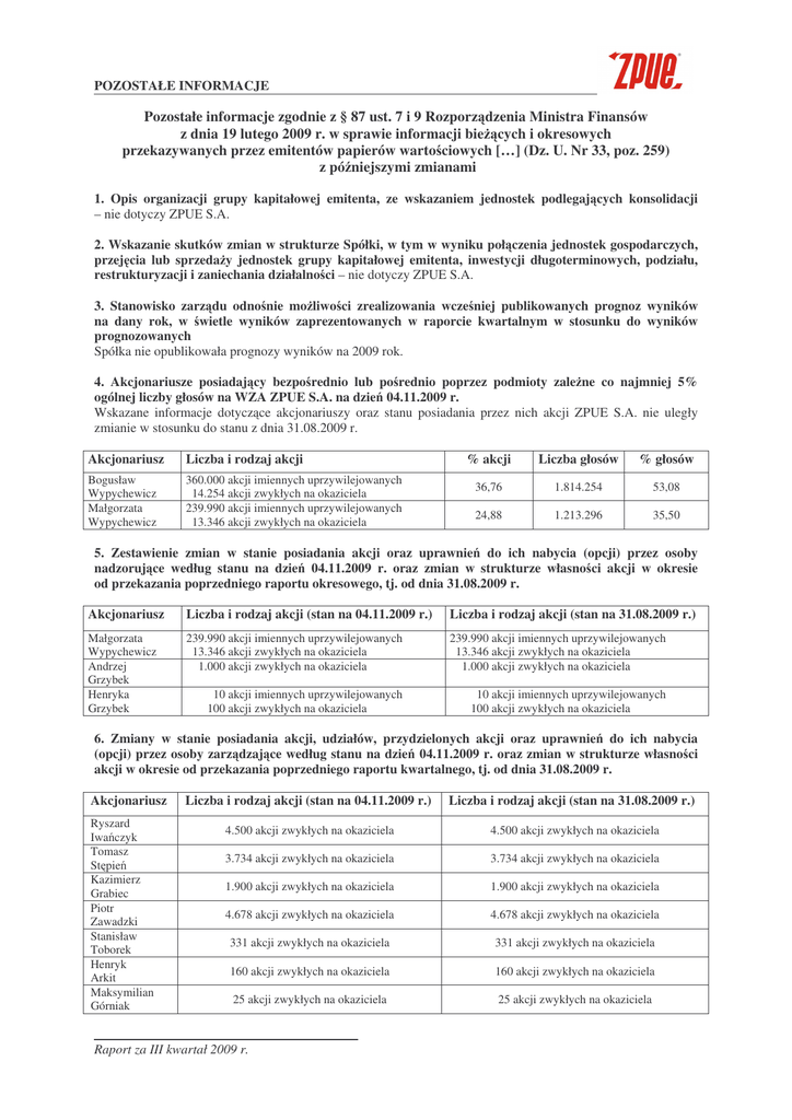POZOSTAŁE INFORMACJE Pozostałe informacje zgodnie z § 87 ust. 7 i 9 Rozporz dzenia Ministra Finansów z dnia 19 lutego 2009 r. w sprawie informacji bie cych i okresowych przekazywanych przez emitentów papierów warto ciowych […] (Dz. U. Nr 33, poz. 259) z pó niejszymi zmianami 1. Opis organizacji grupy kapitałowej emitenta, ze wskazaniem jednostek podlegaj cych konsolidacji – nie dotyczy ZPUE S.A. 2. Wskazanie skutków zmian w strukturze Spółki, w tym w wyniku poł czenia jednostek gospodarczych, przej cia lub sprzeda y jednostek grupy kapitałowej emitenta, inwestycji długoterminowych, podziału, restrukturyzacji i zaniechania działalno ci – nie dotyczy ZPUE S.A. 3. Stanowisko zarz du odno nie mo liwo ci zrealizowania wcze niej publikowanych prognoz wyników na dany rok, w wietle wyników zaprezentowanych w raporcie kwartalnym w stosunku do wyników prognozowanych Spółka nie opublikowała prognozy wyników na 2009 rok. 4. Akcjonariusze posiadaj cy bezpo rednio lub po rednio poprzez podmioty zale ne co najmniej 5% ogólnej liczby głosów na WZA ZPUE S.A. na dzie 04.11.2009 r. Wskazane informacje dotycz ce akcjonariuszy oraz stanu posiadania przez nich akcji ZPUE S.A. nie uległy zmianie w stosunku do stanu z dnia 31.08.2009 r. Akcjonariusz Liczba i rodzaj akcji Bogusław Wypychewicz Małgorzata Wypychewicz 360.000 akcji imiennych uprzywilejowanych 14.254 akcji zwykłych na okaziciela 239.990 akcji imiennych uprzywilejowanych 13.346 akcji zwykłych na okaziciela % akcji Liczba głosów % głosów 36,76 1.814.254 53,08 24,88 1.213.296 35,50 5. Zestawienie zmian w stanie posiadania akcji oraz uprawnie do ich nabycia (opcji) przez osoby nadzoruj ce według stanu na dzie 04.11.2009 r. oraz zmian w strukturze własno ci akcji w okresie od przekazania poprzedniego raportu okresowego, tj. od dnia 31.08.2009 r. Akcjonariusz Liczba i rodzaj akcji (stan na 04.11.2009 r.) Liczba i rodzaj akcji (stan na 31.08.2009 r.) Małgorzata Wypychewicz Andrzej Grzybek Henryka Grzybek 239.990 akcji imiennych uprzywilejowanych 13.346 akcji zwykłych na okaziciela 1.000 akcji zwykłych na okaziciela 239.990 akcji imiennych uprzywilejowanych 13.346 akcji zwykłych na okaziciela 1.000 akcji zwykłych na okaziciela 10 akcji imiennych uprzywilejowanych 100 akcji zwykłych na okaziciela 10 akcji imiennych uprzywilejowanych 100 akcji zwykłych na okaziciela 6. Zmiany w stanie posiadania akcji, udziałów, przydzielonych akcji oraz uprawnie do ich nabycia (opcji) przez osoby zarz dzaj ce według stanu na dzie 04.11.2009 r. oraz zmian w strukturze własno ci akcji w okresie od przekazania poprzedniego raportu kwartalnego, tj. od dnia 31.08.2009 r. Akcjonariusz Ryszard Iwa czyk Tomasz St pie Kazimierz Grabiec Piotr Zawadzki Stanisław Toborek Henryk Arkit Maksymilian Górniak Liczba i rodzaj akcji (stan na 04.11.2009 r.) Liczba i rodzaj akcji (stan na 31.08.2009 r.) 4.500 akcji zwykłych na okaziciela 4.500 akcji zwykłych na okaziciela 3.734 akcji zwykłych na okaziciela 3.734 akcji zwykłych na okaziciela 1.900 akcji zwykłych na okaziciela 1.900 akcji zwykłych na okaziciela 4.678 akcji zwykłych na okaziciela 4.678 akcji zwykłych na okaziciela 331 akcji zwykłych na okaziciela 331 akcji zwykłych na okaziciela 160 akcji zwykłych na okaziciela 160 akcji zwykłych na okaziciela 25 akcji zwykłych na okaziciela 25 akcji zwykłych na okaziciela Raport za III kwartał 2009 r. POZOSTAŁE INFORMACJE 7. Informacja o post powaniach tocz cych si przed s dem, organem wła ciwym dla post powania arbitra owego lub organem administracji publicznej W stosunku do ZPUE S.A. w okresie od 1 stycznia do 30 wrze nia 2009 r. nie zostały wszcz te przed s dem, organem wła ciwym dla post powania arbitra owego lub organem administracji publicznej post powania, których ł czna warto stanowiłaby co najmniej 10% kapitałów własnych Spółki. 8. Informacje o zawarciu przez Spółk lub jednostk od niej zale n jednej lub wielu transakcji z podmiotami powi zanymi, je eli pojedynczo lub ł cznie s one istotne i zostały zawarte na innych warunkach ni rynkowe – nie wyst piły. 9. Informacje o udzieleniu przez Spółk lub jednostk od niej zale n por cze kredytu lub po yczki lub udzieleniu gwarancji – ł cznie jednemu podmiotowi lub jednostce zale nej od tego podmiotu, je eli ł czna warto istniej cych por cze lub gwarancji stanowi równowarto co najmniej 10% kapitałów własnych Spółki – w okresie od 1 stycznia do dnia 30 wrze nia 2009 roku Spółka nie udzieliła kredytu, po yczki ani gwarancji jednemu podmiotowi, których ł czna warto ze wskazanych tytułów stanowiłaby równowarto co najmniej 10% kapitałów własnych Spółki. 10. Inne informacje, które zdaniem Spółki s istotne dla oceny jej sytuacji kadrowej, maj tkowej, finansowej, wyniku finansowego i ich zmian, oraz informacje, które s istotne dla oceny mo liwo ci realizacji zobowi za przez emitenta - Spółka zrealizowała znacz ce obroty w okresie krótszym ni 12 miesi cy z podmiotami: AREVA T&D Sp. z o.o. w Mikołowie, Azymut M.B. Wypychewicz Spółka Jawna, ZPUE Gliwice Sp. z o.o., EnergiaPro Koncern Energetyczny S.A., o czym Spółka informowała raportami bie cymi kolejno nr: 18/2009, 19/2009, 21/2009 oraz 23/2009. - W dniu 30 wrze nia 2009 r. pomi dzy ZPUE S.A. oraz Bankiem Zachodnim WBK S. A. podpisany został Aneks nr 10 do Umowy o wielowalutow lini kredytow nr 2040/030/04 z dnia 30.06.2004 r. Przedmiotowym aneksem Strony postanowiły przedłu y okres wa no ci Umowy kredytowej do dnia 30 wrze nia 2010 r. Informacje szczegółowe zostały zamieszczone w raporcie bie cym nr 20/2009. - W dniu 27 pa dziernika 2009 r. do Spółki wpłyn ło pismo z Banku Gospodarstwa Krajowego w Warszawie Oddział w Kielcach, w którym Bank poinformował ZPUE S.A., e z dniem 21 pa dziernika 2009 r. nast piło maksymalne umorzenie kredytu technologicznego, udzielonego na podstawie Umowy kredytu technologicznego nr 23/27607806/14060316/2006 z dnia 26.09.2006 r., do wyso