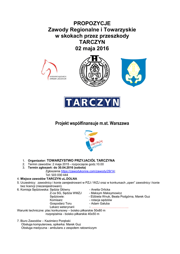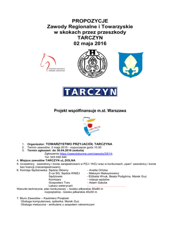 PROPOZYCJE Zawody Regionalne i Towarzyskie w skokach przez przeszkody TARCZYN 02 maja 2016 Projekt współfinansuje m.st. Warszawa 1. Organizator: TOWARZYSTWO PRZYJACIÓŁ TARCZYNA 2. Termin zawodów: 2 maja 2015 - rozpoczęcie godz.10.00 3. Termin zgłoszeń: do 30.04.2016 (sobota) Zgłoszenia https://zawodykonne.com/zawody/29/14; Tel: 503 030 444 4. Miejsce zawodów TARCZYN uL.DOLNA 5. Uczestnicy: zawodnicy i konie zarejestrowani w PZJ / WZJ oraz w konkursach „open” zawodnicy i konie bez licencji (niezarejestrowani). 6. Komisja Sędziowska: Sędzia Główny - Anetta Orlicka Z-ca SG, Sędzia WMZJ - Maksym Maksymowicz Sędziowie: - Elżbieta Wnuk, Beata Podgórna, Marek Guz Komisarz - rotacja sędziów Gospodarz Toru - Adam Galuba Lekarz weterynarii - ………………………………. Warunki techniczne: plac konkursowy – boisko piłkarskie 50x80 m rozprężalnia - boisko piłkarskie 40x50 m 7. Biuro Zawodów – Kazimierz Porębski Obsługa komputerowa, spikerka: Marek Guz Obsługa medyczna - ambulans z zespołem ratowniczym 8. Program zawodów – rozpoczęcie godzina 10.00 Konkurs nr 1, „Open”, dokładności, wys. 60 cm, (art.238.1.1), Konkurs nr 2, „Open”, zwykły, wys. 80 cm (art.238.2.1), Konkurs nr 3, „Open” klasa L, dwufazowy (dokładności, zwykły), wys. 100 cm (art.274.5.2) Konkurs nr 4, klasa P, zwykły, wys. 110 cm (art.238.2.1), Konkurs nr 5, klasa N, zwykły z rozgrywką, wys. 120 cm (art. 238.2.2) Wstępne godziny rozpoczęcia poszczególnych konkursów oraz wstępne listy startowe opublikowane będą w niedzielę na stronach www.zawodykonne.com, www.adkonie.pl, www.swiatkoni, Wyniki on-line publikowane będą na stronie www.zawodykonne.com; 9. Zawody rozgrywane zgodnie z Przepisami i Regulaminem PZJ. Zawodników i konie obowiązuje dokumentacja wg regulaminów i przepisów PZJ. Konkursy „open” (towarzyskie) rozgrywaną są zgodnie z Uchwałą PZJ z dnia 20.12.2013 oraz z równą dbałością o konie, zawodników i rywalizację sportową jak konkursy ZR. Osoby bez licencji (niezarejestrowane), w konkursach „open” (towarzyskich), obowiązują: aktualne badania lekarskie, ubezpieczenie NNW oraz w przypadku osób niepełnoletnich zgoda rodziców lub opiekunów prawnych. 10. W przypadku koni w konkursach „open” – wymagany jest minimum paszport urzędowy z aktualnymi szczepieniami. 11. Zgodnie z Regulaminem B PZJ 2014: - koń w wieku od 6 lat może startować w konkursach do klasy L1 włącznie trzykrotnie w ciągu dnia z zachowaniem zasady maksymalnie dwukrotnego startu w jednym konkursie (art. 4 pkt. 3), - w tym samym konkursie, dwukrotny start konia - pod tym samym lub różnymi zawodnikami - jest dozwolony w konkursach do klasy L1 włącznie. Jeżeli na tym samym koniu, w tym samym konkursie startuje ten sam zawodnik, to w konkursach, w których o zwycięstwie decyduje czas przejazdu, zalicza się tylko wynik pierwszego startu (art. 4 pkt. 4). 12. Nie przewiduje się odprawy technicznej. Zawodnicy zobowiązani są do przedstawienia dokumentów i wniesienia opłat na min. 1 godzinę przed rozpoczęciem danego konkursu. 13. Opłaty: Wpisowe: 100 PLN/koń. Konkurs 2 – 10 PLN Konkurs 3 – 20 PLN Konkurs 4 – 30 PLN Konkurs 5 – 40 PLN - Zmiany na listach startowych dopuszczalne są w przypadkach zgodnych z Przepisami PZJ oraz w innych przypadkach najpóźniej na godzinę przed rozpoczęciem danego konkursu. Pozostałe zmiany – opłata manipulacyjna 20 PLN. 14. Nagrody: W konkursie nr 1, 2 i 3 - puchary, flots,nagrody rzeczowe W konkursach nr 4,5, - puchary, flots i nagrody rzeczowe i pieniężne Ilość miejsc nagradzanych może ulec zmianie w zależności od ilości startujących w poszczególnych konkursach (1-4 konie – 1 miejsce; 5-8 koni – miejsca 1-2; 9-12 koni – miejsca 1-3, 13-16 koni – miejsca 1-4), Trwają rozmowy ze sponsorami. Pula nagród będzie publikowana na bieżąco na https://web.facebook.com/Organizacja-i-prowadzenie-zawod%C3%B3w-skokowych1468409006735337; 15. Na terenie zawodów zapewniony będzie catering, napoje., WC, ujęcie wody, parking dla samochodów osobowych. Organizator zapewnia parking dla koniowozów 16. Organizator nie ponosi odpowiedzialności za kradzieże, wypadki i inne szkody mogące powstać w trakcie zawodów oraz w czasie transportu na i po zawodach. 17. Organizator zastrzega sobie prawo do korekt w programie zawodów. 18. Propozycje zatwierdzone przez WMZJ. KODEKS POSTĘPOWANIA Z KONIEM I. Na wszystkich etapach treningu i przygotowań konia do startu w zawodach, dobrostan konia musi stać ponad wszelkimi innymi wymaganiami. Dotyczy to stałej opieki, metod treningu, starannego obrządku, kucia oraz transportu. II. Konie i jeźdźcy muszą być zdrowi, kompetentni i wytrenowani, zanim wezmą udział w zawodach. Dotyczy to także stosowanych leków, środków medycznych oraz zabiegów chirurgicznych zagrażających dobrostanowi konia lub ciąży klaczy, oraz przypadków nadużywania pomocy medycznej. III. Zawody nie mogą zagrażać dobrostanowi konia. Należy zwracać szczególną uwagę na teren zawodów, stan techniczny podłoża, warunki stajenne i atmosferyczne, kondycję koni i ich bezpieczeństwo, także podczas podroży powrotnej z zawodów. IV. Należy dołożyć wszelkich starań, aby zapewnić koniom staranną opiekę po zakończeniu zawodów, a także humanitarne traktowanie po zakończeniu kariery sportowej. Dotyczy to właściwej opieki weterynaryjnej, leczenia obrażeń odniesionych na zawodach, spokojnej starości, ewentualnie eutanazji. V. Polski Związek Jeździecki usilnie zachęca wszystkie osoby działające w sporcie jeździeckim do stałego podnoszenia swojej wiedzy oraz umiejętności dotyczących wszelkich aspektów współpracy z koniem.