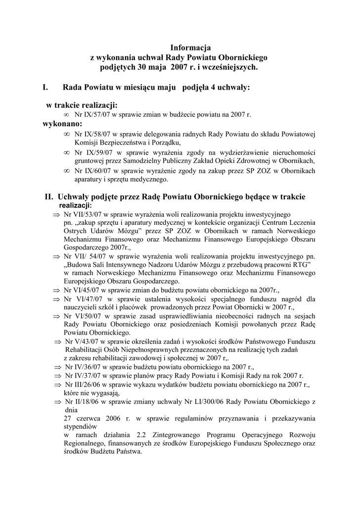 realizacja uchwał Rady Powiatu za mc maj 2007r.