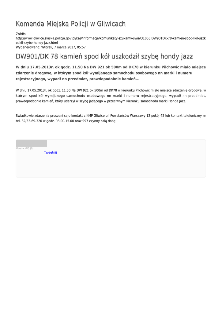 Komenda Miejska Policji w Gliwicach Źródło: http://www.gliwice.slaska.policja.gov.pl/ka9/informacje/komunikaty-szukamy-swia/31058,DW901DK-78-kamien-spod-kol-uszk odzil-szybe-hondy-jazz.html Wygenerowano: Wtorek, 7 marca 2017, 05:57 DW901/DK 78 kamień spod kół uszkodził szybę hondy jazz W dniu 17.05.2013r. ok godz. 11.50 Na DW 921 ok 500m od DK78 w kierunku Pilchowic miało miejsce zdarzenie drogowe, w którym spod kół wymijanego samochodu osobowego nn marki i numeru rejestracyjnego, wypadł nn przedmiot, prawdopodobnie kamień... W dniu 17.05.2013r. ok godz. 11.50 Na DW 921 ok 500m od DK78 w kierunku Pilchowic miało miejsce zdarzenie drogowe, w którym spod kół wymijanego samochodu osobowego nn marki i numeru rejestracyjnego, wypadł nn przedmiot, prawdopodobnie kamień, który uderzył w szybę jadącego w przeciwnym kierunku samochodu marki Honda Jazz. Świadkowie zdarzenia proszeni są o kontakt z KMP Gliwice ul. Powstańców Warszawy 12 pokój 42 lub kontakt telefoniczny nr tel. 32/33-69-320 w godz. 08.00-15.00 oraz 997 czynny całą dobę. Ocena: 0/5 (0) Tweetnij