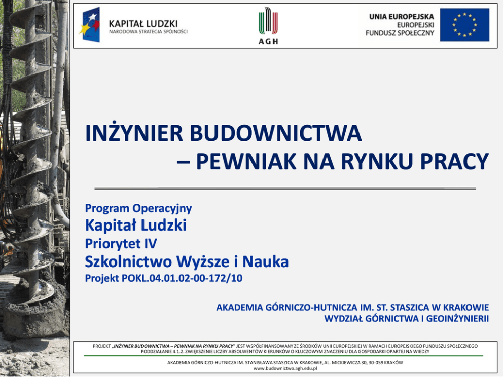 INŻYNIER BUDOWNICTWA – PEWNIAK NA RYNKU PRACY Program Operacyjny Kapitał Ludzki Priorytet IV Szkolnictwo Wyższe i Nauka Projekt POKL.04.01.02POKL.04.01.02-00 00--172/10 AKADEMIA GÓRNICZOGÓRNICZO-HUTNICZA IM. ST. STASZICA W KRAKOWIE WYDZIAŁ GÓRNICTWA I GEOINŻYNIERII PROJEKT „INŻYNIER BUDOWNICTWA – PEWNIAK NA RYNKU PRACY” JEST WSPÓŁFINANSOWANY ZE ŚRODKÓW UNII EUROPEJSKIEJ W RAMACH EUROPEJSKIEGO FUNDUSZU SPOŁECZNEGO PODDZIAŁANIE 4.1.2. ZWIĘKSZENIE LICZBY ABSOLWENTÓW KIERUNKÓW O KLUCZOWYM ZNACZENIU DLA GOSPODARKI OPARTEJ NA WIEDZY AKADEMIA GÓRNICZO-HUTNICZA IM. STANISŁAWA STASZICA W KRAKOWIE, AL. MICKIEWICZA 30, 30-059 KRAKÓW www.budownictwo.agh.edu.pl RZĄDOWY PROGRAM „KIERUNKI ZAMAWIANE” STUDIUJ KIERUNKI STRATEGICZNE DLA POLSKI Konkurs MNiSW nr 1/POKL/4.1.2/2010 z Poddziałania 4.1.2 PO KL Znaczny wzrost zainteresowania projektami PO KL: 2008 r. (pilotaż programu): wpłynęło 51 projektów, 2009 r. I edycja konkursu: wpłynęło 170 projektów, 2010 r. II edycja konkursu: wpłynęło 263 projektów. Z AGH na ostatnią edycję konkursu złożono 8 projektów. PROJEKT „INŻYNIER BUDOWNICTWA – PEWNIAK NA RYNKU PRACY” JEST WSPÓŁFINANSOWANY ZE ŚRODKÓW UNII EUROPEJSKIEJ W RAMACH EUROPEJSKIEGO FUNDUSZU SPOŁECZNEGO PODDZIAŁANIE 4.1.2. ZWIĘKSZENIE LICZBY ABSOLWENTÓW KIERUNKÓW O KLUCZOWYM ZNACZENIU DLA GOSPODARKI OPARTEJ NA WIEDZY AKADEMIA GÓRNICZO-HUTNICZA IM. STANISŁAWA STASZICA W KRAKOWIE, AL. MICKIEWICZA 30, 30-059 KRAKÓW www.budownictwo.agh.edu.pl RZĄDOWY PROGRAM „KIERUNKI ZAMAWIANE” STUDIUJ KIERUNKI STRATEGICZNE DLA POLSKI Lista kierunków zamawianych: Automatyka i robotyka Biotechnologia Budownictwo Chemia Energetyka Fizyka, fizyka techniczna Informatyka Inżynieria materiałowa Inżynieria środowiska Matematyka Mechanika i budowa maszyn Mechatronika Ochrona środowiska Wzornictwo PROJEKT „INŻYNIER BUDOWNICTWA – PEWNIAK NA RYNKU PRACY” JEST WSPÓŁFINANSOWANY ZE ŚRODKÓW UNII EUROPEJSKIEJ W RAMACH EUROPEJSKIEGO FUNDUSZU SPOŁECZNEGO PODDZIAŁANIE 4.1.2. ZWIĘKSZENIE LICZBY ABSOLWENTÓW KIERUNKÓW O KLUCZOWYM ZNACZENIU DLA GOSPODARKI OPARTEJ NA WIEDZY AKADEMIA GÓRNICZO-HUTNICZA IM. STANISŁAWA STASZICA W KRAKOWIE, AL. MICKIEWICZA 30, 30-059 KRAKÓW www.budownictwo.agh.edu.pl RZĄDOWY PROGRAM „KIERUNKI ZAMAWIANE” STUDIUJ KIERUNKI STRATEGICZNE DLA POLSKI PROJEKT „INŻYNIER BUDOWNICTWA – PEWNIAK NA RYNKU PRACY” JEST WSPÓŁFINANSOWANY ZE ŚRODKÓW UNII EUROPEJSKIEJ W RAMACH EUROPEJSKIEGO FUNDUSZU SPOŁECZNEGO PODDZIAŁANIE 4.1.2. ZWIĘKSZENIE LICZBY ABSOLWENTÓW KIERUNKÓW O KLUCZOWYM ZNACZENIU DLA GOSPODARKI OPARTEJ NA WIEDZY AKADEMIA GÓRNICZO-HUTNICZA IM. STANISŁAWA STASZICA W KRAKOWIE, AL. MICKIEWICZA 30, 30-059 KRAKÓW www.budownictwo.agh.edu.pl RZĄDOWY PROGRAM „KIERUNKI ZAMAWIANE” STUDIUJ KIERUNKI STRATEGICZNE DLA POLSKI PROJEKT „INŻYNIER BUDOWNICTWA – PEWNIAK NA RYNKU PRACY” JEST WSPÓŁFINANSOWANY ZE ŚRODKÓW UNII EUROPEJSKIEJ W RAMACH EUROPEJSKIEGO FUNDUSZU SPOŁECZNEGO PODDZIAŁANIE 4.1.2. ZWIĘKSZENIE LICZBY ABSOLWENTÓW KIERUNKÓW O KLUCZOWYM ZNACZENIU DLA GOSPODARKI OPARTEJ NA WIEDZY AKADEMIA GÓRNICZO-HUTNICZA IM. STANISŁAWA STASZICA W KRAKOWIE, AL. MICKIEWICZA 30, 30-059 KRAKÓW www.budownictwo.agh.edu.pl INŻYNIER BUDOWNICTWA – PEWNIAK NA RYNKU PRACY Rozpoznanie problemów krajowego rynku pracy: wysokie zapotrzebowanie na pracowników z wykształceniem technicznym, duże zapotrzebowanie na inżynierów budownictwa, niewielka liczba szkół kształcących studentów z zakresu budownictwa, niski poziom zainteresowania kobiet kierunkiem budownictwo. PROJEKT „INŻYNIER BUDOWNICTWA – PEWNIAK NA RYNKU PRACY” JEST WSPÓŁFINANSOWANY ZE ŚRODKÓW UNII EUROPEJSKIEJ W RAMACH EUROPEJSKIEGO FUNDUSZU SPOŁECZNEGO PODDZIAŁANIE 4.1.2. ZWIĘKSZENIE LICZBY ABSOLWENTÓW KIERUNKÓW O KLUCZOWYM ZNACZENIU DLA GOSPODARKI OPARTEJ NA WIEDZY AKADEMIA GÓRNICZO-HUTNICZA IM. STANISŁAWA STASZICA W KRAKOWIE, AL. MICKIEWICZA 30, 30-059 KRAKÓW www.budownictwo.agh.edu.pl INŻYNIER BUDOWNICTWA – PEWNIAK NA RYNKU PRACY Projekt jest odpowiedzią na PROBLEMY zdiagnozowane przez badania własne wskazujące na: niewystarczające przygotowanie praktyczne studentów do funkcjonowanie na rynku pracy, niewystarczające powiązanie kierunku budownictwo z potrzebami rynku pracy w aspekcie aktualnych treści nauczania, niewystarczającą współpracę między przedsiębiorstwami a uczelnią w zakresie profilu kształcenia na poziomie wyższym, luki kompetencyjne studentów kierunku budownictwo w zakresie matematyki, fizyki i chemii. PROJEKT „INŻYNIER BUDOWNICTWA – PEWNIAK NA RYNKU PRACY” JEST WSPÓŁFINANSOWANY ZE ŚRODKÓW UNII EUROPEJSKIEJ W RAMACH EUROPEJSKIEGO FUNDUSZU SPOŁECZNEGO PODDZIAŁANIE 4.1.2. ZWIĘKSZENIE LICZBY ABSOLWENTÓW KIERUNKÓW O KLUCZOWYM ZNACZENIU DLA GOSPODARKI OPARTEJ NA WIEDZY AKADEMIA GÓRNICZO-HUTNICZA IM. STANISŁAWA STASZICA W KRAKOWIE, AL. MICKIEWICZA 30, 30-059 KRAKÓW www.budownictwo.agh.edu.pl INŻYNIER BUDOWNICTWA – PEWNIAK NA RYNKU PRACY Cel ogólny projektu: Zwiększenie liczby absolwentów kierunku budownictwo Cele szczegółowe: wzrost zainteresowania kandydatów na studia kierunkiem budownictwo na WGiG AGH, lepsze przygotowanie praktyczne absolwentów kierunku budownictwo, poprawa jakości oferty edukacyjnej WGiG poprzez różnego rodzaju formy wsparcia dla studentów. PROJEKT „INŻYNIER BUDOWNICTWA – PEWNIAK NA RYNKU PRACY” JEST WSPÓŁFINANSOWANY ZE ŚRODKÓW UNII EUROPEJSKIEJ W RAMACH EUROPEJSKIEGO FUNDUSZU SPOŁECZNEGO PODDZIAŁANIE 4.1.2. ZWIĘKSZENIE LICZBY ABSOLWENTÓW KIERUNKÓW O KLUCZOWYM ZNACZENIU DLA GOSPODARKI OPARTEJ NA WIEDZY AKADEMIA GÓRNICZO-HUTNICZA IM. STANISŁAWA STASZICA W KRAKOWIE, AL. MICKIEWICZA 30, 30-059 KRAKÓW www.budownictwo.agh.edu.pl INŻYNIER BUDOWNICTWA – PEWNIAK NA RYNKU PRACY Grupy docelowe: Projekt skierowany jest do grupy 280 studentów 2 edycji studiów stacjonarnych I stopnia (siedem semestrów) kierunku budownictwo, realizo