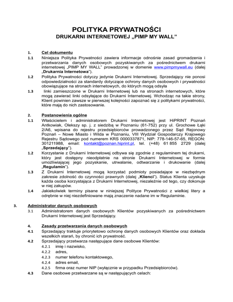 POLITYKA PRYWATNOŚCI DRUKARNI INTERNETOWEJ „PIMP MY WALL” 1. 1.1 1.2 1.3 2. 1.1 1.2 1.3 1.4 3. Cel dokumentu Niniejsza Polityka Prywatności zawiera informacje odnośnie zasad gromadzenia i przetwarzania danych osobowych pozyskiwanych za pośrednictwem drukarni internetowej „PIMP MY WALL” prowadzonej w domenie www.pimpmywall.eu (dalej „Drukarnia Internetowa”). Polityka Prywatności dotyczy jedynie Drukarni Internetowej. Sprzedający nie ponosi odpowiedzialności za standardy dotyczące ochrony danych osobowych i prywatności obowiązujące na stronach internetowych, do których mogą odsyła linki zamieszczone w Drukarni Internetowej lub na stronach internetowych, które mogą zawierać linki odsyłające do Drukarni Internetowej. Wchodząc na takie strony, Klient powinien zawsze w pierwszej kolejności zapoznać się z politykami prywatności, które mają do nich zastosowanie. Postanowienia ogólne Właścicielem i administratorem Drukarni Internetowej jest HiPRINT Poznań Antkowiak, Olekszy sp. j. z siedzibą w Poznaniu (61-752) przy ul. Grochowe Łąki 2/A6, wpisana do rejestru przedsiębiorców prowadzonego przez Sąd Rejonowy Poznań – Nowe Miasto i Wilda w Poznaniu, VIII Wydział Gospodarczy Krajowego Rejestru Sądowego pod numerem KRS 0000337871, NIP: 778-146-57-65, REGON: 301211988, email: [email protected], tel. (+48) 61 855 2729 (dalej „Sprzedający”). Korzystanie z Drukarni Internetowej odbywa się zgodnie z regulaminem tej drukarni, który jest dostępny nieodpłatnie na stronie Drukarni Internetowej w formie umożliwiającej jego pozyskanie, utrwalanie, odtwarzanie i drukowanie (dalej „Regulamin”). Z Drukarni Internetowej mogą korzystać podmioty posiadające w niezbędnym zakresie zdolność do czynności prawnych (dalej „Klienci”). Status Klienta uzyskuje każda osoba korzystająca z Drukarni Internetowej, niezależnie od tego, czy dokonuje w niej zakupów. Jakiekolwiek terminy pisane w niniejszej Polityce Prywatności z wielkiej litery a odrębnie w niej niezdefiniowane mają znaczenie nadane im w Regulaminie. Administrator danych osobowych 3.1 Administratorem danych osobowych Klientów pozyskiwanych za pośrednictwem Drukarni Internetowej jest Sprzedający. 4. 4.1 4.2 4.3 Zasady przetwarzania danych osobowych Sprzedający traktuje priorytetowo ochronę danych osobowych Klientów oraz dokłada wszelkich starań, by chronić ich prywatność. Sprzedający przetwarza następujące dane osobowe Klientów: 4.2.1 imię i nazwisko, 4.2.2 adres, 4.2.3 numer telefonu kontaktowego, 4.2.4 adres email, 4.2.5 firma oraz numer NIP (wyłącznie w przypadku Przedsiębiorców). Dane osobowe przetwarzane są w następujących celach: 4.3.1 zawieranie, wykonywanie i rozwiązywanie Umów dotyczących Towarów dostępnych w asortymencie Drukarni Internetowej, w tym rozpatrywanie reklamacji, 4.3.2 świadczenie Usług drogą elektroniczną oraz zawieranie i rozwiązywanie umów z tym związanych, 4.3.3 marketing własnych produktów i usług Sprzedającego. 4.4 Dane osobowe są zbierane od Klientów w ramach Procesu Rejestracji, mającego na celu założenie Konta w Drukarni Internetowej lub w trakcie procesu składania Zamówienia, jeżeli Klienci dokonują zakupów w Drukarni Internetowej nie zakładając Konta. Dane osobowe mogą być również zbierane w przypadku, gdy Klient kontaktuje się ze Sprzedającym za pośrednictwem formularza kontaktowego dostępnego na stronie Drukarni Internetowej, poczty elektronicznej lub telefonu. 4.5 Klient podaje swoje dane osobowe dobrowolnie. Jednakże odmowa podania tych danych może uniemożliwić zawarcie i wykonanie Umowy jak również świadczenie niektórych Usług. 4.6 Klient ma prawo dostępu do treści swoich danych osobowych i ich poprawiania oraz prawo żądania zaprzestania przetwarzania danych lub wniesienia sprzeciwu wobec ich przetwarzania w celach marketingowych na zasadach określonych obowiązującymi przepisami prawa. 4.7 Sprzedający może przekazywać dane osobowe Klientów: 4.7.1 firmom kurierskim, z którymi współpracuje takim jak UPS – w celu realizacji dostaw Towarów i w niezbędnym do tego zakresie, 4.7.2 operatorom serwisów rozliczeniowych, z którymi współpracuje takim jak PayU S.A. z siedzibą w Poznaniu lub DotPay S.A. z siedzibą w Krakowie – w celu realizacji płatności on-line i w niezbędnym do tego zakresie, 4.8 Sprzedający przetwarza dane osobowe Klientów zgodnie z obowiązującymi przepisami prawa, w tym w szczególności zgodnie z przepisami ustawy z dnia 29 sierpnia 1997 roku o ochronie danych osobowych (tekst jednolity: Dz. U. z 2002 roku, nr 101, poz. 926 z późń. zm.) i przepisami wykonawczymi do tej ustawy. 4.9 Sprzedający stosuje zabezpieczenia i środki niezbędne, by chronić dane osobowe Klientów przed nieautoryzowanym ujawnieniem, wykorzystaniem, zmianą lub zniszczeniem. 5 Postanowienia końcowe 5.1 Sprzedający zastrzega sobie prawo do wprowadzenia zmian w niniejszej Polityce Prywatności. 5.2 Niniejsza Polityka Prywatności została ostatnio zaktualizowana w dniu 14.12.2015.
