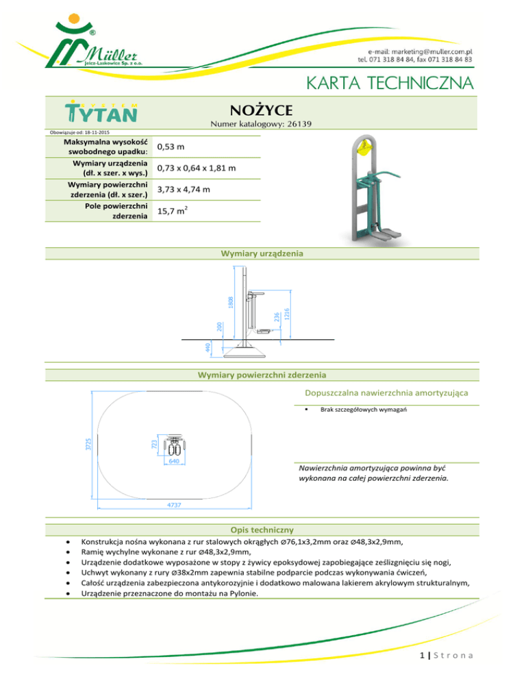 NOŻYCE Numer katalogowy: 26139 Obowiązuje od: 18-11-2015 Maksymalna wysokość swobodnego upadku: Wymiary urządzenia (dł. x szer. x wys.) Wymiary powierzchni zderzenia (dł. x szer.) Pole powierzchni zderzenia 0,53 m 0,73 x 0,64 x 1,81 m 3,73 x 4,74 m 15,7 m2 1216 440 200 236 1808 Wymiary urządzenia Wymiary powierzchni zderzenia Dopuszczalna nawierzchnia amortyzująca Brak szczegółowych wymagań 723 3725 640 Nawierzchnia amortyzująca powinna być wykonana na całej powierzchni zderzenia. 4737 Opis techniczny Konstrukcja nośna wykonana z rur stalowych okrągłych ø76,1x3,2mm oraz ø48,3x2,9mm, Ramię wychylne wykonane z rur ø48,3x2,9mm, Urządzenie dodatkowe wyposażone w stopy z żywicy epoksydowej zapobiegające ześlizgnięciu się nogi, Uchwyt wykonany z rury ø38x2mm zapewnia stabilne podparcie podczas wykonywania ćwiczeń, Całość urządzenia zabezpieczona antykorozyjnie i dodatkowo malowana lakierem akrylowym strukturalnym, Urządzenie przeznaczone do montażu na Pylonie. 1|Strona Ćwiczenia na urządzeniu ukierunkowane głównie na trening cardio – aerobowy i siłowo – obwodowy zapewniający wzmocnienie mięśni bez powiększania ich objętości. Trening na tym urządzeniu ujędrnia ciało i wzmacnia układ mięśniowo – stawowy jak również przyczynia się do poprawy kondycji fizycznej i figury. Główne mięśnie zaangażowane podczas ćwiczeń: Nogi – mięśnie nóg (mięsień przywodziciel wielki, przywodziciel długi, grzebieniowy) Biodra – mięśnie pośladkowe (mięśnie pośladkowe wielkie i średnie) Opis ćwiczenia Stań na urządzeniu i trzymając się rączek staraj się odwieść od siebie maksymalnie uda. Czynność powtarzaj wielokrotnie. Wykonywanie ćwiczenia Wejdź na urządzenie i chwyć rączki przednie. Nogi postaw na stopnicach. Trzymając się chwytu przedniego odwodź od siebie uda maksymalnie na zewnątrz. Ruch na zewnątrz oraz powrotny do środka wykonuj pod pełna kontrolą. Podczas całego ćwiczenia utrzymuj proste plecy (nie garbiąc sylwetki). Staraj się panować nad ćwiczeniem kontrolując stałe napięcie mięśni podczas ich pracy. 2|Strona