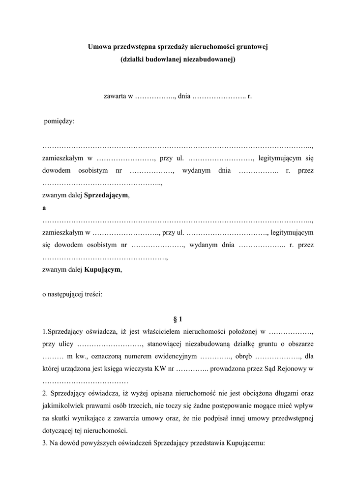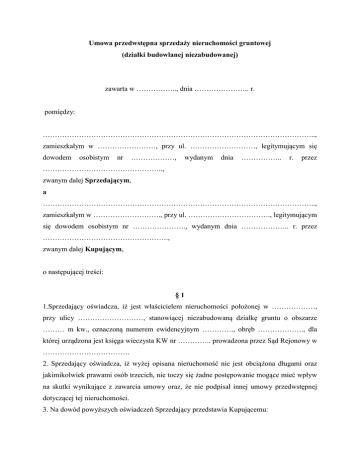Umowa przedwstępna sprzedaży nieruchomości gruntowej (działki budowlanej niezabudowanej) zawarta w …………….., dnia ………………….. r. pomiędzy: ………………………………………………………………………………………………….., zamieszkałym w ……………………, przy ul. ………………………, legitymującym się dowodem osobistym nr ………………, wydanym dnia …………….. r. przez ………………………………………….., zwanym dalej Sprzedającym, a ………………………………………………………………………………………………….., zamieszkałym w ………………………., przy ul. ……………………………., legitymującym się dowodem osobistym nr …………………., wydanym dnia ……………….. r. przez ……………………………………………., zwanym dalej Kupującym, o następującej treści: §1 1.Sprzedający oświadcza, iż jest właścicielem nieruchomości położonej w ………………, przy ulicy ………………………, stanowiącej niezabudowaną działkę gruntu o obszarze ……… m kw., oznaczoną numerem ewidencyjnym …………., obręb ………………., dla której urządzona jest księga wieczysta KW nr ………….. prowadzona przez Sąd Rejonowy w ……………………………… 2. Sprzedający oświadcza, iż wyżej opisana nieruchomość nie jest obciążona długami oraz jakimikolwiek prawami osób trzecich, nie toczy się żadne postępowanie mogące mieć wpływ na skutki wynikające z zawarcia umowy oraz, że nie podpisał innej umowy przedwstępnej dotyczącej tej nieruchomości. 3. Na dowód powyższych oświadczeń Sprzedający przedstawia Kupującemu: a) wypis i wyrys z ewidencji gruntów wydany w dniu ………………… r. przez ………………………., dotyczący działki nr ewidencyjny ………………….., obręb ……………………………………., b) wypis z księgi wieczystej KW Nr …………… wydany w dniu …………………. r. przez Sąd Rejonowy w……………………………. §2 1. Sprzedający zapewnia, że opisana nieruchomość jest przeznaczona w miejscowym planie zagospodarowania przestrzennego pod budownictwo jednorodzinne i ma dostęp do drogi publicznej, w której znajdują się następujące sieci uzbrojenia terenu: ………………………… …………………………………………………………………………………………………... 2. Na dowód powyższego oświadczenia Sprzedający przedstawia Kupującemu wypis i wyrys z miejscowego planu zagospodarowania przestrzennego. §3 Sprzedający oświadcza, iż zobowiązuje się sprzedać własność nieruchomości opisanej w § 1 niniejszej umowy za cenę ……………………… zł (słownie: ……………………złotych), a Kupujący zobowiązuje się tę nieruchomość kupić za podaną cenę. §4 1. Kupujący zobowiązuje się złożyć wniosek o wydanie decyzji o warunkach zabudowy i zagospodarowania terenu niezwłocznie po zawarciu umowy przedwstępnej. 2. Strony zobowiązują się zawrzeć przyrzeczoną umowę sprzedaży w formie aktu notarialnego w terminie do …….. dni od uzyskania przez Kupującego decyzji o warunkach zabudowy i zagospodarowania terenu. 3. Koszty związane z zawarciem aktu notarialnego przenoszącego prawo do nieruchomości poniesie Kupujący. §5 1. Na poczet przyszłej umowy sprzedaży Kupujący wręcza Sprzedającemu zadatek w wysokości …………………… zł (słownie: …………………………….. złotych), co Sprzedający niniejszym kwituje. W razie niewykonania umowy przez kupującego Sprzedający zatrzymuje zadatek w pełnej kwocie. 2. W razie niewykonania umowy przez sprzedającego Kupujący ma prawo do kwoty stanowiącej dwukrotność zadatku. 3. W przypadku otrzymania przez Kupującego decyzji odmawiającej ustalenia warunków zabudowy i zagospodarowania terenu dla inwestycji, polegającej na budowie budynku mieszkalnego na nieruchomości jak w § 1 lub nie uzyskania decyzji ostatecznej ustalającej warunki zabudowy w ciągu trzech miesięcy od zawarcia umowy przedwstępnej, niniejsza umowa ulega rozwiązaniu, zaś zadatek podlega zwrotowi. §6 Wydanie przedmiotu tej umowy nastąpi po uregulowaniu całości kwoty wymienionej w § 3. §7 Sprzedający zobowiązuje się do dnia zawarcia umowy przyrzeczonej dostarczyć Kupującym: 1) zaświadczenie z Urzędu Skarbowego o nie zaleganiu z podatkami, 2) zaświadczenie o zapłaceniu podatku od nieruchomości. §8 Koszty sporządzenia notarialnej umowy sprzedaży i podatku od czynności cywilnoprawnych poniosą Kupujący. §9 Wszelkie zmiany niniejszej umowy wymagają zachowania formy pisemnej pod rygorem nieważności. § 10 W sprawach nieuregulowanych niniejszą umową będą miały zastosowanie przepisy Kodeksu cywilnego i Ustawy o gospodarce nieruchomościami. § 11 Spory wynikłe z niniejszej umowy będą rozpatrywane przez sąd powszechny odpowiedni dla miejsca zamieszkania Sprzedającego. § 12 Umowę sporządzono w dwóch jednobrzmiących egzemplarzach, po jednym dla każdej ze stron. ………………………………….. Sprzedający ………………………………… Kupujący