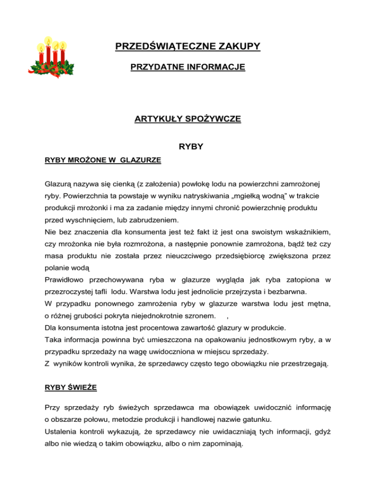 PRZEDŚWIĄTECZNE ZAKUPY PRZYDATNE INFORMACJE ARTYKUŁY SPOŻYWCZE RYBY RYBY MROŻONE W GLAZURZE Glazurą nazywa się cienką (z założenia) powłokę lodu na powierzchni zamrożonej ryby. Powierzchnia ta powstaje w wyniku natryskiwania „mgiełką wodną” w trakcie produkcji mrożonki i ma za zadanie między innymi chronić powierzchnię produktu przed wyschnięciem, lub zabrudzeniem. Nie bez znaczenia dla konsumenta jest też fakt iż jest ona swoistym wskaźnikiem, czy mrożonka nie była rozmrożona, a następnie ponownie zamrożona, bądź też czy masa produktu nie została przez nieuczciwego przedsiębiorcę zwiększona przez polanie wodą Prawidłowo przechowywana ryba w glazurze wygląda jak ryba zatopiona w przezroczystej tafli lodu. Warstwa lodu jest jednolicie przejrzysta i bezbarwna. W przypadku ponownego zamrożenia ryby w glazurze warstwa lodu jest mętna, o różnej grubości pokryta niejednokrotnie szronem. , Dla konsumenta istotna jest procentowa zawartość glazury w produkcie. Taka informacja powinna być umieszczona na opakowaniu jednostkowym ryby, a w przypadku sprzedaży na wagę uwidoczniona w miejscu sprzedaży. Z wyników kontroli wynika, że sprzedawcy często tego obowiązku nie przestrzegają. RYBY ŚWIEŻE Przy sprzedaży ryb świeżych sprzedawca ma obowiązek uwidocznić informację o obszarze połowu, metodzie produkcji i handlowej nazwie gatunku. Ustalenia kontroli wykazują, że sprzedawcy nie uwidaczniają tych informacji, gdyż albo nie wiedzą o takim obowiązku, albo o nim zapominają. Ryba maślana Podobnie wygląda sytuacja z informacjami wymaganymi w przypadku sprzedaży ryby maślanej. Ryba maślana to handlowe określenie używane w odniesieniu do kilku różnych gatunków ryb importowanych charakteryzujących się wysoką zawartością oleju. Głównym składnikiem oleju dwóch gatunków ryb deklarowanych jako ryba maślana, tj. eskolar (Lepidocybium flavobrunneum) – ang. escolar i kostropak (Ruvettus pretiosus ) – ang. oilfish, są niestrawialne woski (>90%). Z tego powodu konsumpcja tych ryb może wiązać się z wystąpieniem zaburzeń układu pokarmowego, dlatego też: NA KAŻDYM OPAKOWANIU POWINNA BYĆ UMIESZCZONA: ● nazwa naukowa (np. Ruvettus pretiosus), ● nazwa zwyczajowa (kostropak), ● informacja dotycząca sposobu przygotowania/gotowania produktu, ● informacje o ryzyku związanym z obecnością substancji wpływających szkodliwie na przewód pokarmowy. PRZETWORY MIĘSNE Przy sprzedaży przetworów mięsnych oferowanych luzem („na wagę” ) sprzedawca ma obowiązek (o czym nie wszyscy konsumenci wiedzą) uwidocznić informację o składzie wędlin tj. informację o zawartości składnika lub kategorii składników w momencie ich użycia w procesie produkcyjnym np. mięsa wołowego, cielęcego czy też drobiowego, przypraw, substancji dodatkowych dozwolonych. Z powodu braku takich danych. w II kw. bieżącego roku względem, zakwestionowano 35 partii (32,4% badanych w tym zakresie) . MIÓD W zależności od surowca, z jakiego powstał miód, wyróżniamy miody: - nektarowy wielokwiatowy (pochodzący z nektaru wielu roślin), - nektarowy lipowy, nektarowy gryczany, nektarowy akacjowy itd. (określany nazwą rośliny, której procentowa zawartość pyłku w miodzie występuje w znacznej przewadze), - spadziowy ze spadzi iglastej (z wydalin owadów ssących soki drzew iglastych), - spadziowy ze spadzi liściastej (z wydalin owadów ssących soki drzew liściastych). Miód może mieć konsystencję gęstego płynu lub stałą, a barwę od białej, poprzez jasnożółtą aż do brunatnobrązowej. Miodu nie należy gotować ani mocno podgrzewać, gdyż już w temperaturze 50 0C słabnie działanie większości enzymów. Wady wykryte przez kontrolerów mogą świadczyć o fałszowaniu miodu lub podgrzewaniu w zbyt wysokiej temperaturze, czy też przechowywaniu przez długi okres w nieodpowiednich warunkach, np. na słońcu lub w zbyt wysokiej temperaturze. RADY Dokonując zakupów artykułów spożywczych konsumenci powinni zwracać przede wszystkim uwagę na oznaczenia znajdujące się na opakowaniach środków spożywczych bądź informacje uwidocznione przy towarach i tak: Opakowany środek spożywczy znakuje się podając, co najmniej następujące informacje: nazwę środka spożywczego; wykaz składników występujących w środku spożywczym; datę minimalnej trwałości albo termin przydatności do spożycia; sposób przygotowania lub stosowania, jeżeli brak tej informacji mógłby spowodować niewłaściwe postępowanie ze środkiem spożywczym; dane identyfikujące producenta bądź paczkującego bądź wprowadzającego dany środek do obrotu zawartość netto lub liczbę sztuk opakowanego środka spożywczego; warunki przechowywania, jeżeli oznakowanie środka spożywczego zawiera informację o terminie przydatności do spożycia oraz w przypadku, gdy jakość środka spożywczego w istotny sposób zależy od warunków jego przechowywania; oznaczenie partii produkcyjnej rozumianej jako określona ilość środka spożywczego wyprodukowanego, przetworzonego lub zapakowanego w praktycznie takich samych warunkach; klasę jakości handlowej, jeżeli została ona ustalona KUPUJEMY PREZENTY KOSMETYKI Kosmetyki znajdujące się w sprzedaży powinny posiadać w oznakowaniu (na pojemniku i na opakowaniu zewnętrznym) następujące informacje: ● nazwa handlowa kosmetyku; ● imię i nazwisko lub nazwę i adres producenta/importera, dystrybutora, a także nazwę państwa, jeżeli kosmetyk jest produkowany poza terytorium RP i państw członkowskich UE; informacje te mogą być skrócone pod warunkiem, że umożliwiają identyfikację producenta; ● ilość nominalna kosmetyku w opakowaniu podawanie ilości nominalnej kosmetyku w opakowaniu nie dotyczy opakowań zawierających mniej niż 5 gramów lub 5 mililitrów, bezpłatnych osóbek i opakowań jednorazowego użytku ● termin trwałości, do którego kosmetyk, prz
